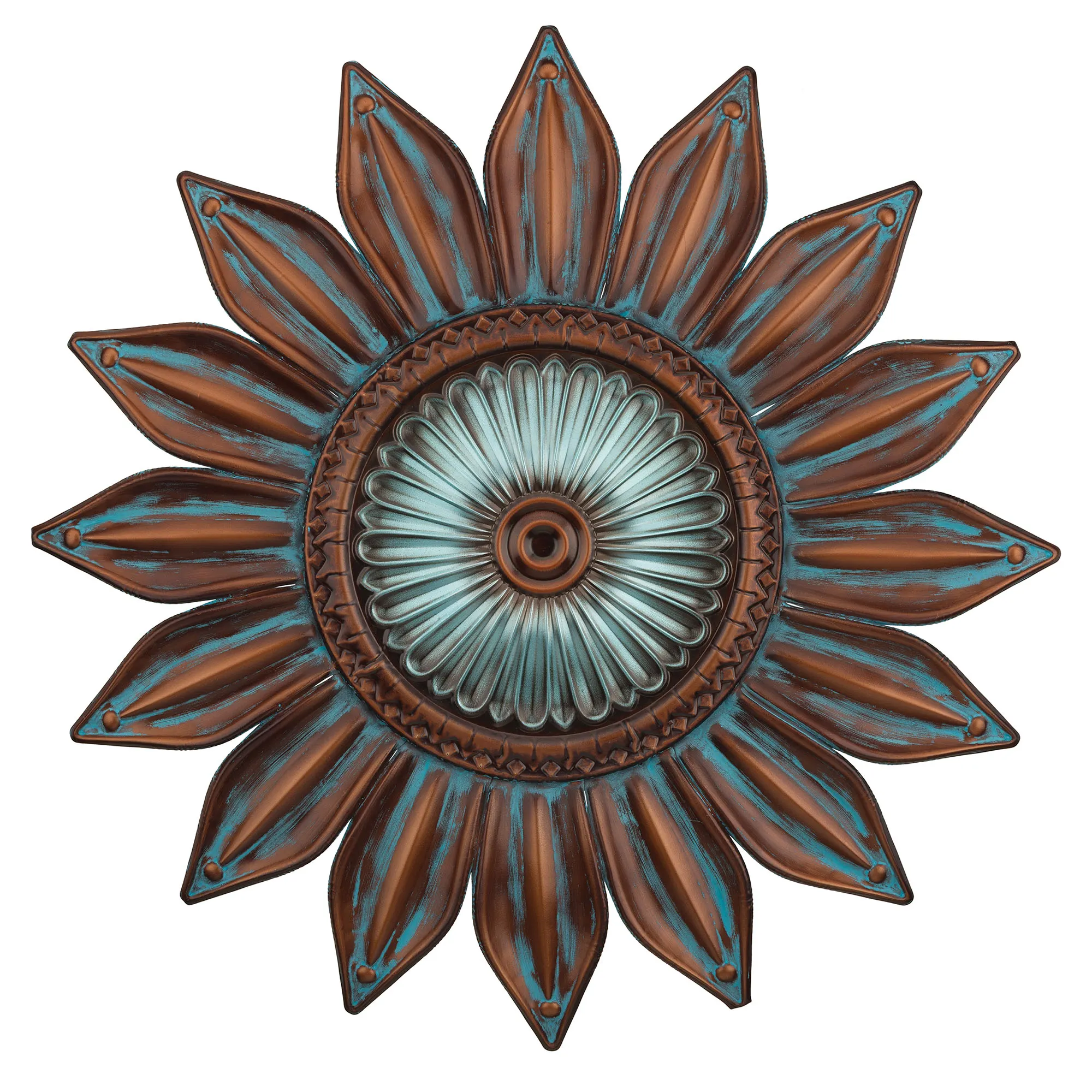 Stately fluting details the Regal Blossom Wall Sculpture for an inviting dimensional texture. Highlighted with a blue patina, the deep bronze-finished metal wall art resembles a grand flower or sun accented with dots, geometrics, and long fluting accents. The striking weather- and fade-resistant finish makes the wall decor perfect for your indoor or outdoor space. Measures 30"dia.x1.5"D.