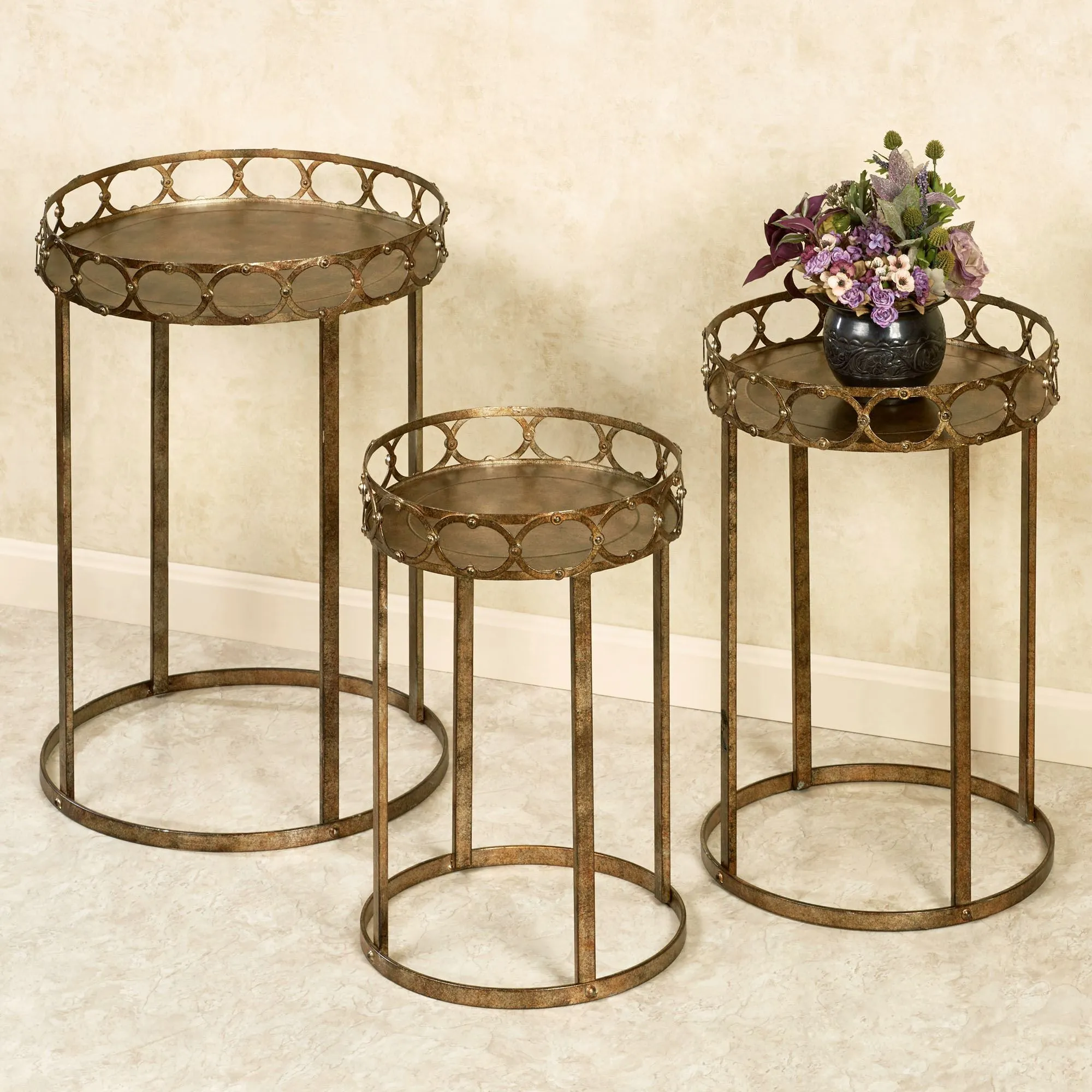 Interlocking ovals with aged silver stud accents inspire the look featured on the Regal Lux Round Nesting Table Set. Metal nesting tables have a dark gold finish with light red overtones and roomy display surfaces. Small is 13"dia.x20"H; medium is 15"dia.x22.5"H; large is 18.5"dia.x26"H.