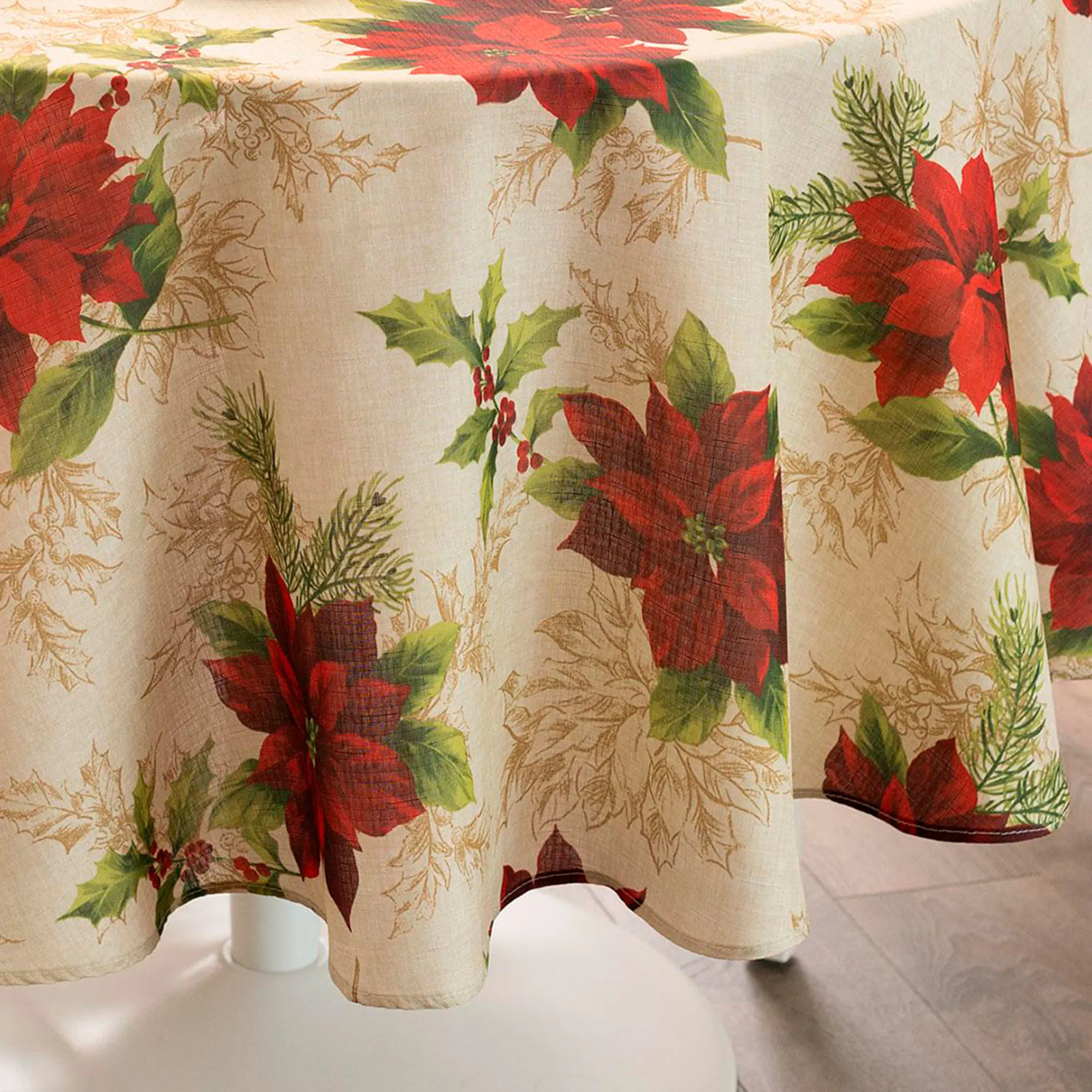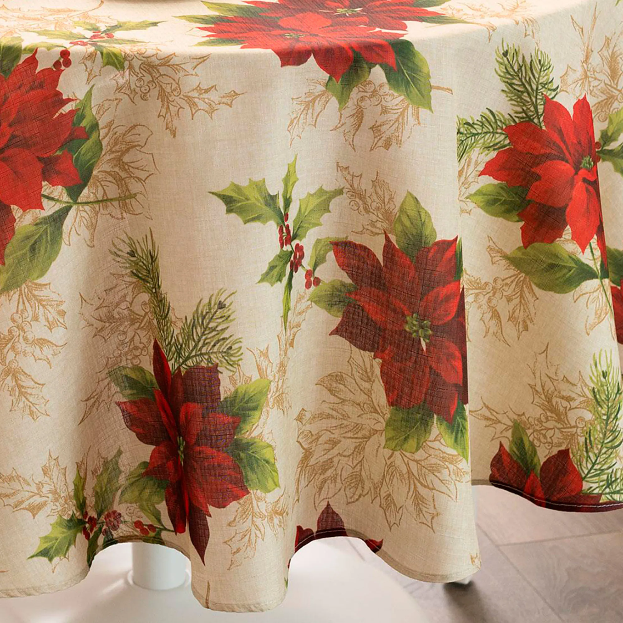 Scatterings of Regal Poinsettia blossoms make for a beautiful foundation for your holiday tablescape. Each beige polyester table linen features lovely red poinsettias, green pine boughs, green holly leaves, red berries, and dark beige holly motifs in a grand festive look. Tailored edges finish each element. Choose Round Tablecloth, Rectangle Tablecloth, Oval Tablecloth, or Napkin Set of 4. Machine washable. Imported.