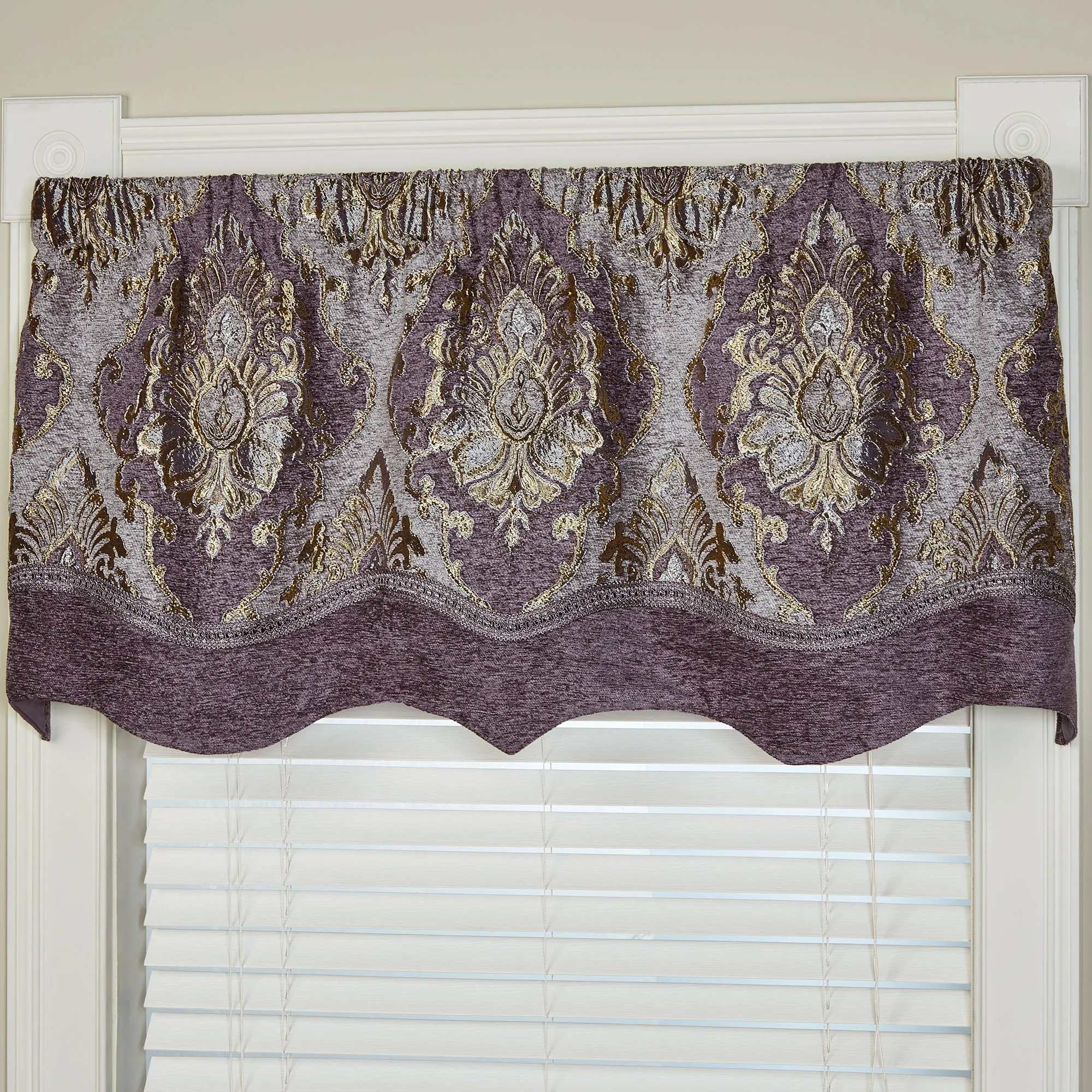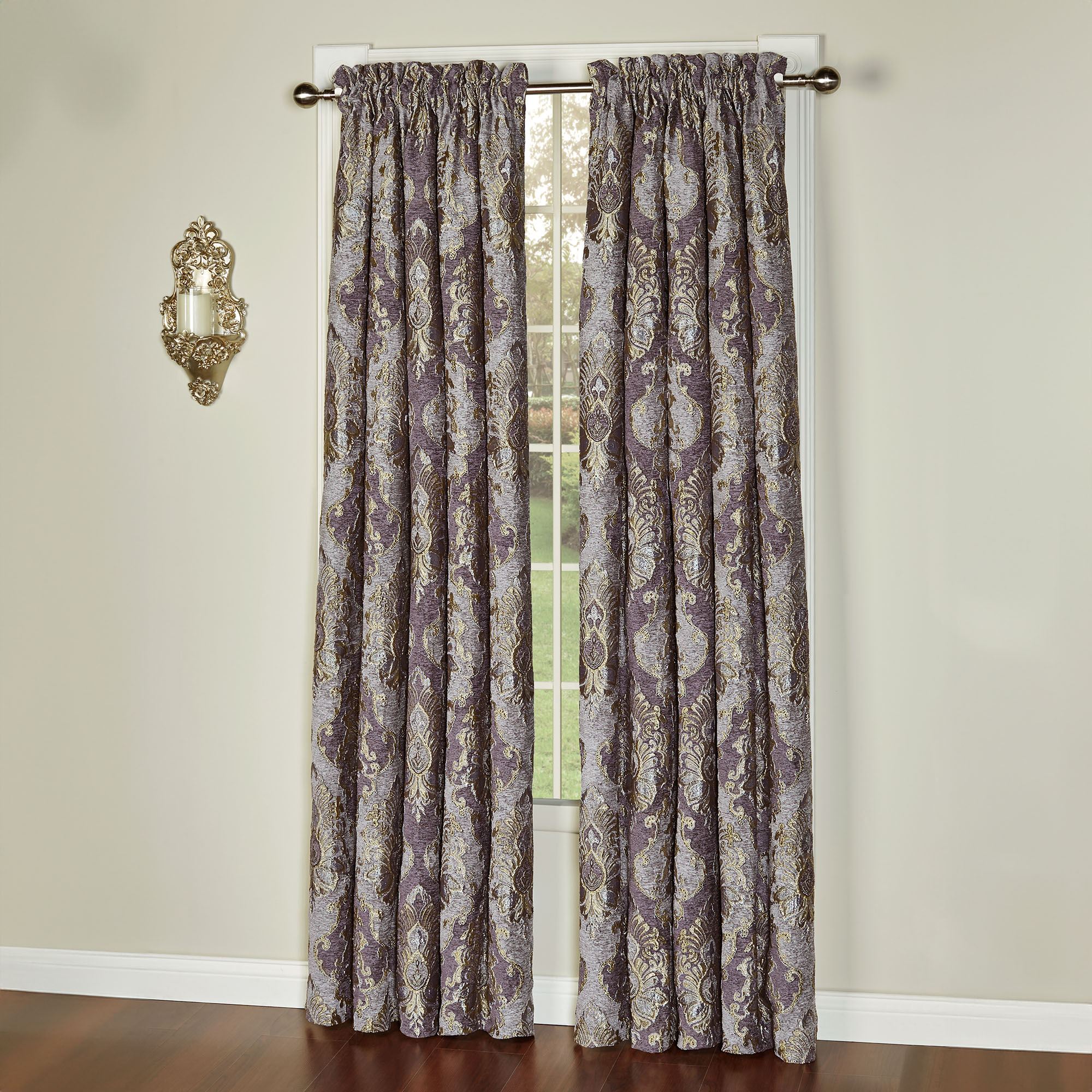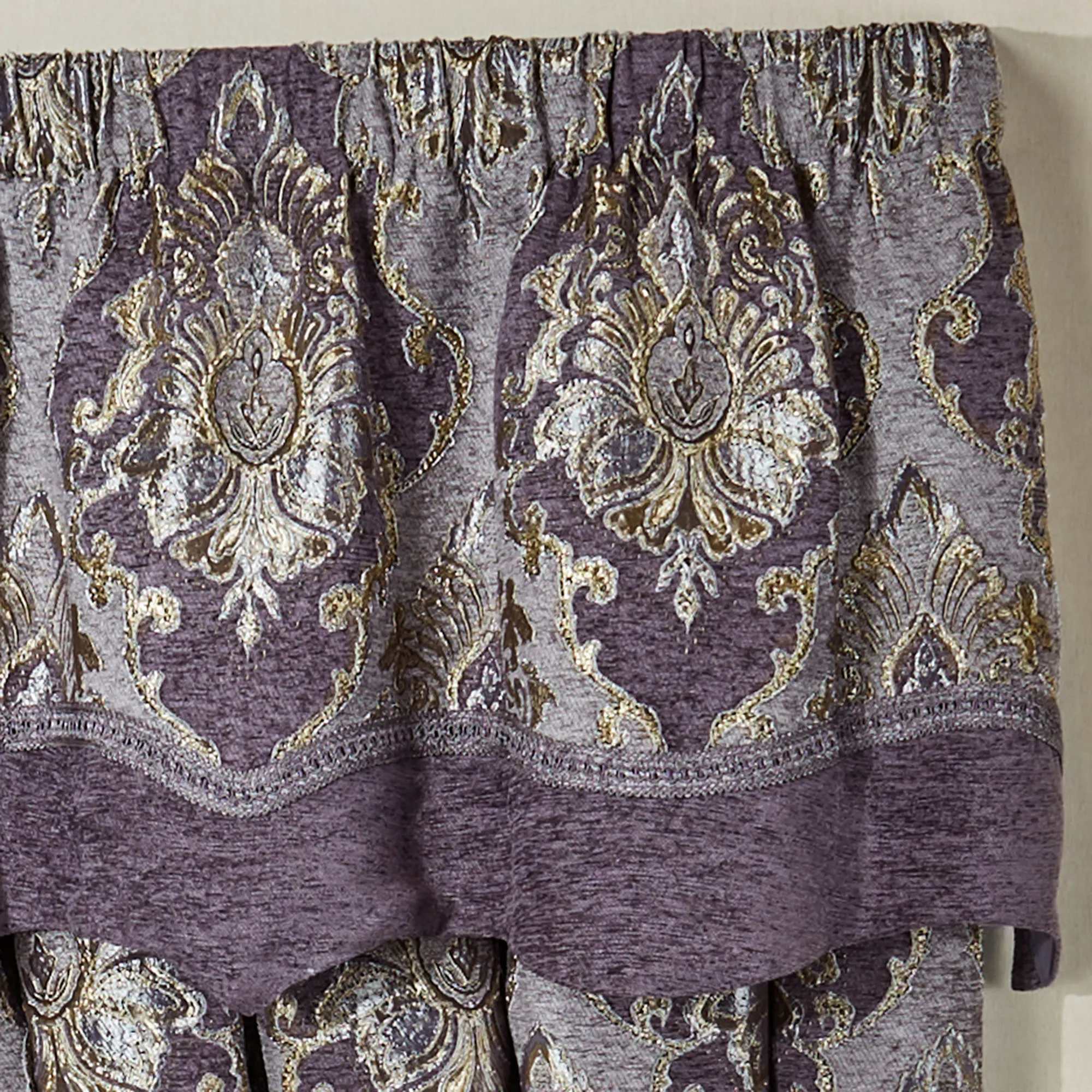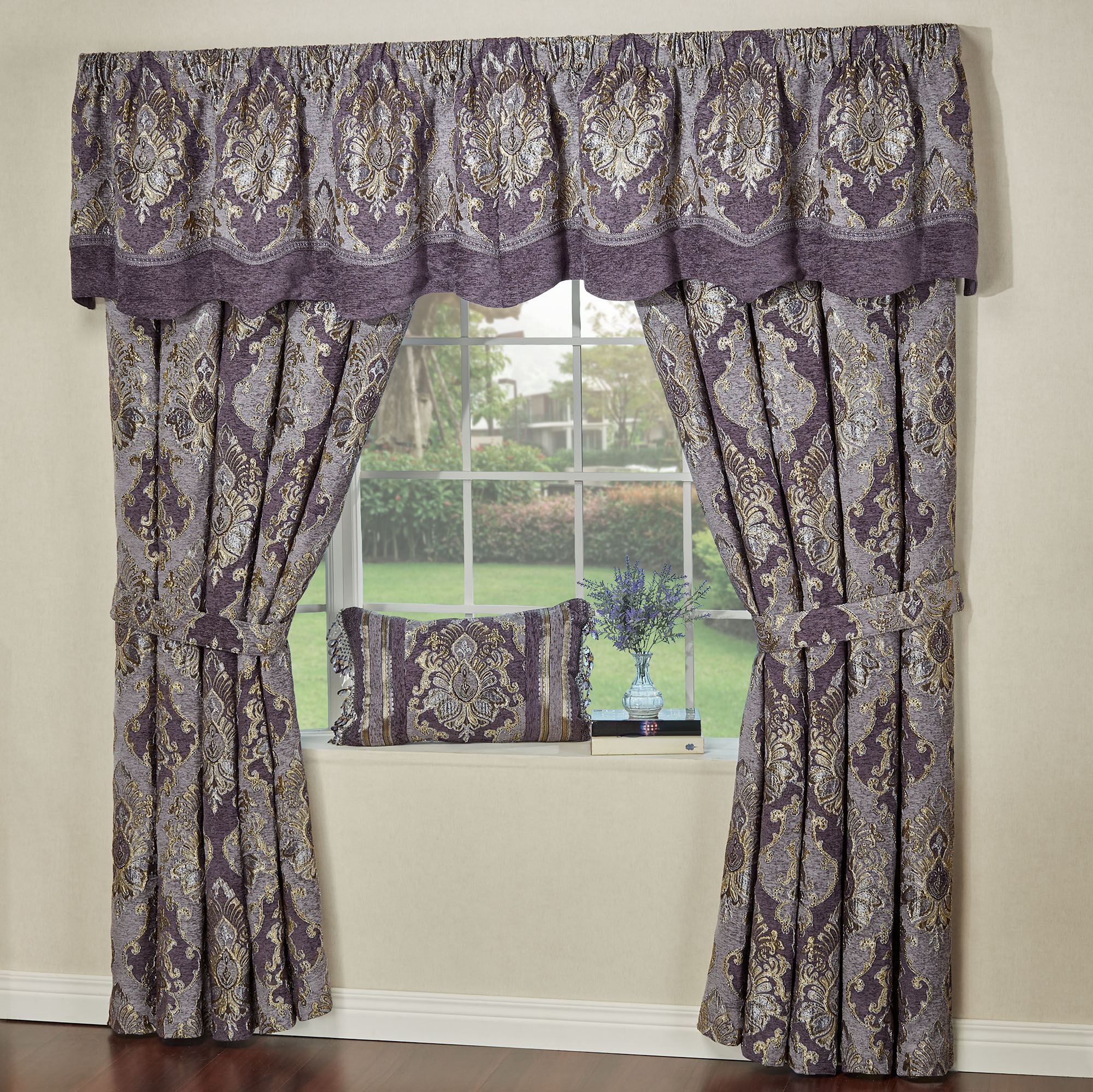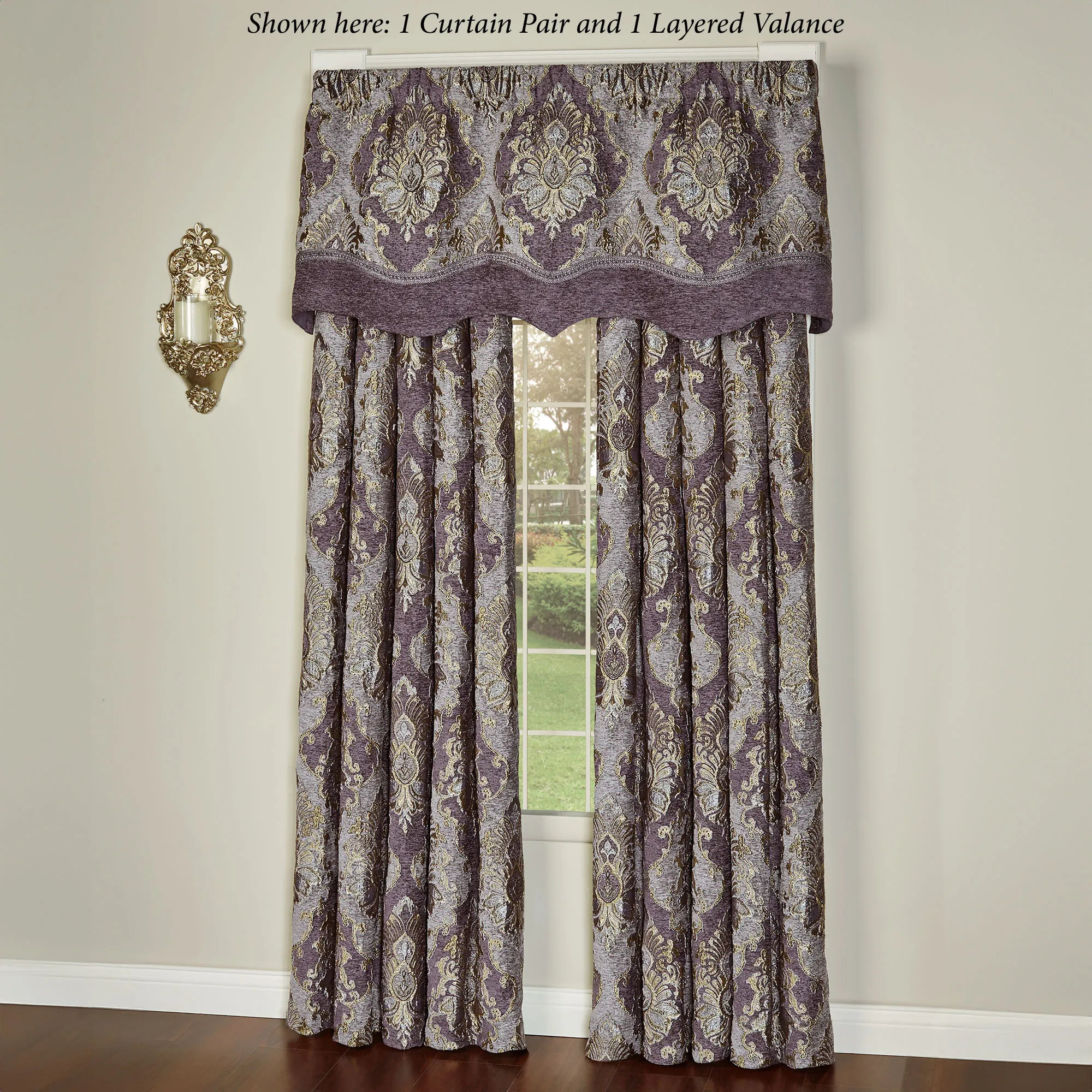 Define grand elegance with the stately Regalia Window Treatment. This sumptuous polyester window treatment features a woven-jacquard damask pattern along with gold and chenille accents. Colors include lavender, grape, and gold. Lined window treatment has 3" rod pockets. Specify Layered Valance or Wide Curtain Pair. The pieced Layered Valance has damask jacquard, gimp trim, and grape chenille. Wide Curtain Pair has tailored edges and includes tiebacks. Dry clean. Imported. The curtain pair width is the total width of two panels together.