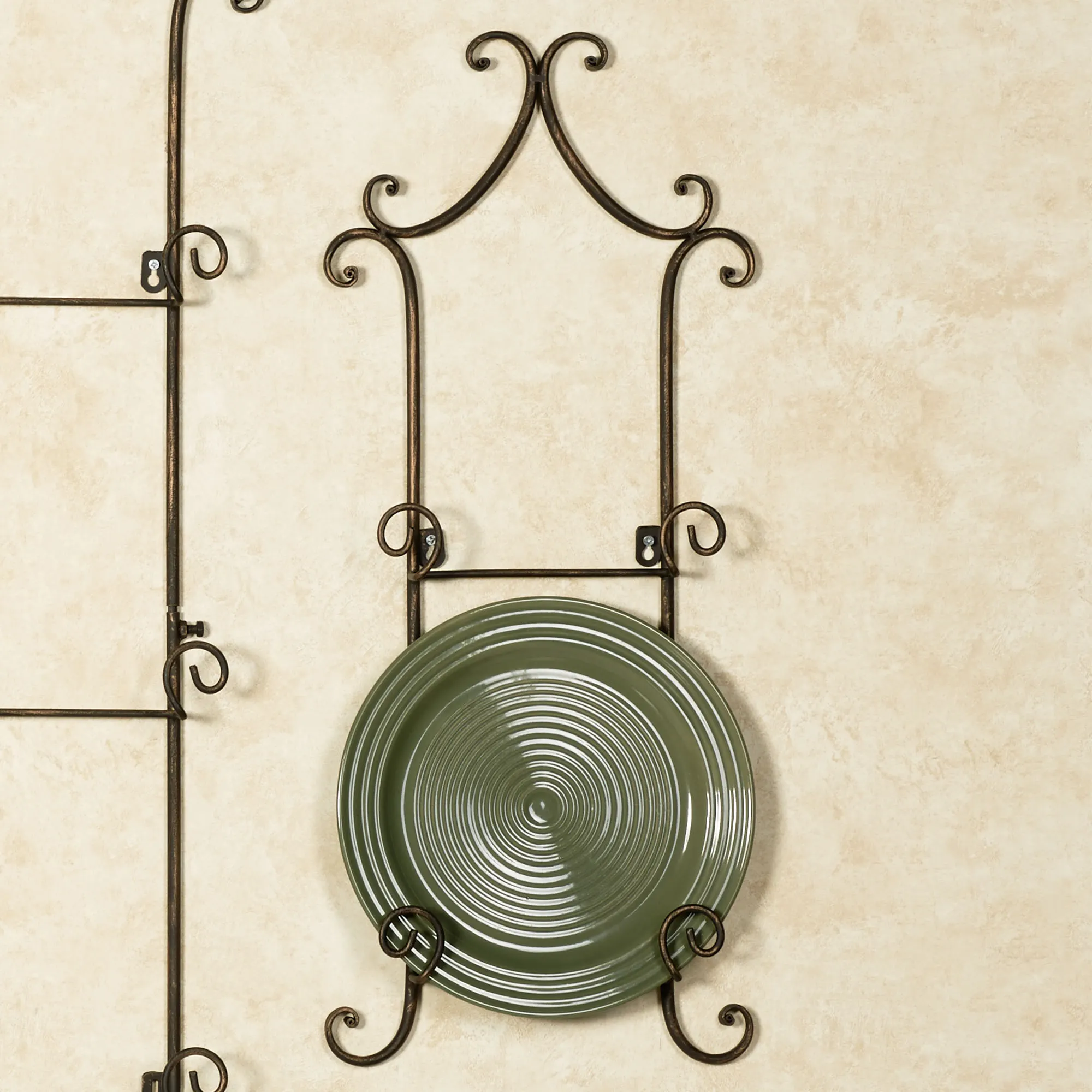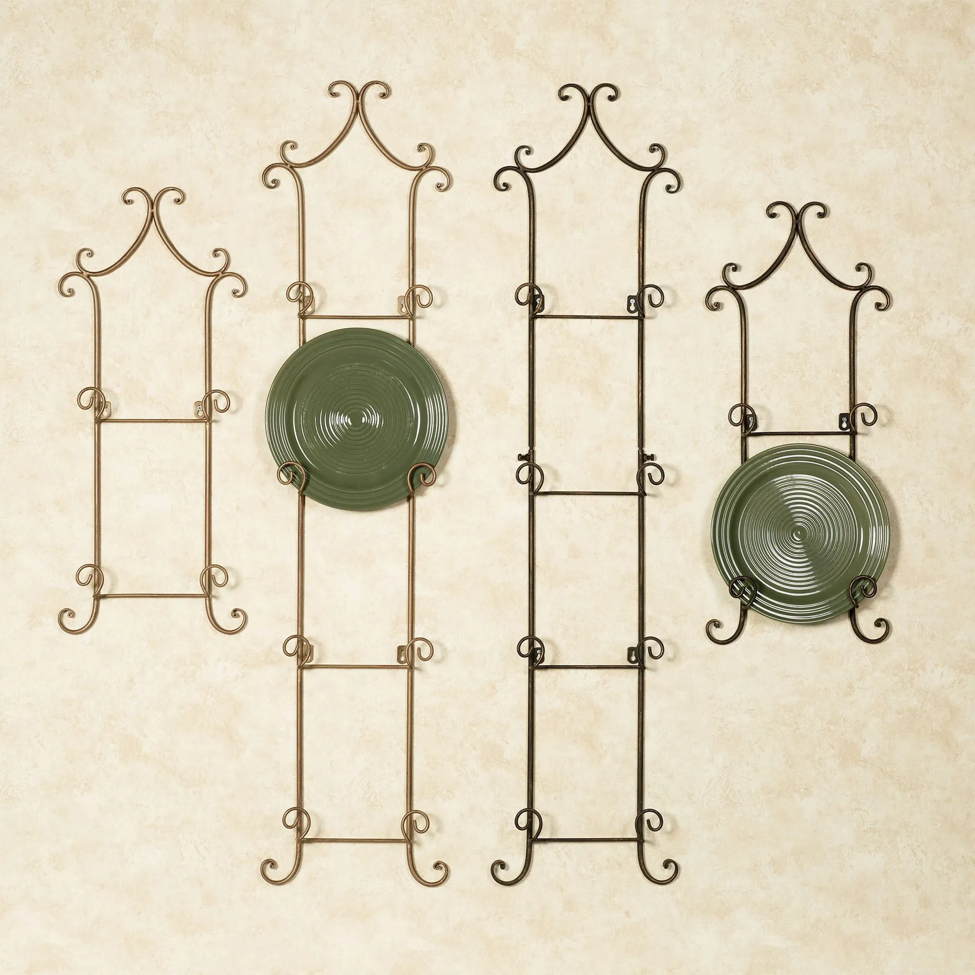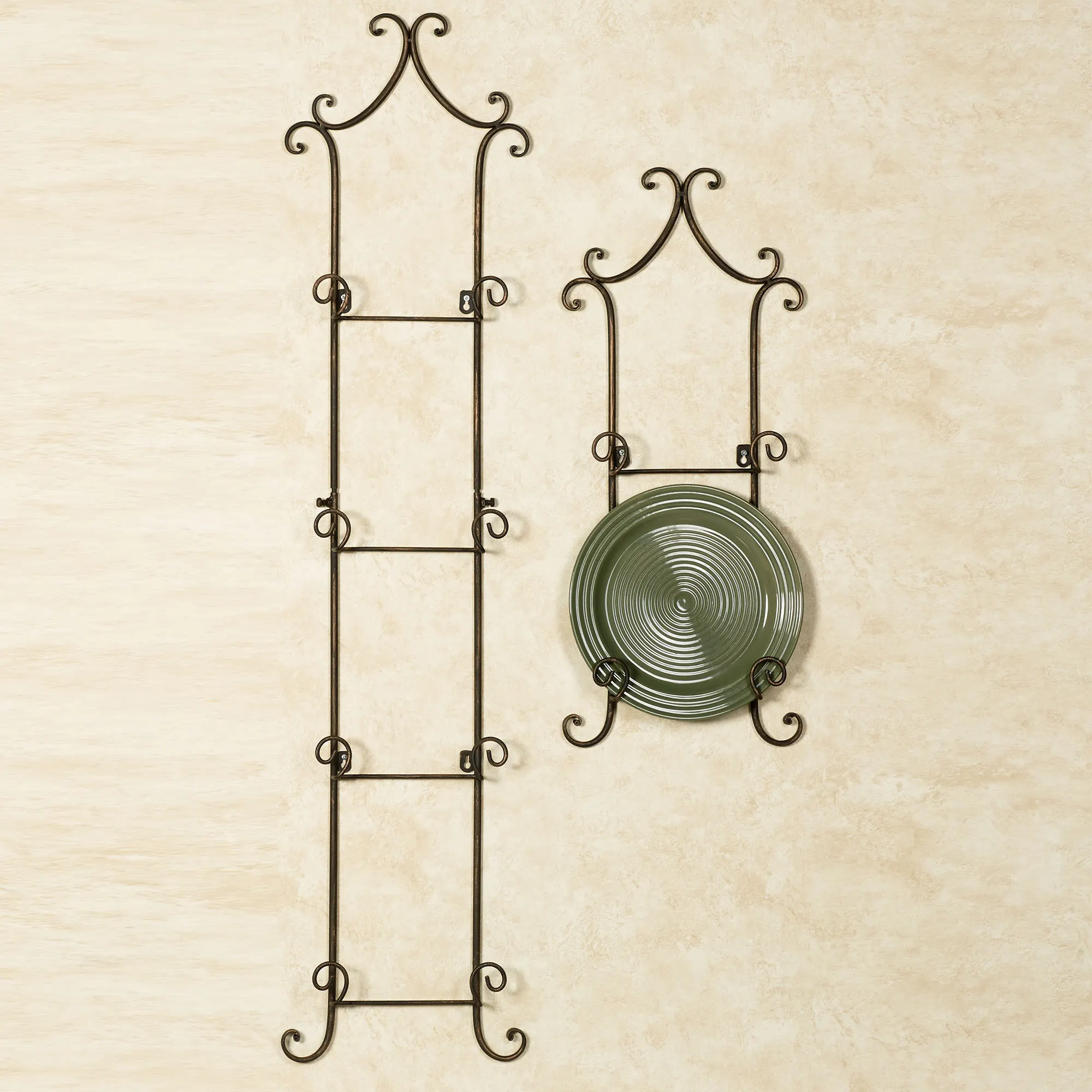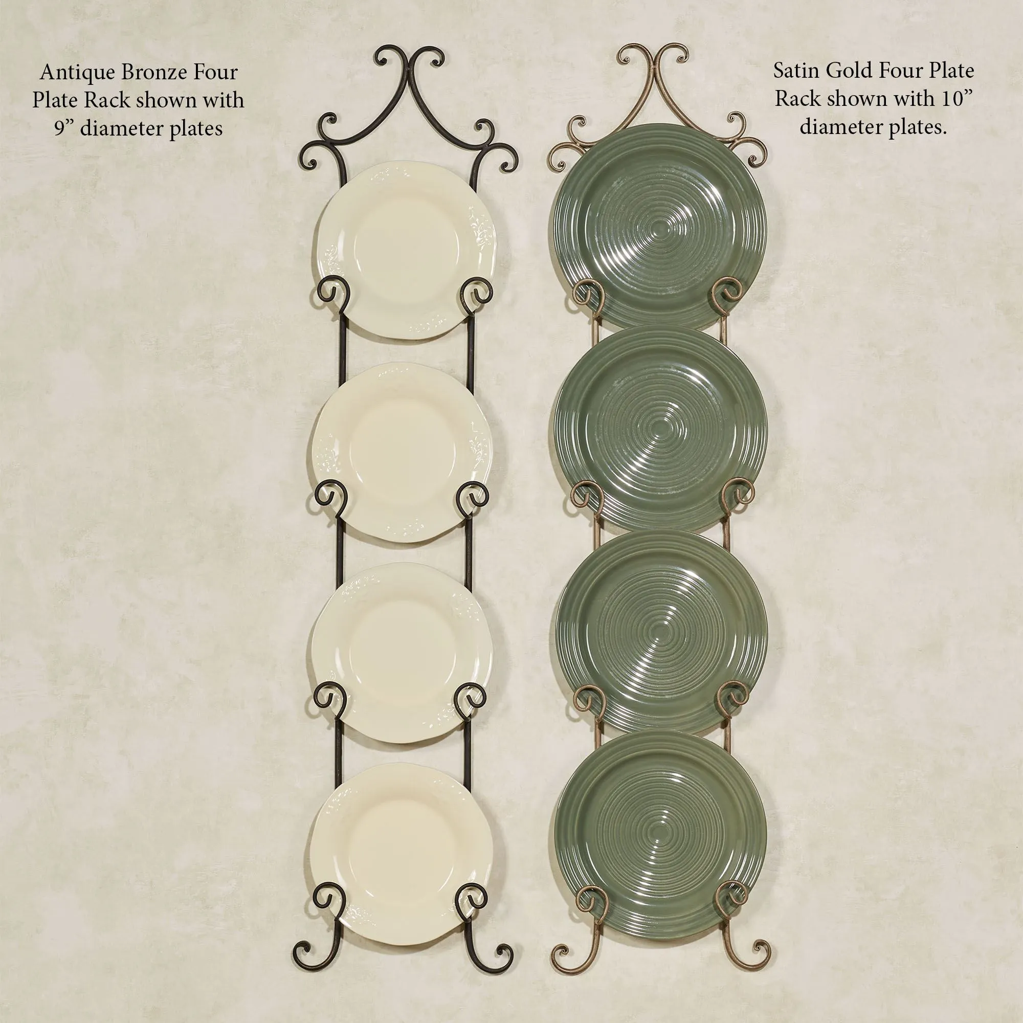 The simple scrolls upon the Regalla Plate Rack enhance the beauty of your decorative plates without distracting from their charm. Each handpainted and handcrafted metal rack holds two or four of your 9"-10" dia. plates, or square plates up to 9.5" sq. Overall, each vertical plate rack measures 11"Wx2"D. The 2-Plate Rack is 26"H. The 4-Plate Rack measures 46"H.
