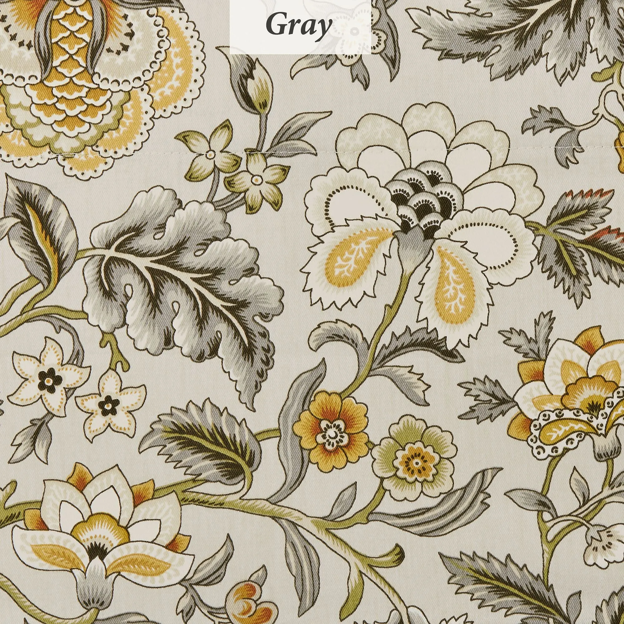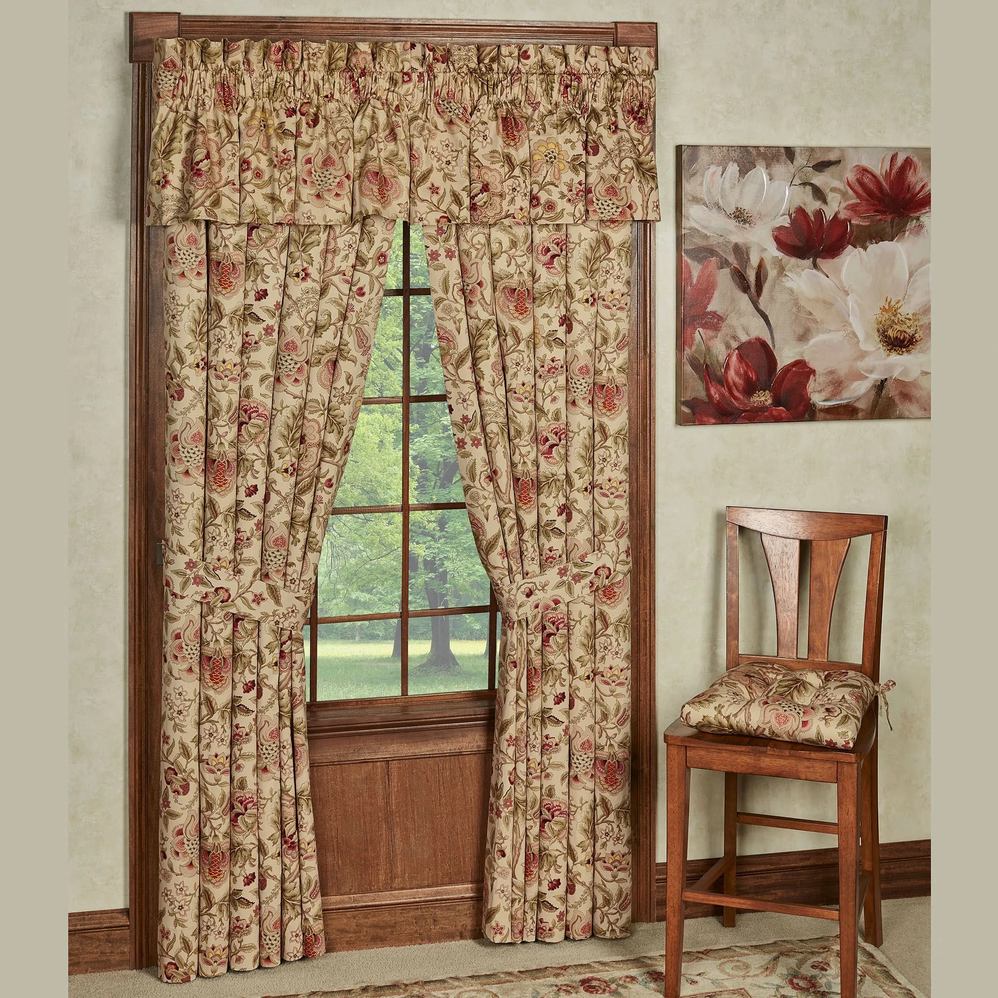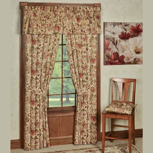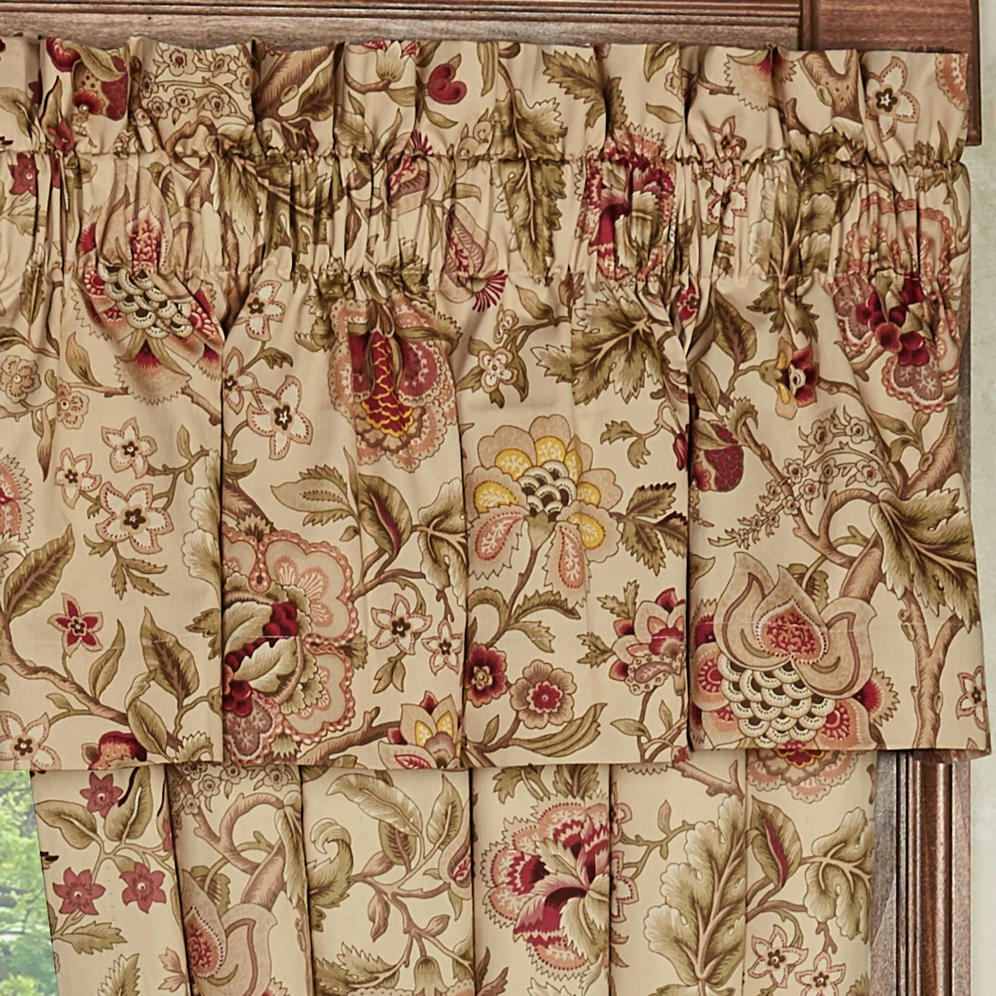 Enhance the look of your home with the pretty Jacobean floral pattern on the Regency Window Treatment by Waverly. The lined, cotton window treatment has printed designs and a 3" rod pocket. Straw has brown and burgundy on straw. Dark Blue has dark red, blue, green, and brown on dark blue. Gray has gray, moss, rust, golden yellow, cream, and beige on parchment. Light Cream has dark blue, tarragon, yellow, and white on light cream. Specify Curtain Pair, Tailored Valance, Duchess Swag Valance Pair, or Duchess Filler Valance; click on the Details and Sizes tabs for more information. Dry clean. The curtain pair width is the total width of two panels together.