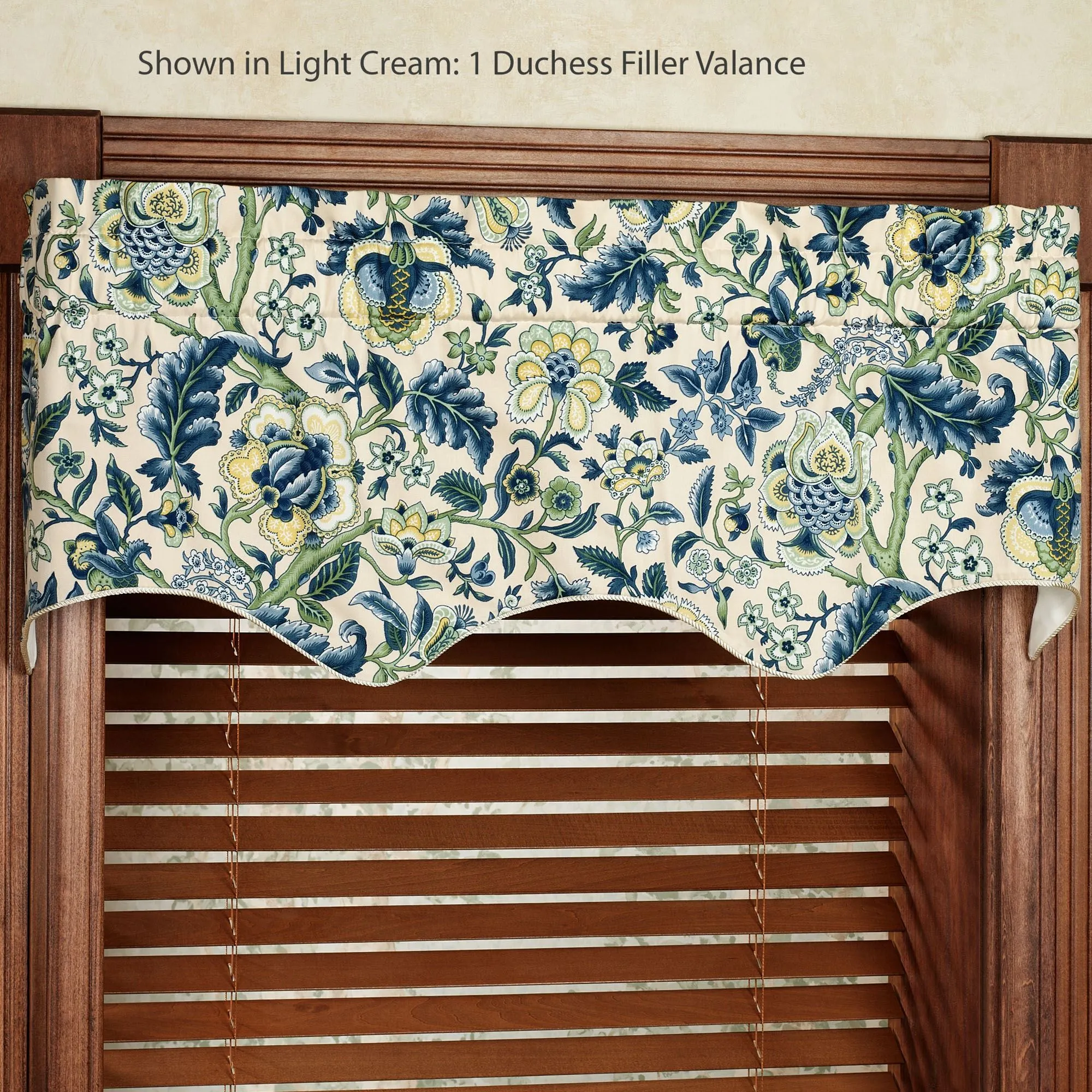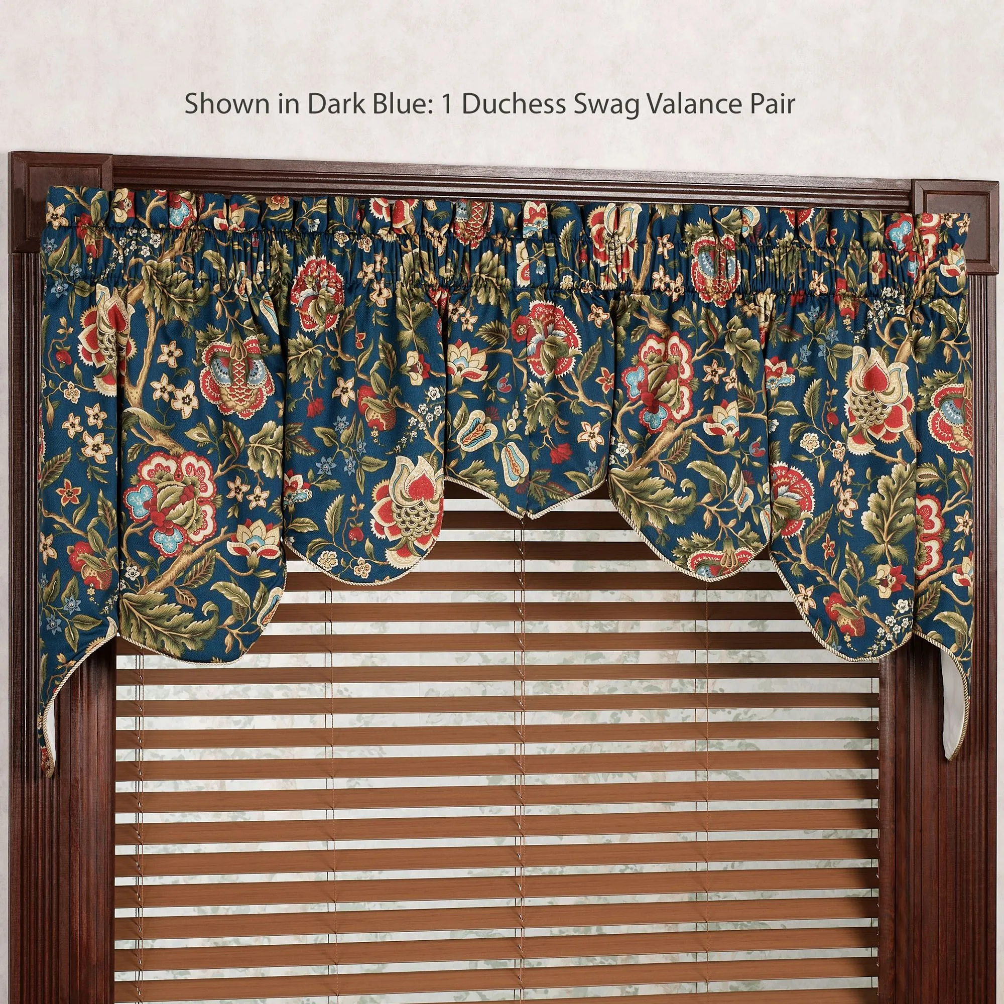 Specify Curtain Pair, Tailored Valance, Duchess Swag Valance Pair, or Duchess Filler Valance. Curtains include tiebacks. Duchess Valances have twist cording and scalloped edges.