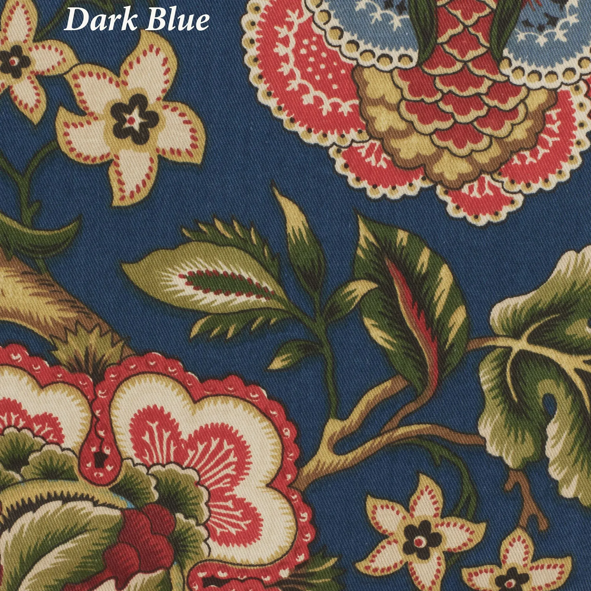 The Regency Jacobean Floral Window Treatment and Chair Cushions are cotton. Cushion fill is polyester. Made in the USA.