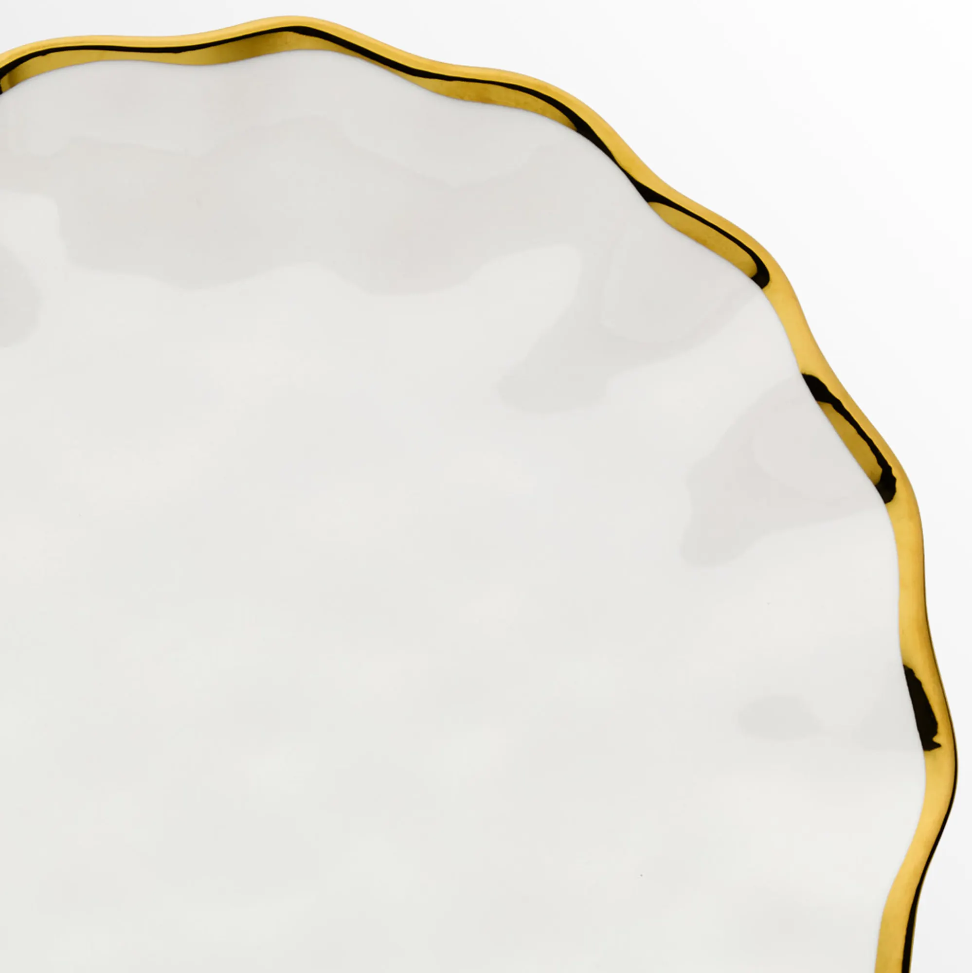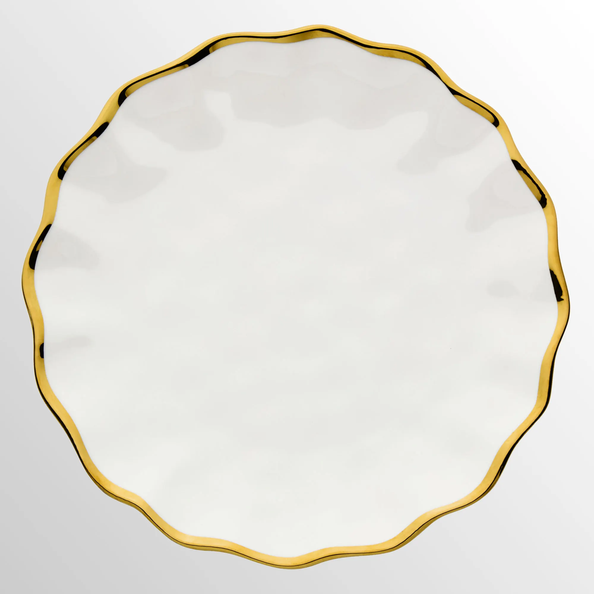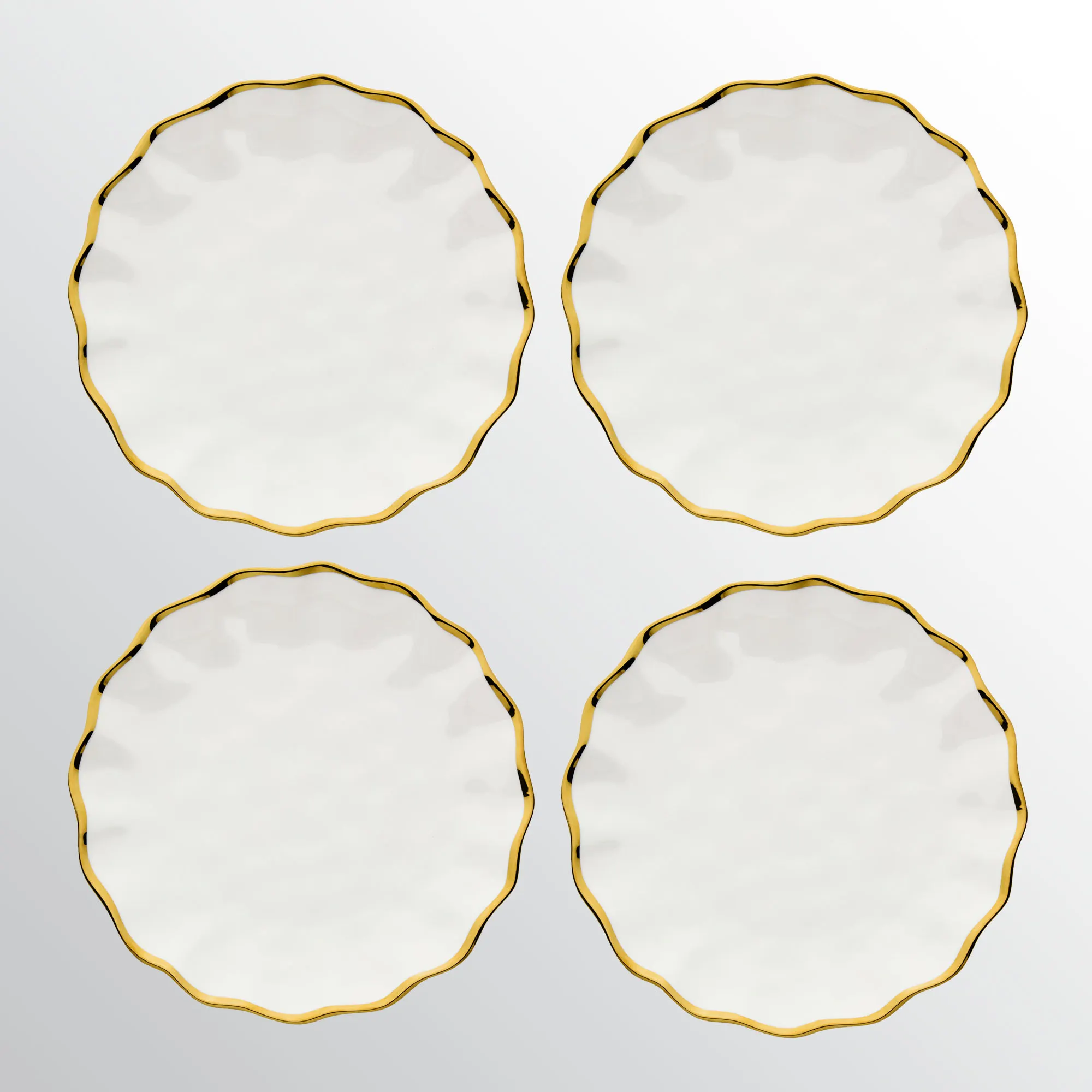 Set your table with the timeless flair of the Regency Dinner Plate Set. With a ruffled look, each gloss-finished white ceramic plate features an elegant metallic gold rim. Each measures 11" dia. Food safe. Dishwasher safe.