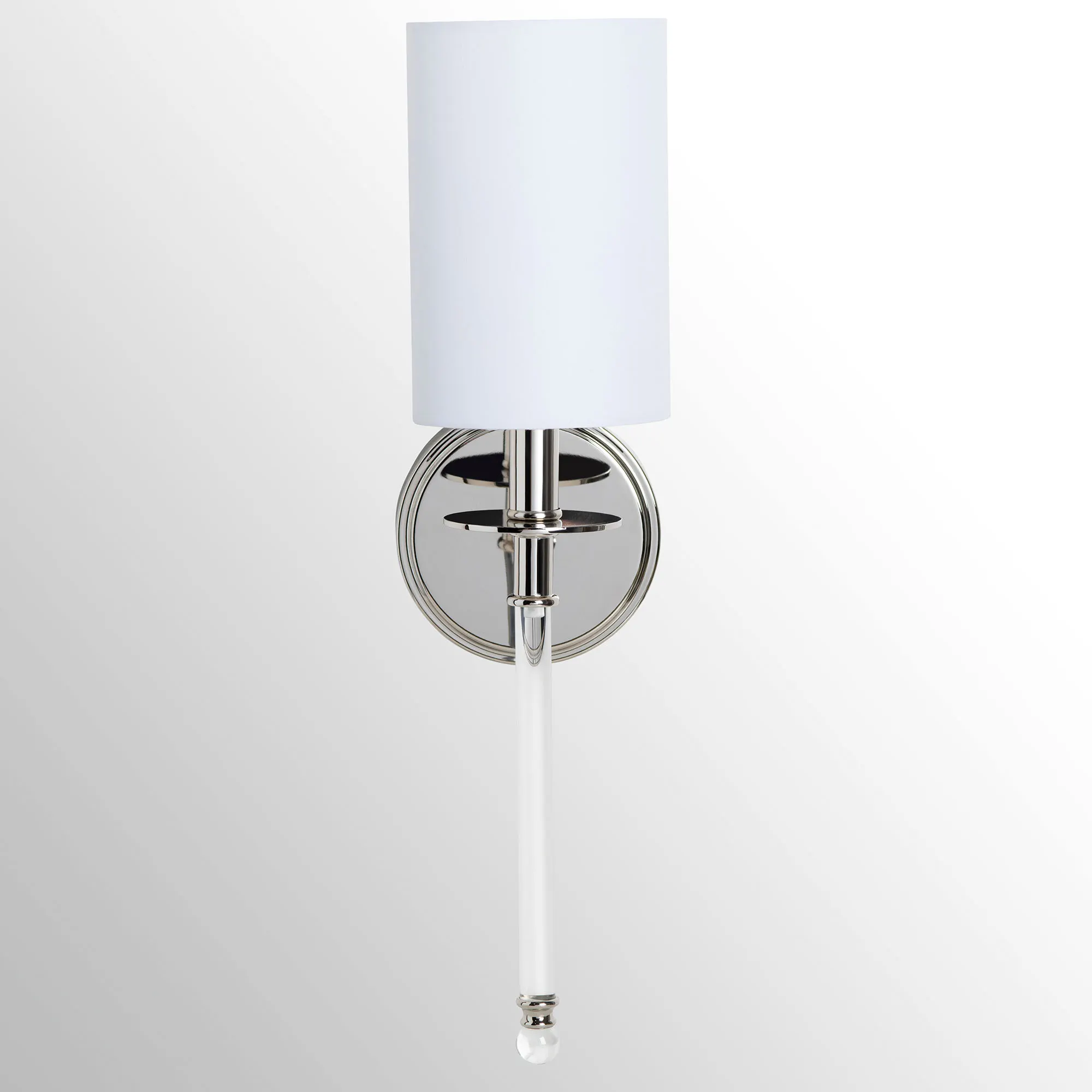 The sleek and modern Remi Wall Sconce Lamp looks stunning in any setting. Made of metal with acrylic accents, this wall sconce has a chrome finish and a round backplate. The hardback fabric shade is off-white. UL listed. Requires one 60W max. bulb, not included. Must be hardwired to an existing circuit. Measures 5"Wx7"Dx24.5"H; weighs 11 lbs.