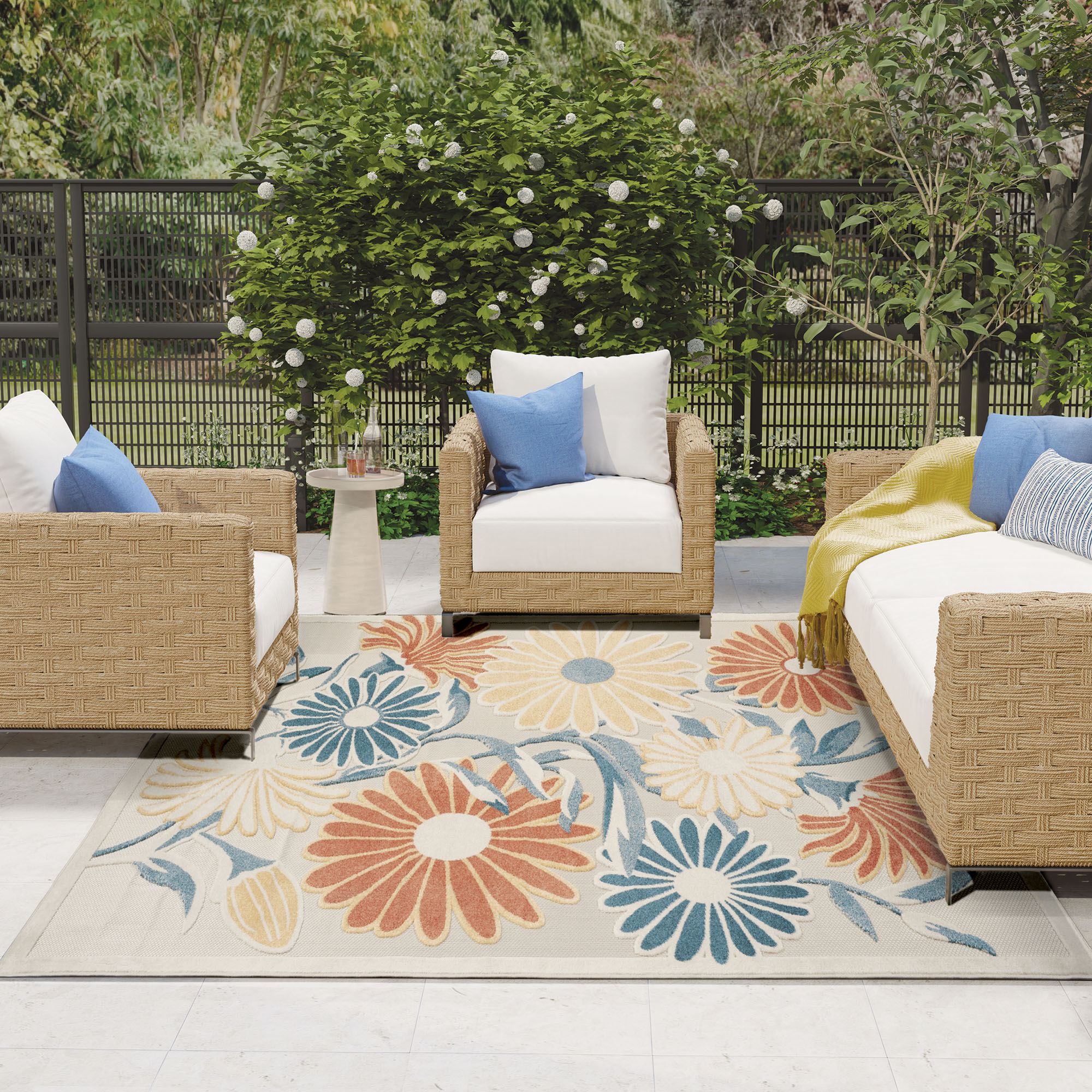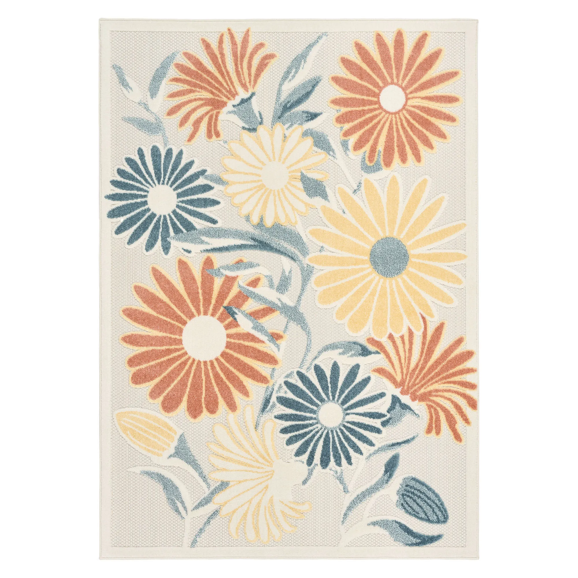 An oversized daisy motif decorates the Renae Ivory Floral Indoor/Outdoor Rug with sweetness and charm. This power-loomed polypropylene area rug, .25" thick, has a flat-woven design of flowers and a hi-lo textured pattern. The ivory coloration includes shades of ivory, blue, yellow, and ember glow. Backing is latex. Rug may be used indoors or outdoors seasonally; do not expose this rug to freezing temperatures. Spot clean and rinse with a garden hose; for stubborn stains, we recommend professional cleaning by a rug cleaner. Imported.