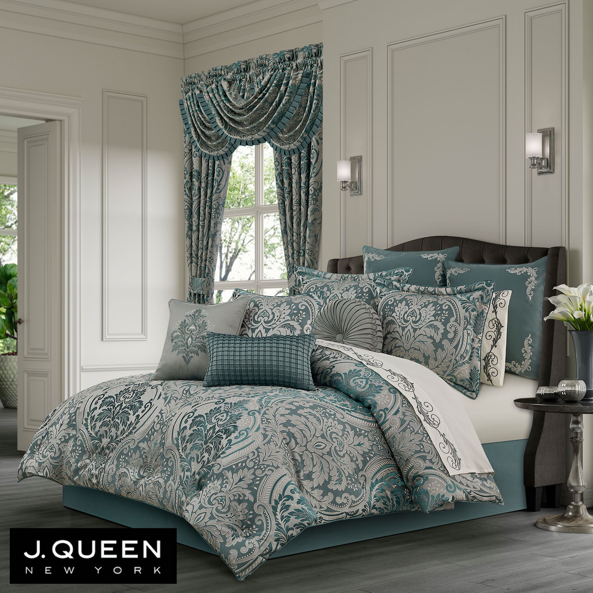 Decorate with the classic elegance of the Renata Damask Comforter Bedding by J. Queen New York. The jacquard-woven polyester comforter features overscale timeless damask in light teal, white, and teal shades. Oversized comforter has piped edges and is backed in light teal polyester. Bedding fill is polyester. Dry clean only. Imported.