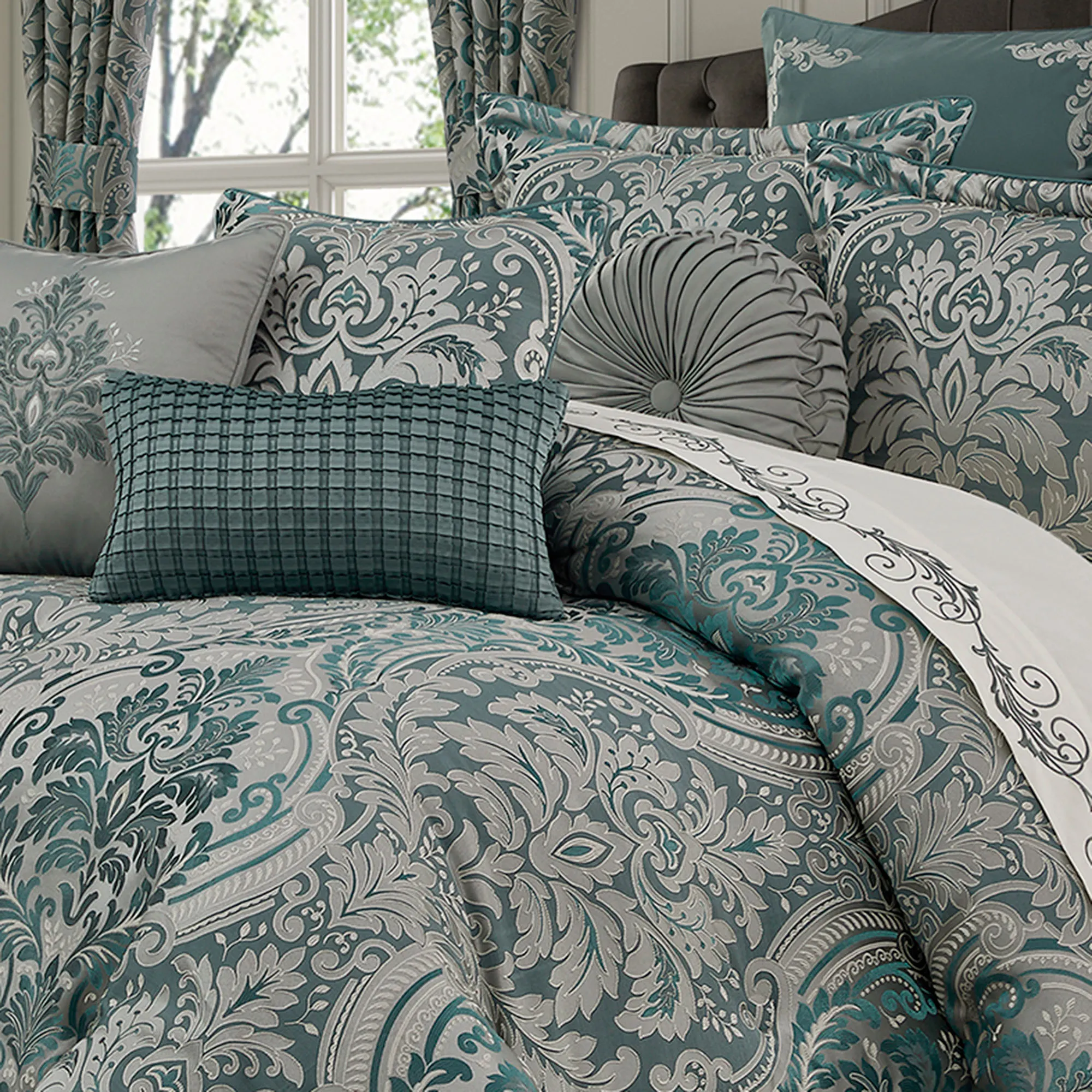 Renata Teal Jacquard Woven Damask Comforter Set Luxury Bedding by J Queen New York