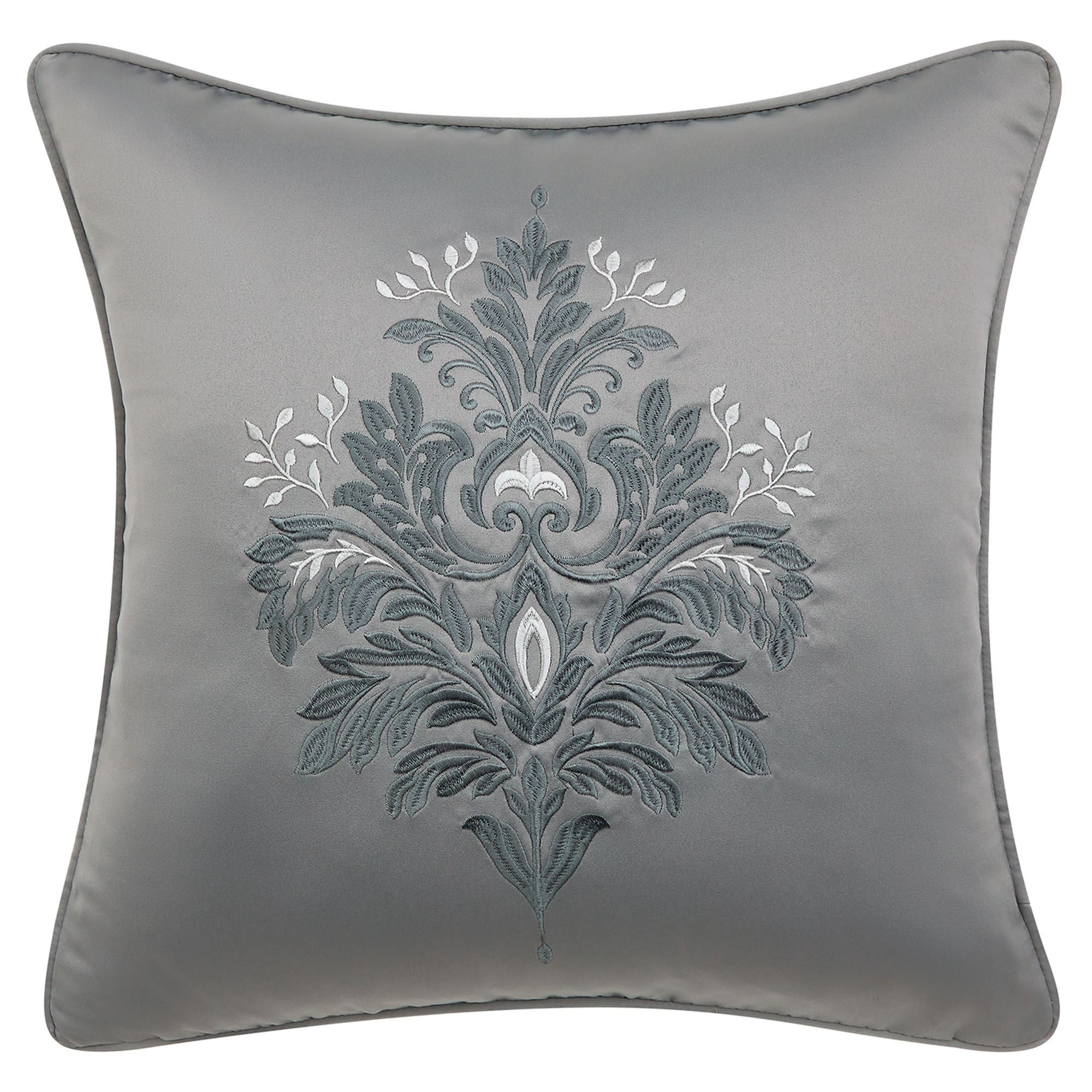 Pillows: Jacquard Damask Square, 20". Rectangle, 12"x20". Embroidered Square, 18". Round, 15".
