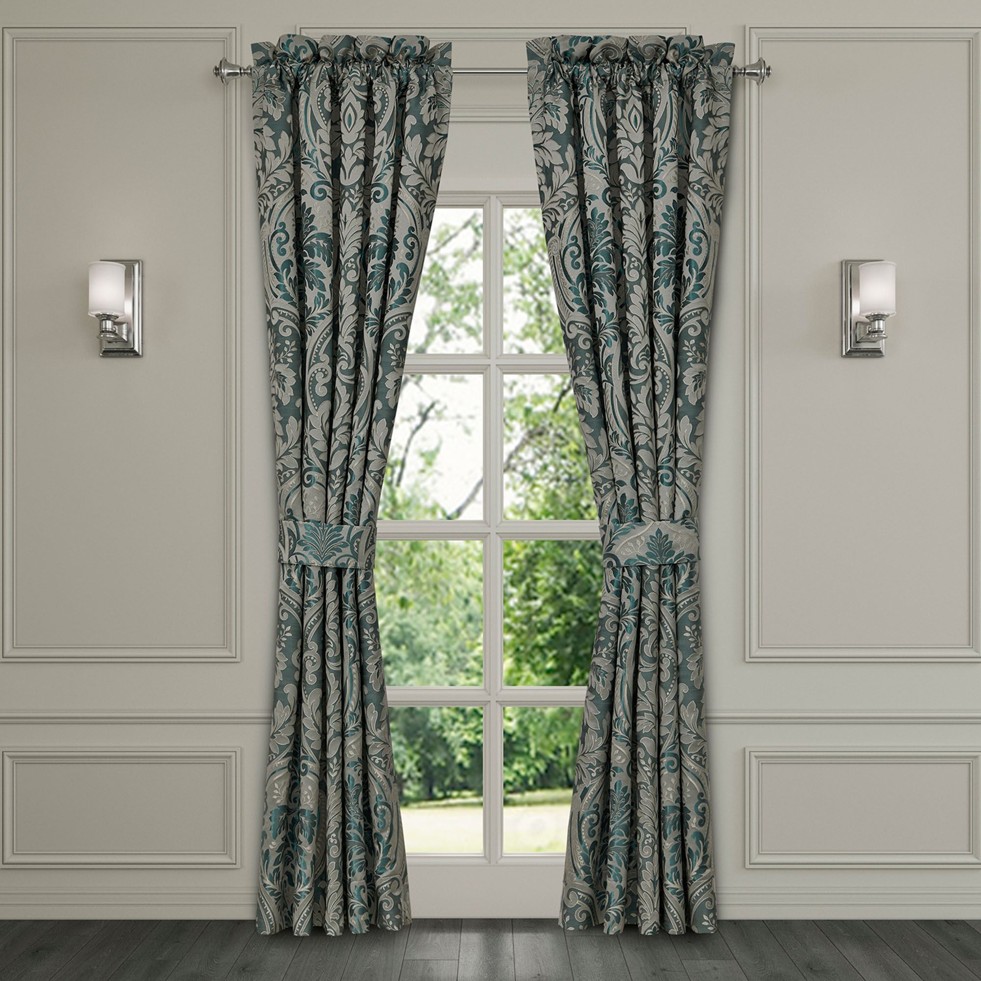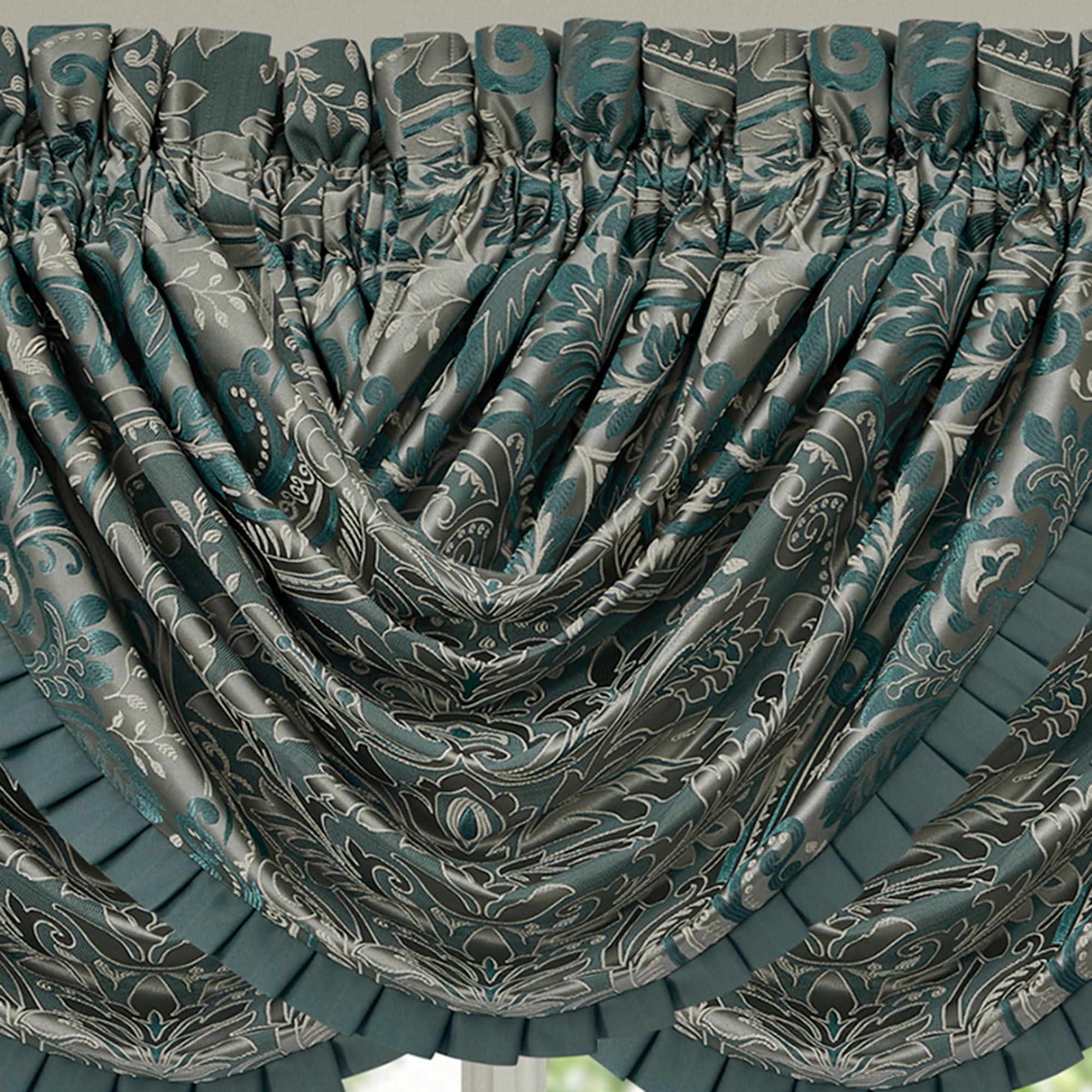 Lined Window Treatments have damask. Wide Curtain Pair has tailored edges and a 3" rod pocket. Tiebacks are included. Each Waterfall Valance has teal pleated edges and a 3.25" rod pocket. We recommend one valance for every 12"-15" of window width.