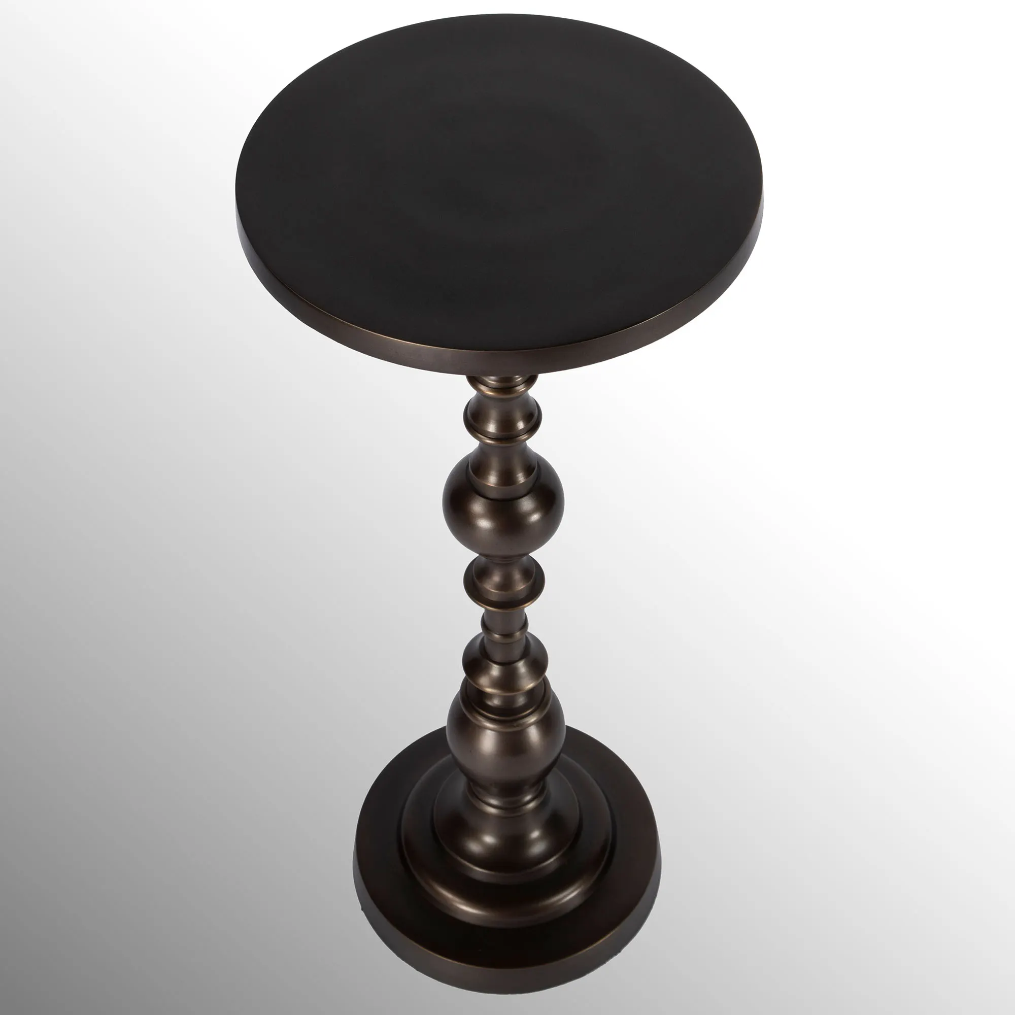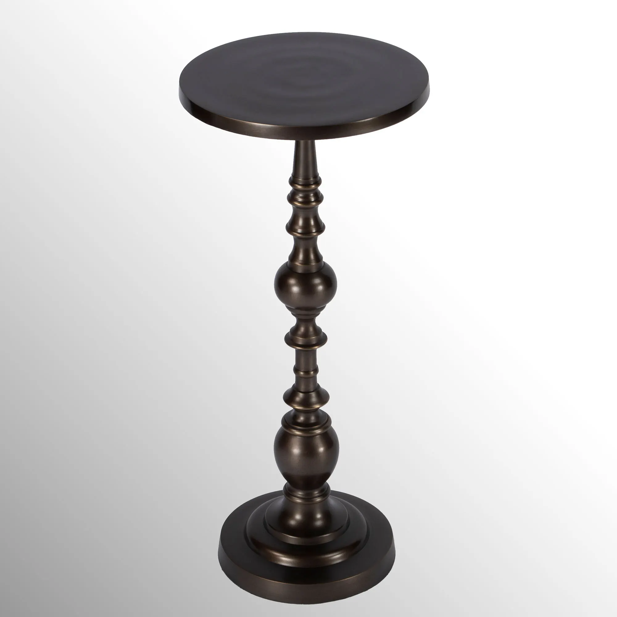 Place the Rennie Street Pedestal Table near your favorite furniture. This aluminum pedestal table has a bronze powder-coat finish with a clear lacquer coating, a turned design, and a stepped bottom base. Measures 10"dia.x22.5"H.