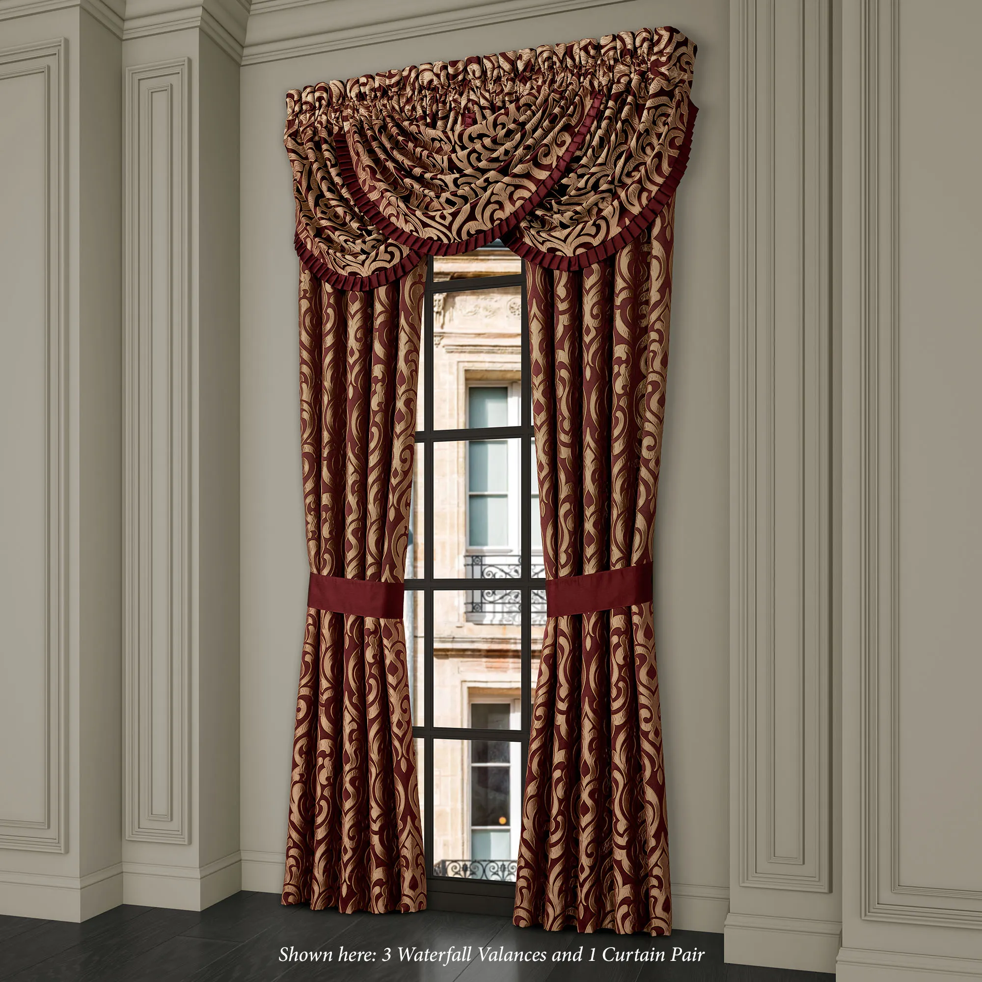 Lined Window Treatments have a woven damask scroll design on crimson. The tailored Wide Curtain Pair has a 3" rod pocket and includes tiebacks. Curtains are available in two lengths. Each Waterfall Valance has a pleated flange on the ends and a 3.25" rod pocket. We recommend one valance for every 12"-15" of window width.