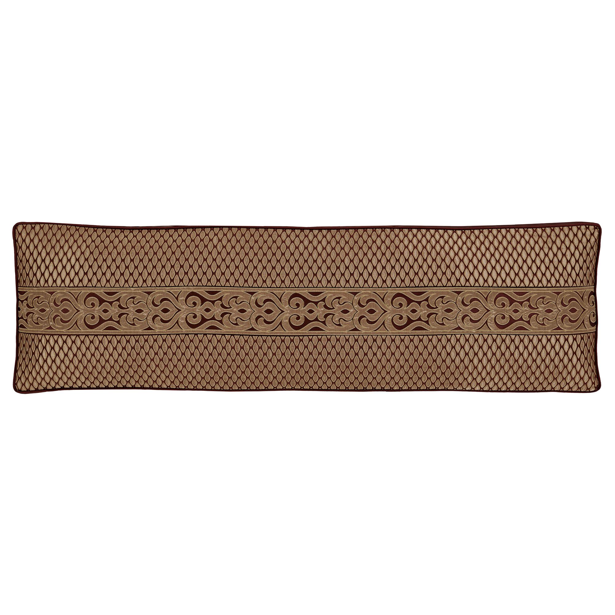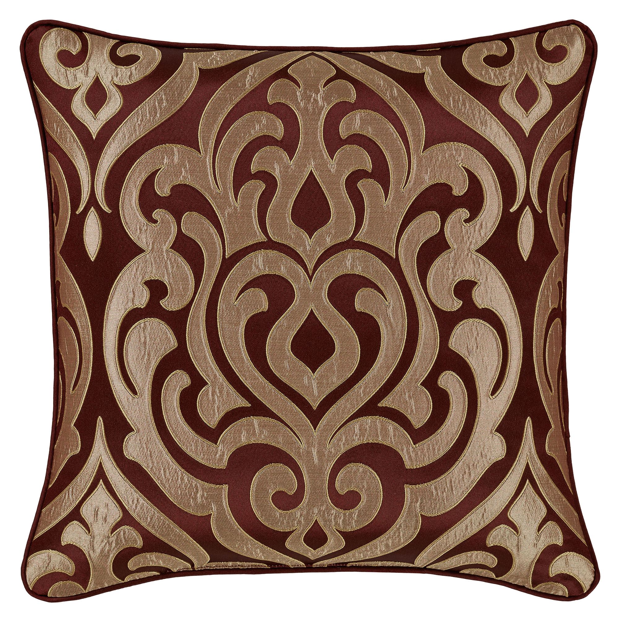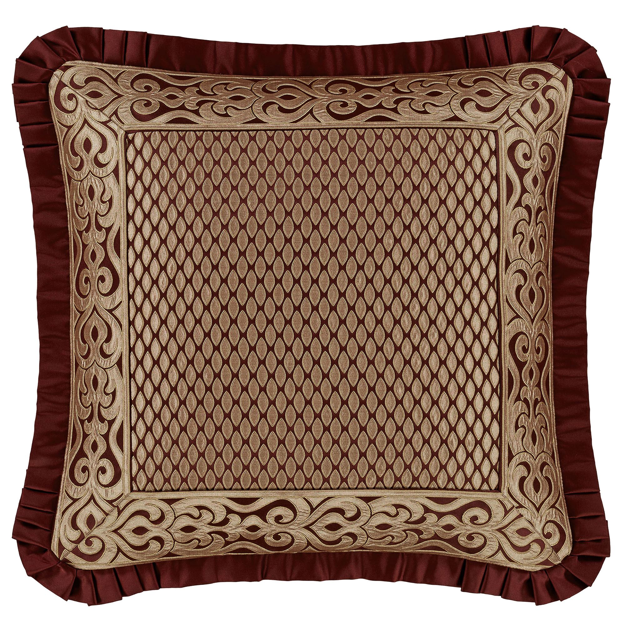 The flanged European Sham has a woven teardrop pattern in the center framed by a woven damask scroll design on crimson, pleated corners, and a zipper closure.