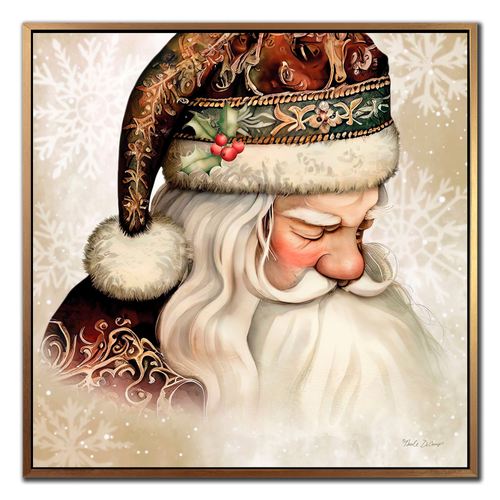 Resting Santa closes his eyes to catch a quick nap. The Christmas wall art canvas, from an original artwork by artist (C)Nicole Decamp, features an Old World Santa Claus wearing an ornate hat and matching coat. Different snowflake silhouettes decorate the background. Colors include cordovan, cypress green, cream, linen, and ivory. Santa Claus wall art has handpainted gel embellishments and is surrounded by a gold, floating polystyrene frame. Measures 25.5"sq.x2"D.