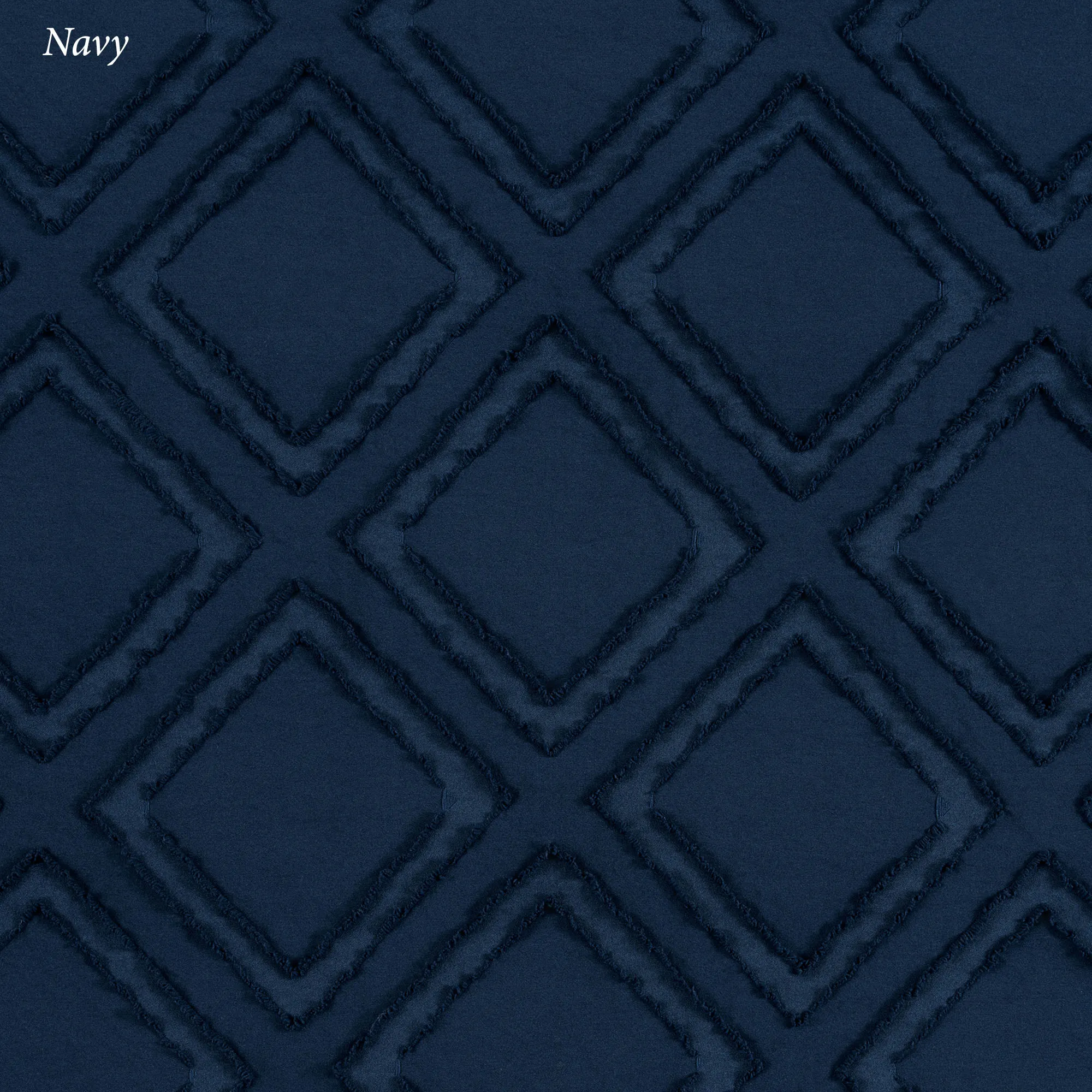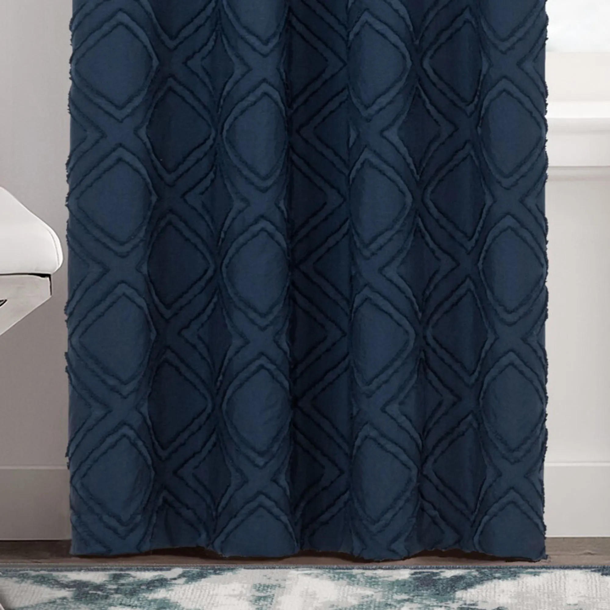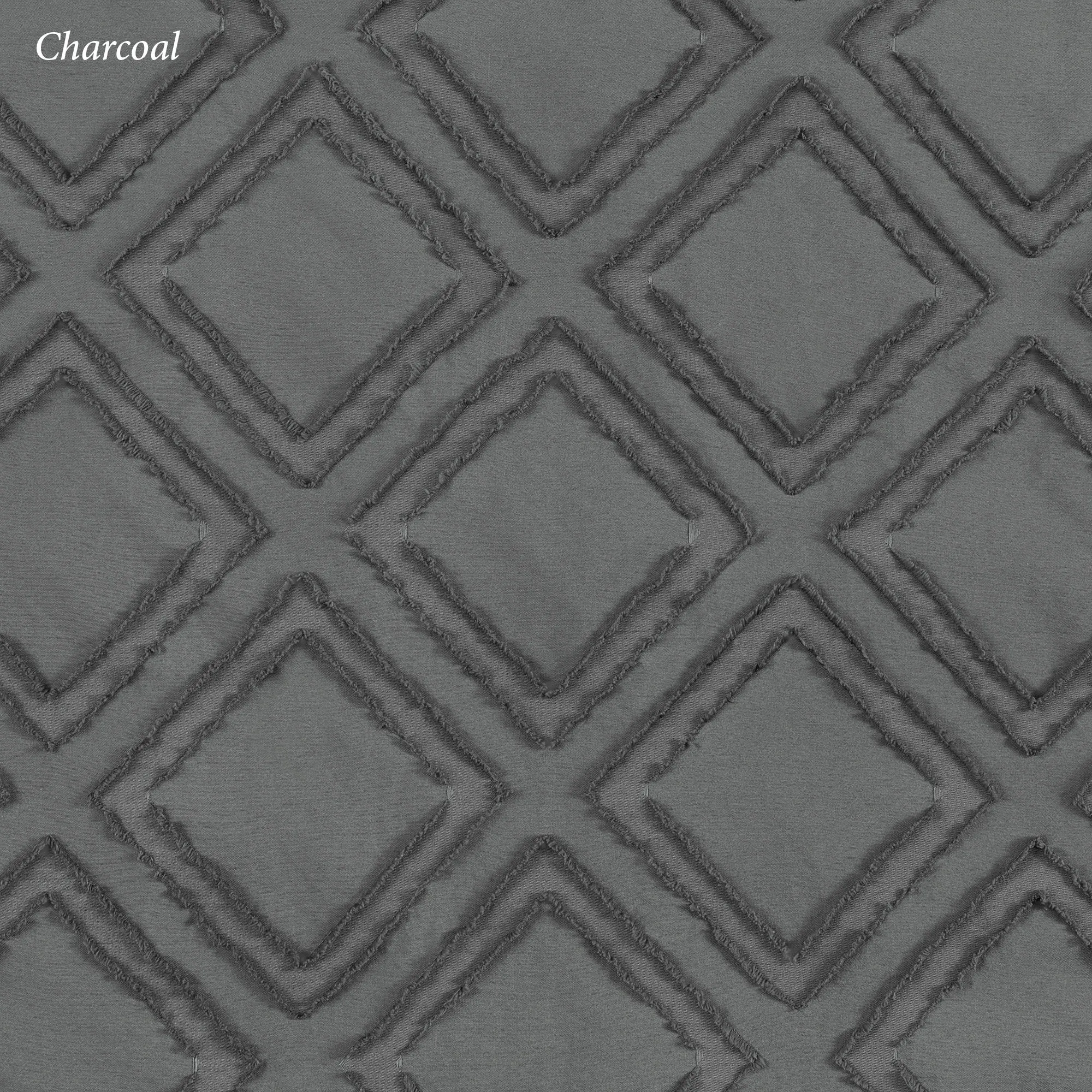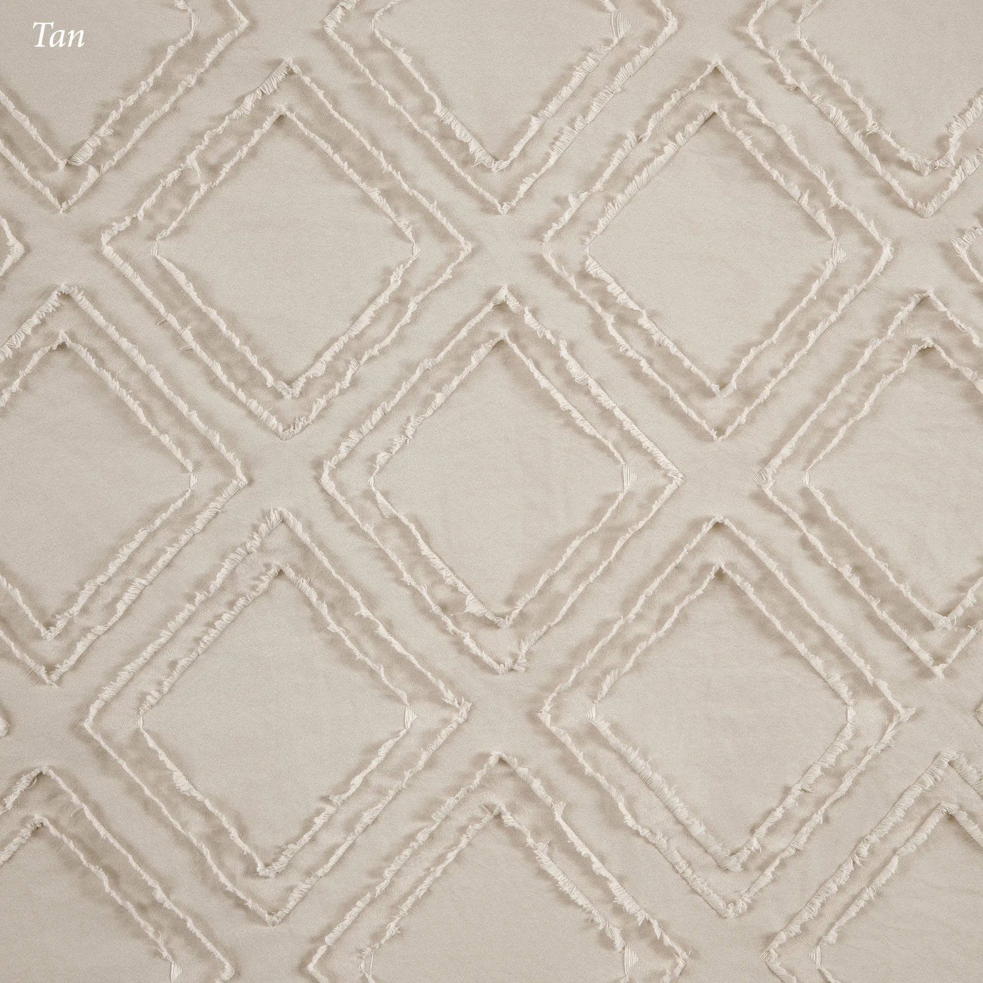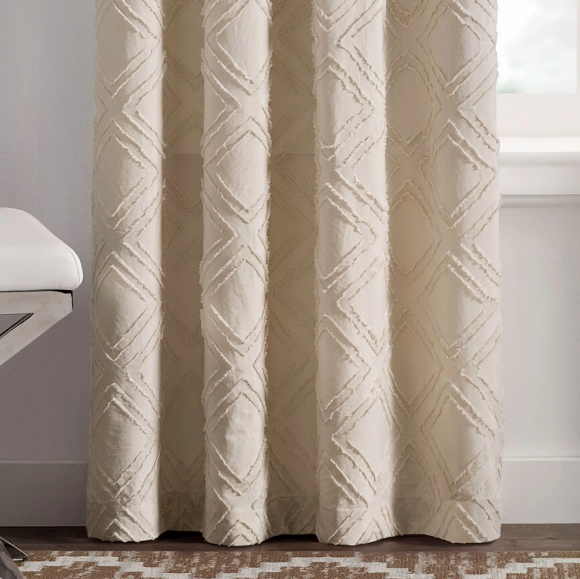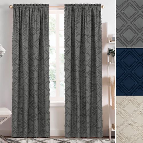 A clipped diamond design adds a unique fringe-like texture to the Rexford Curtain Panel. Made of polyester, this panel filters light and has a geometric design. Rod pocket is 2". Sold individually, each curtain panel measures 42"W. Machine washable. Imported.