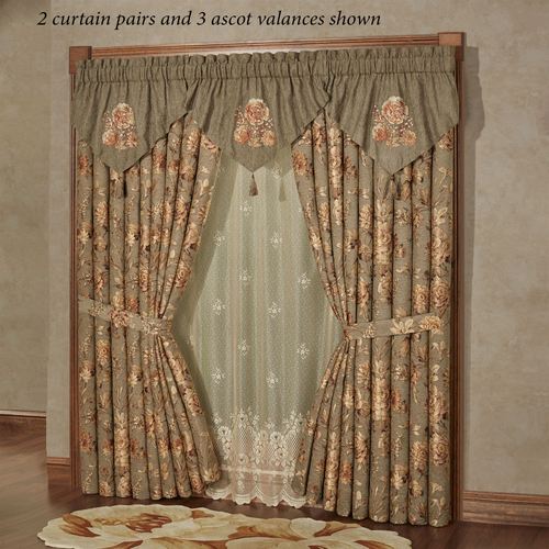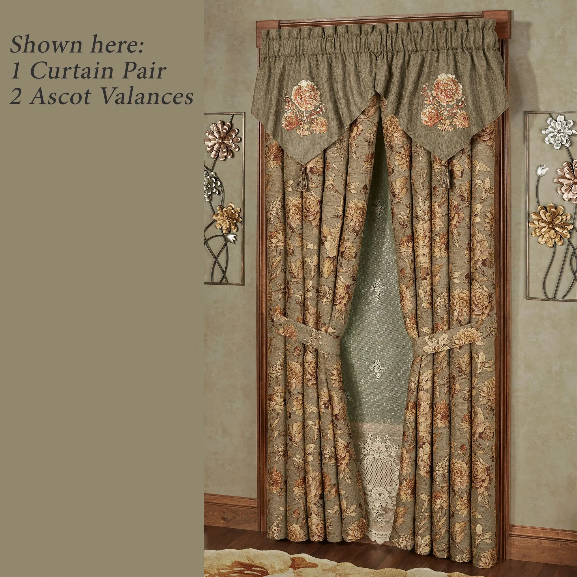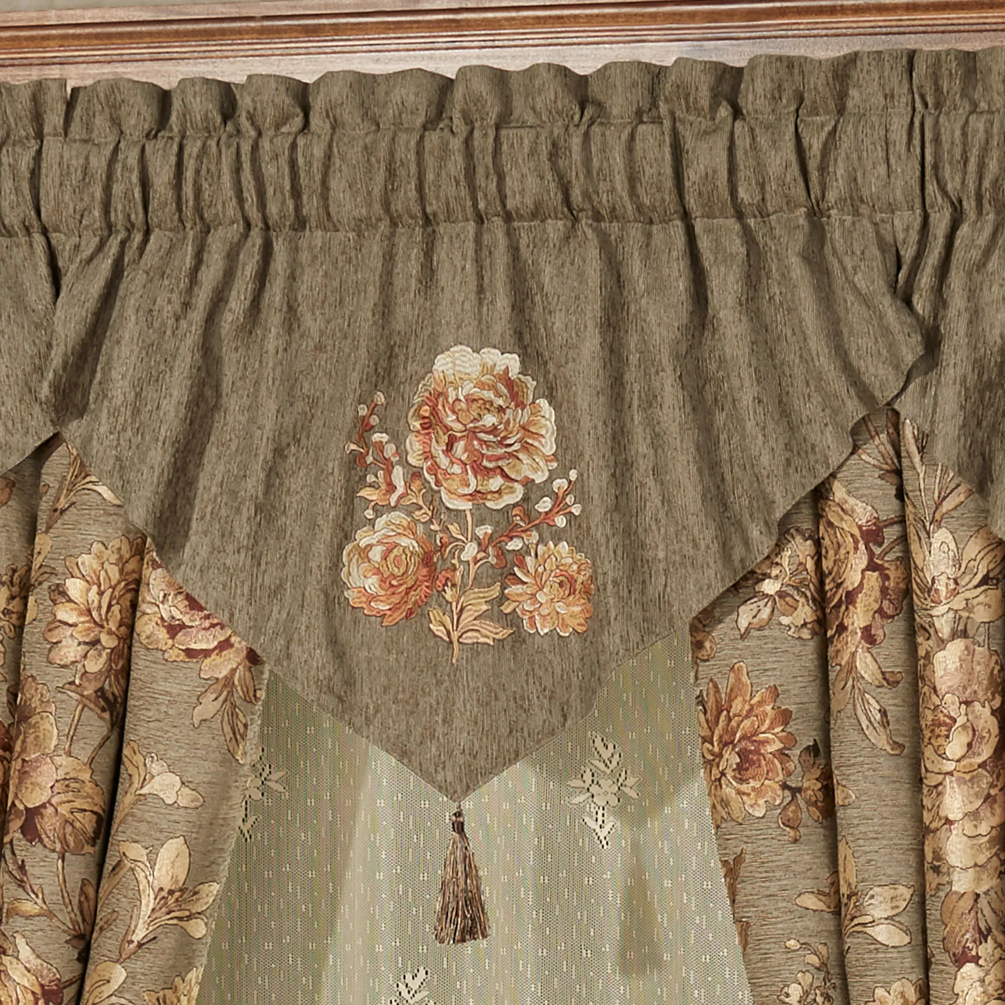 It is easy to see nature's beauty with the montage of flowers and leaves on the Rhapsody Floral Window Treatment. This polyester ensemble features floral and leaf designs in auburn, light gold, harvest gold, chocolate, and cinnabar on a eucalyptus chenille background. Lined window treatment has 3" rod pockets. Specify Ascot Valance or Wide Curtain Pair. Each Ascot Valance has embroidery and a tassel on the end. The tailored Wide Curtains have woven florals and leaves and include tiebacks. Dry clean. Imported. The curtain pair width is the total width of two panels together.