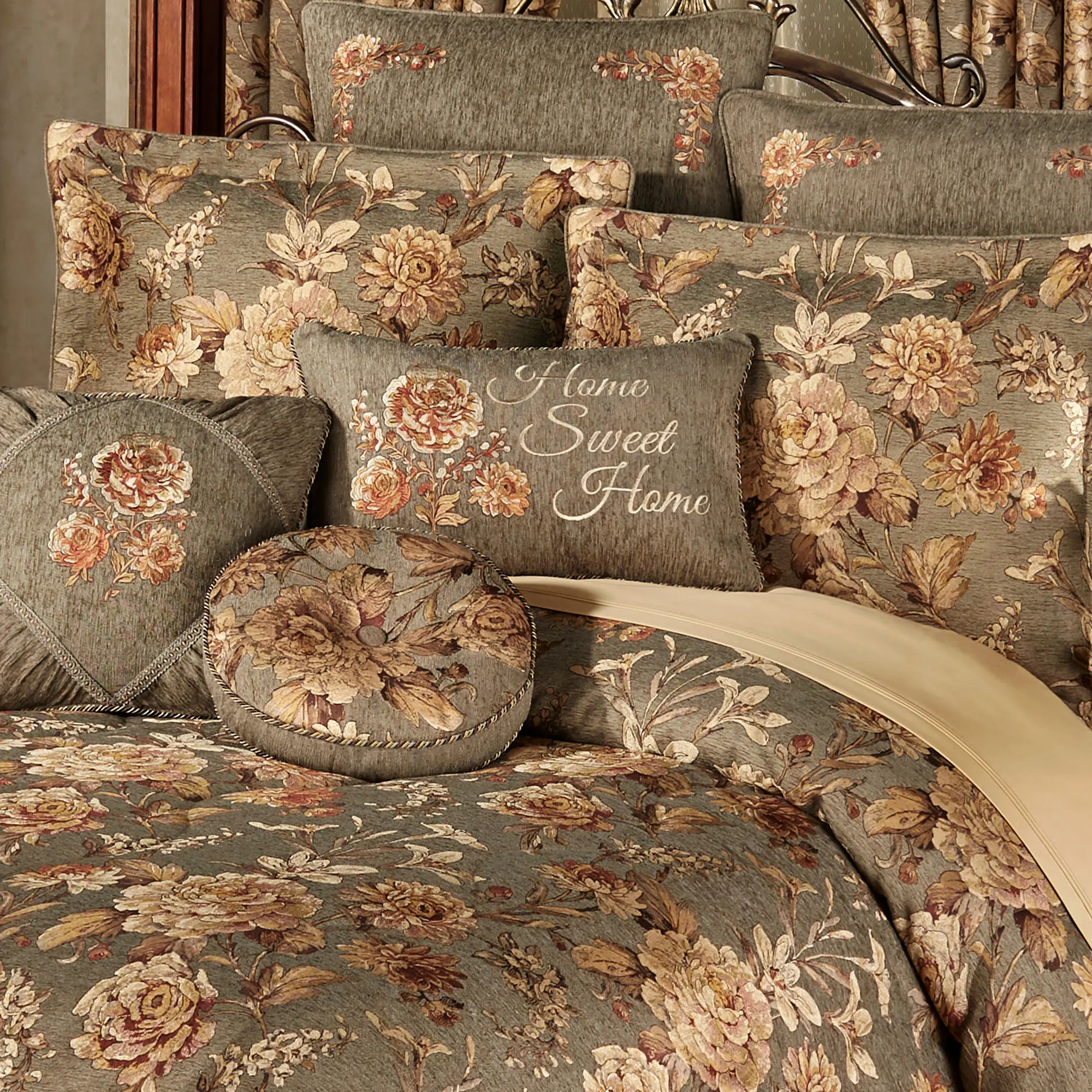 Pillows: Spot clean. The reversible Round has woven florals and leaves, cording, a central button tuft, and a 2" eucalyptus chenille side gusset. The corded Rectangle has embroidered florals and the words "Home Sweet Home" on eucalyptus chenille. The corded Square has floral embroidery, gimp trim, and shirred corners on eucalyptus chenille.