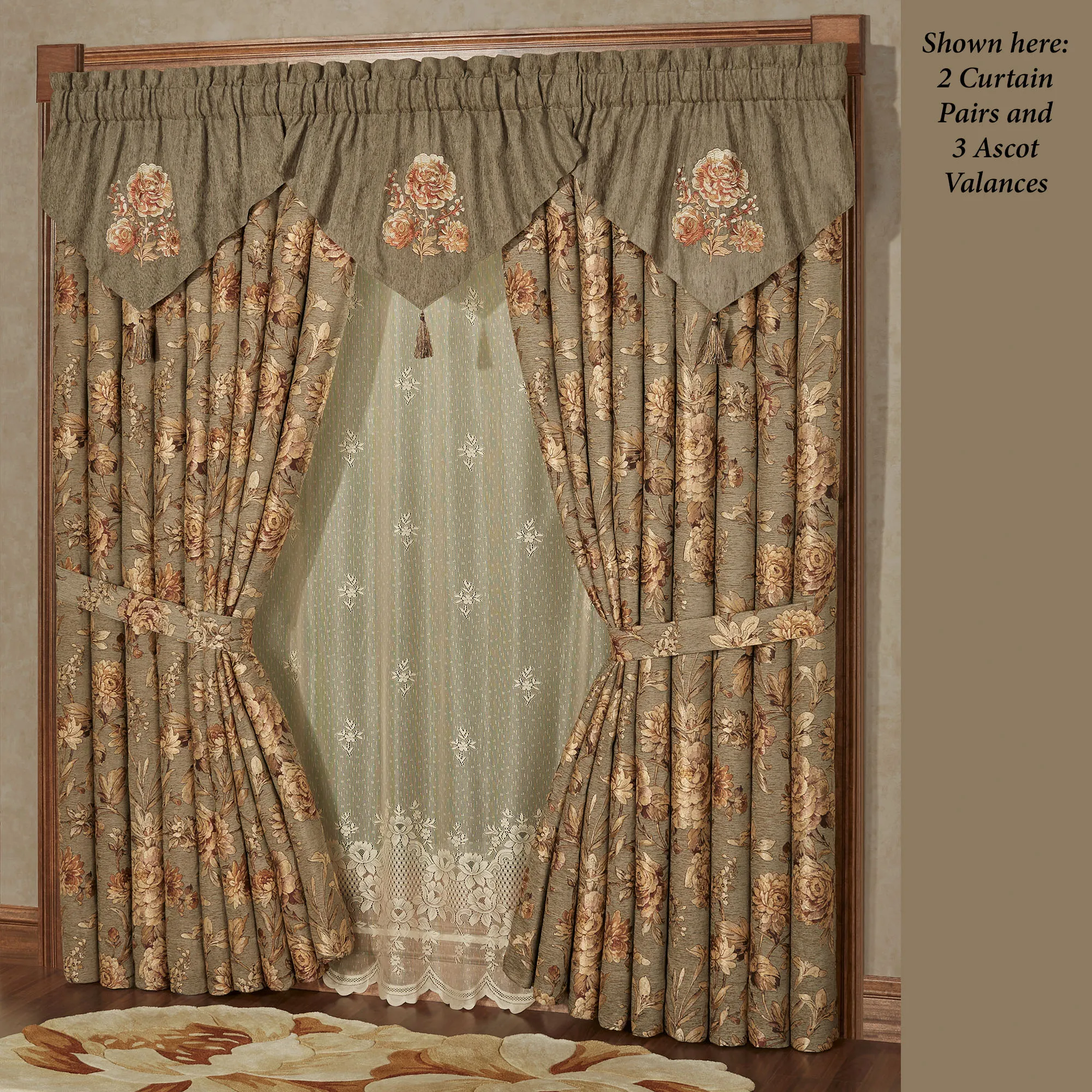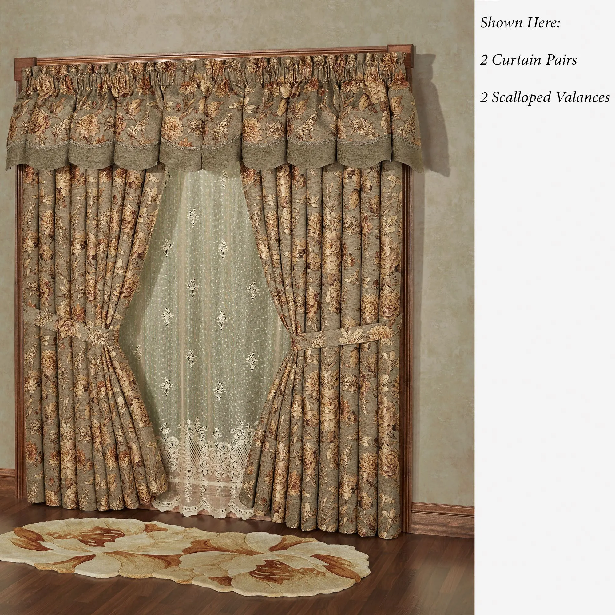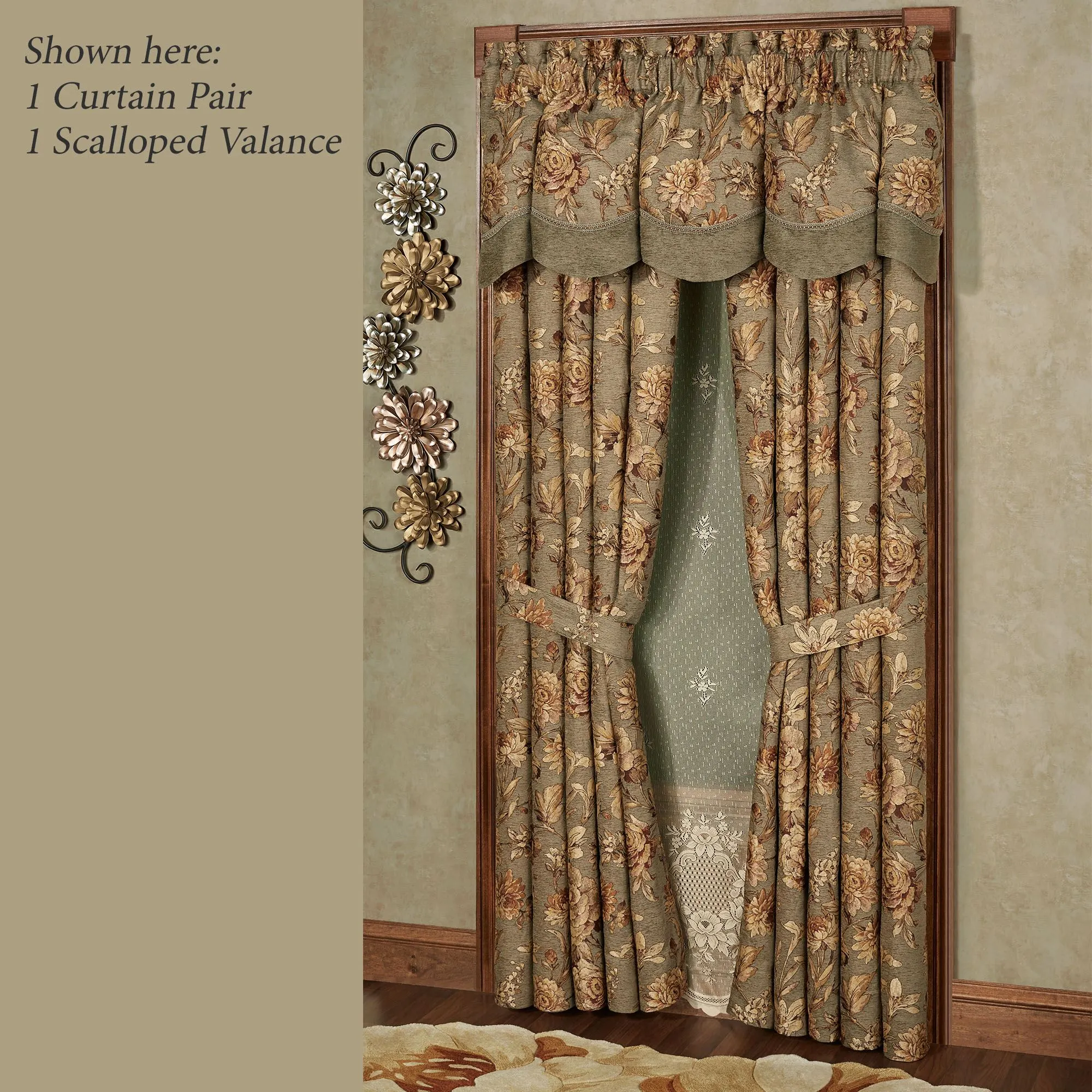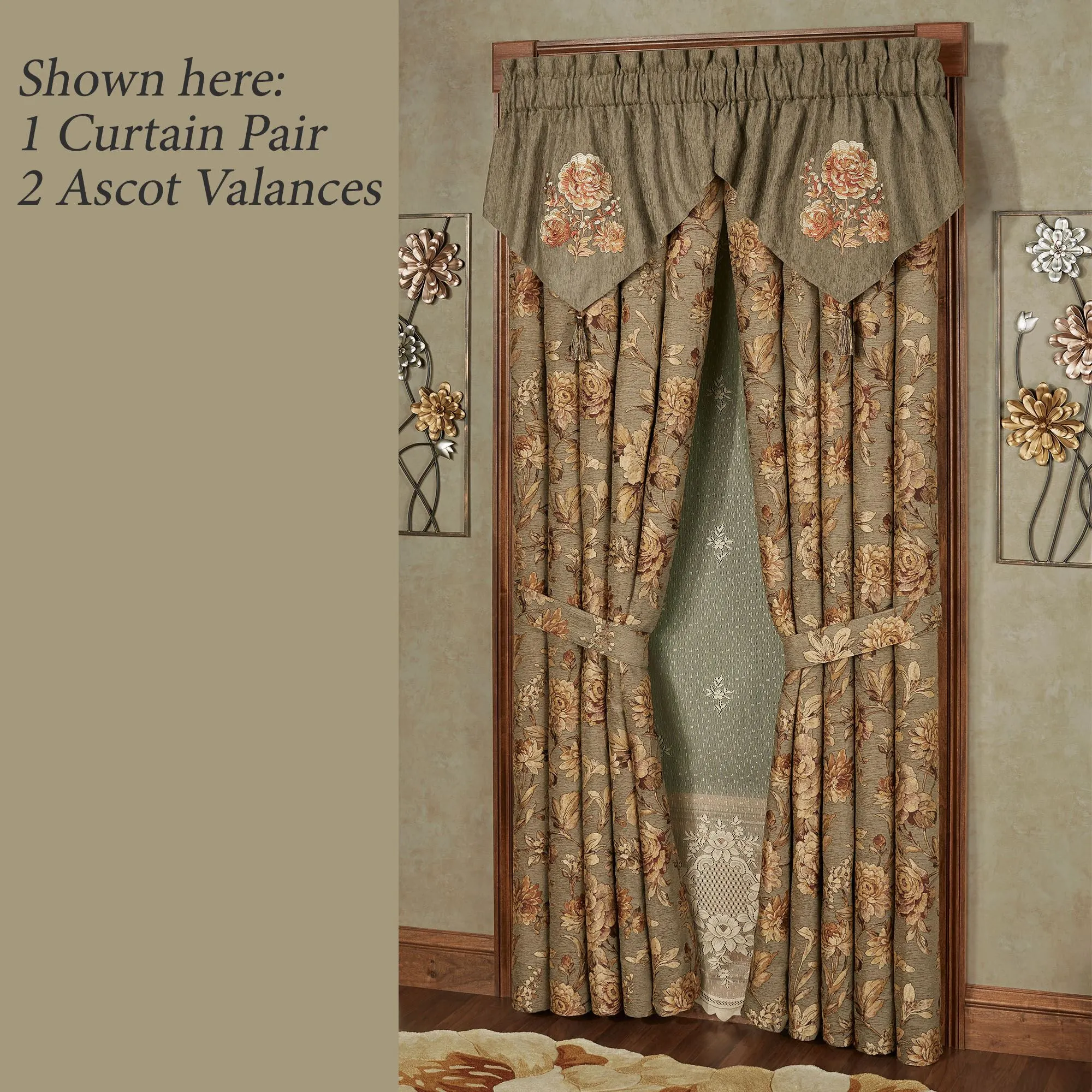 Lined Window Treatment has 3" rod pockets. The tailored Wide Curtains have woven florals and leaves and include tiebacks. Each Ascot Valance has embroidery on eucalyptus chenille and a tassel on the end. The pieced Scalloped Valance has woven florals and leaves, gimp trim, and eucalyptus chenille.