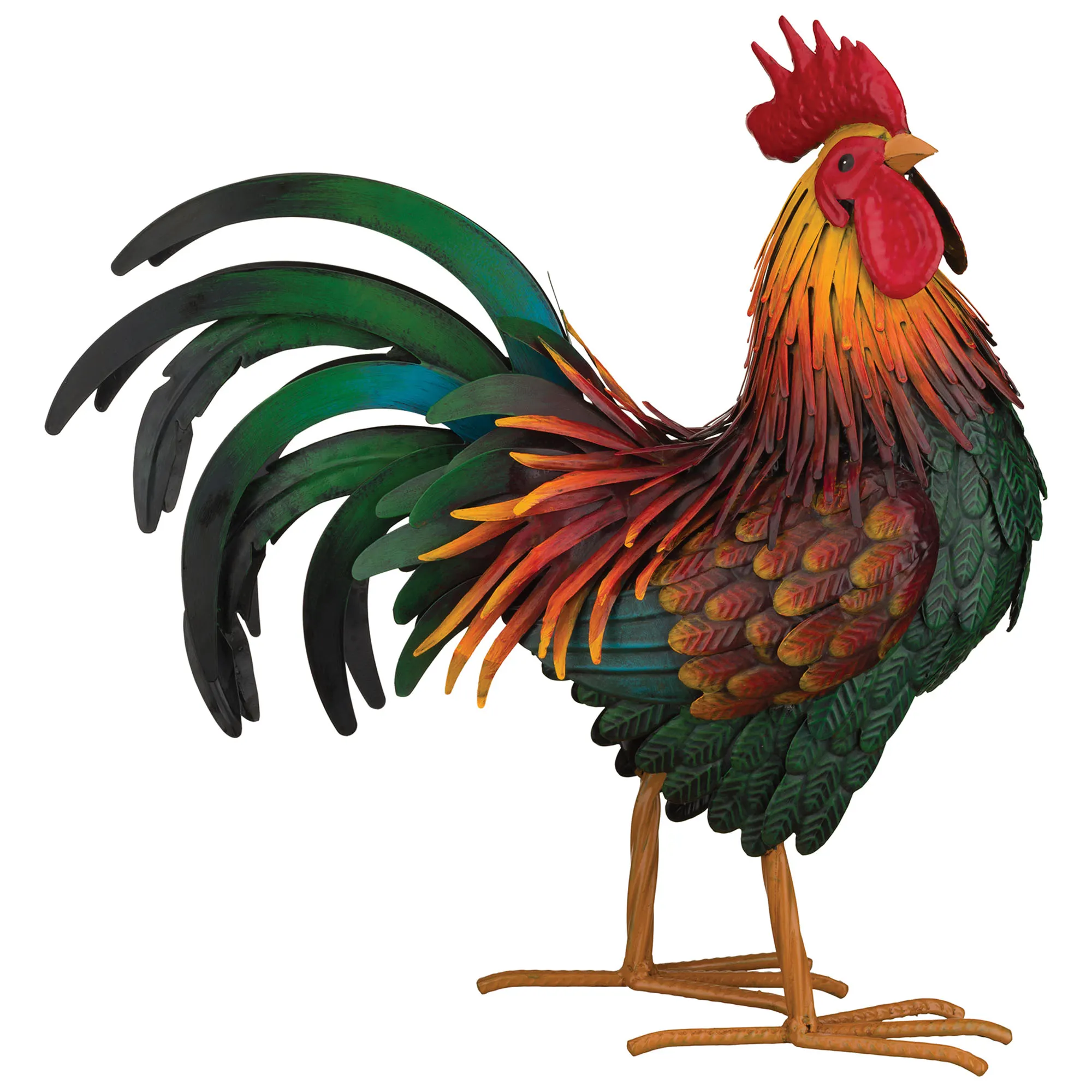 Living in the country is not a problem for the Rhode Island Red Rooster. This metal rooster sculpture has embossed details, features weather- and fade-resistant paint, and is crafted with true-to-life details. Colors include shades of rich brown, red, and green. The rooster sculpture may be displayed indoors or outdoors year round. Measures 17"Wx6"Dx18"H.