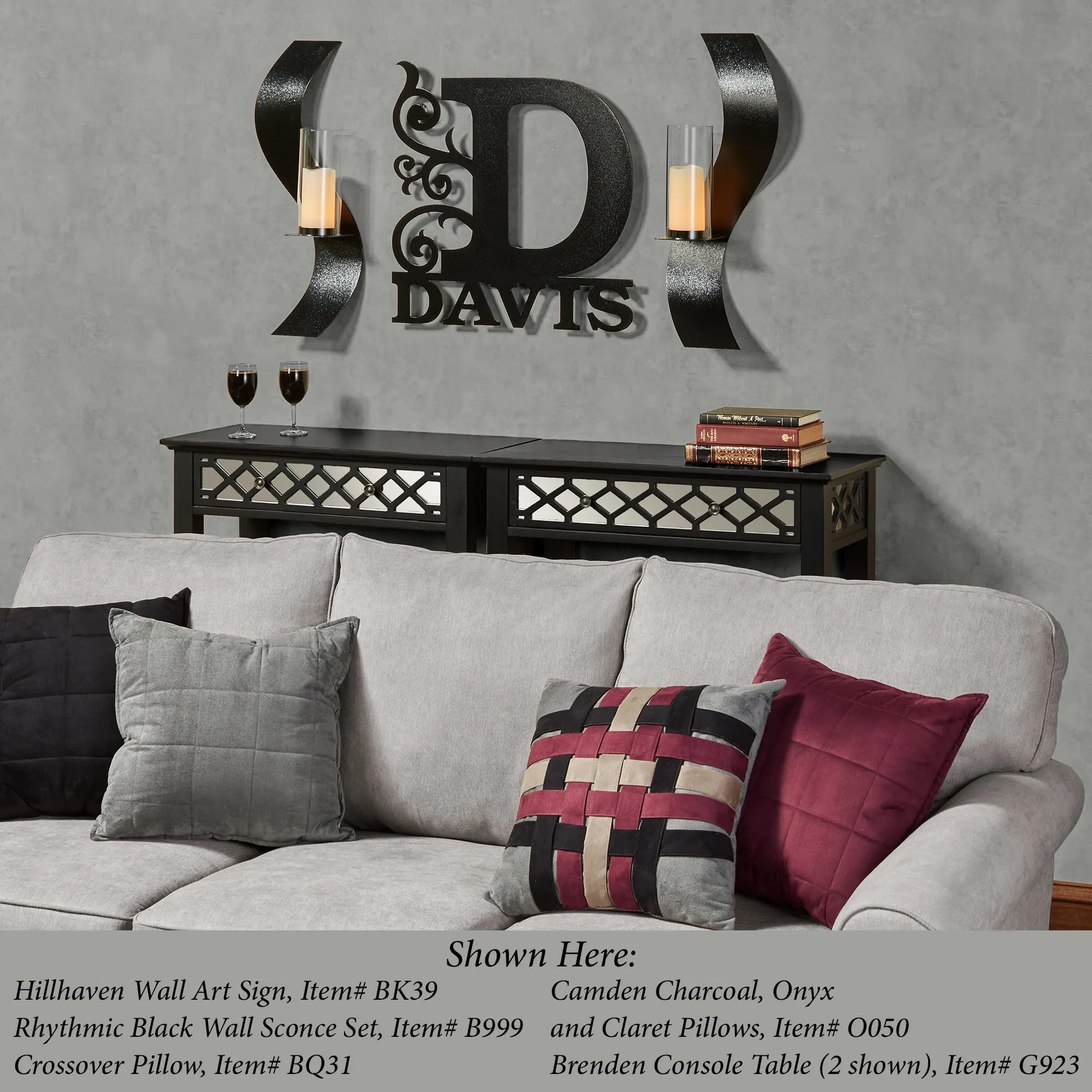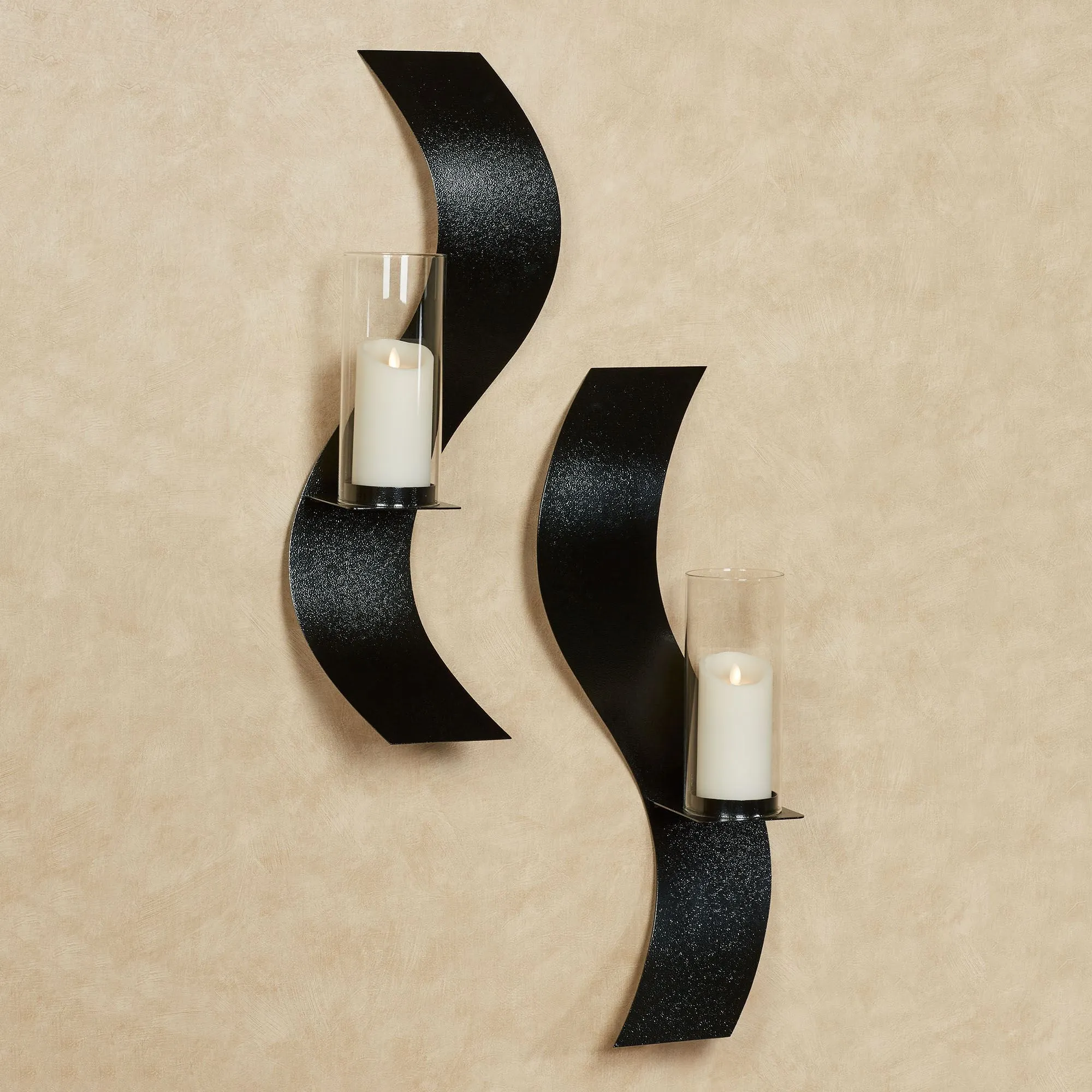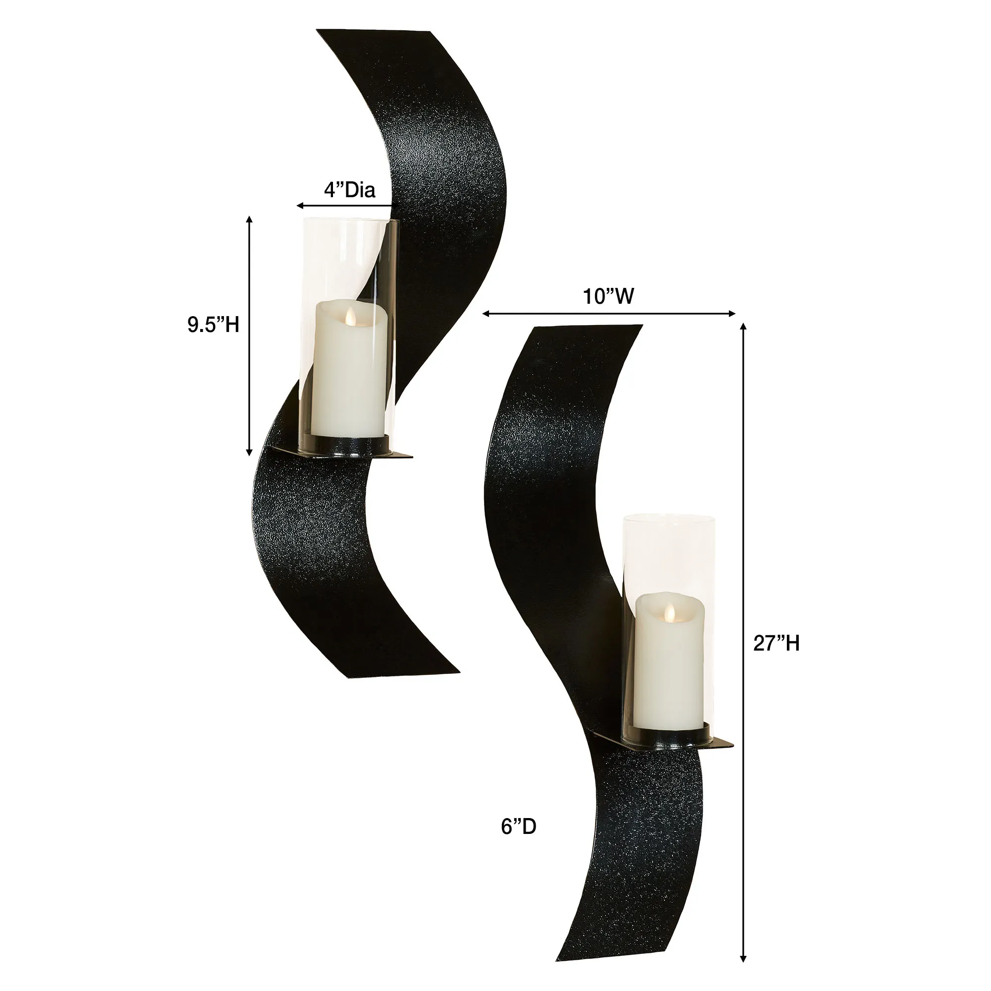 Opposing, black-finished curves flickering in candlelight create a Rhythmic dance upon your wall. Designed by JasonW Studios(R), this curving wall sconce set is proudly handcrafted in the USA from 14-gauge steel and finished in a UV-, weather-, and tarnish-resistant powder coat that perfectly coordinates with your decor. The included 4"dia.x9.5"H clear glass hurricanes protect your 3" dia. pillar candles. Overall, each wall sconce measures 10"Wx6"Dx27"H.
