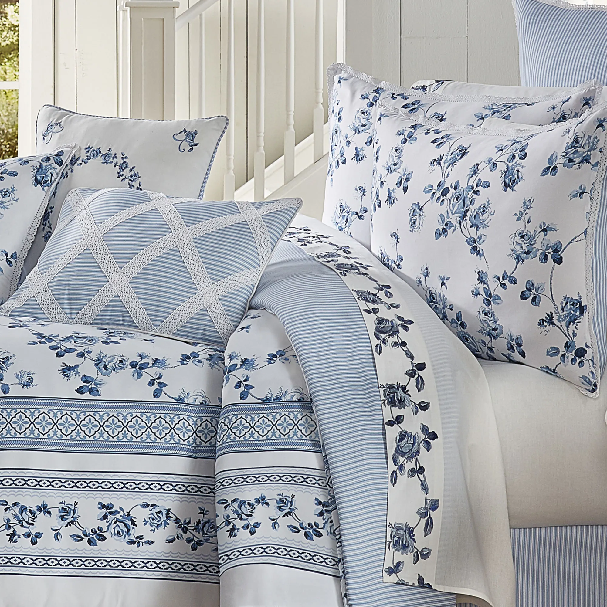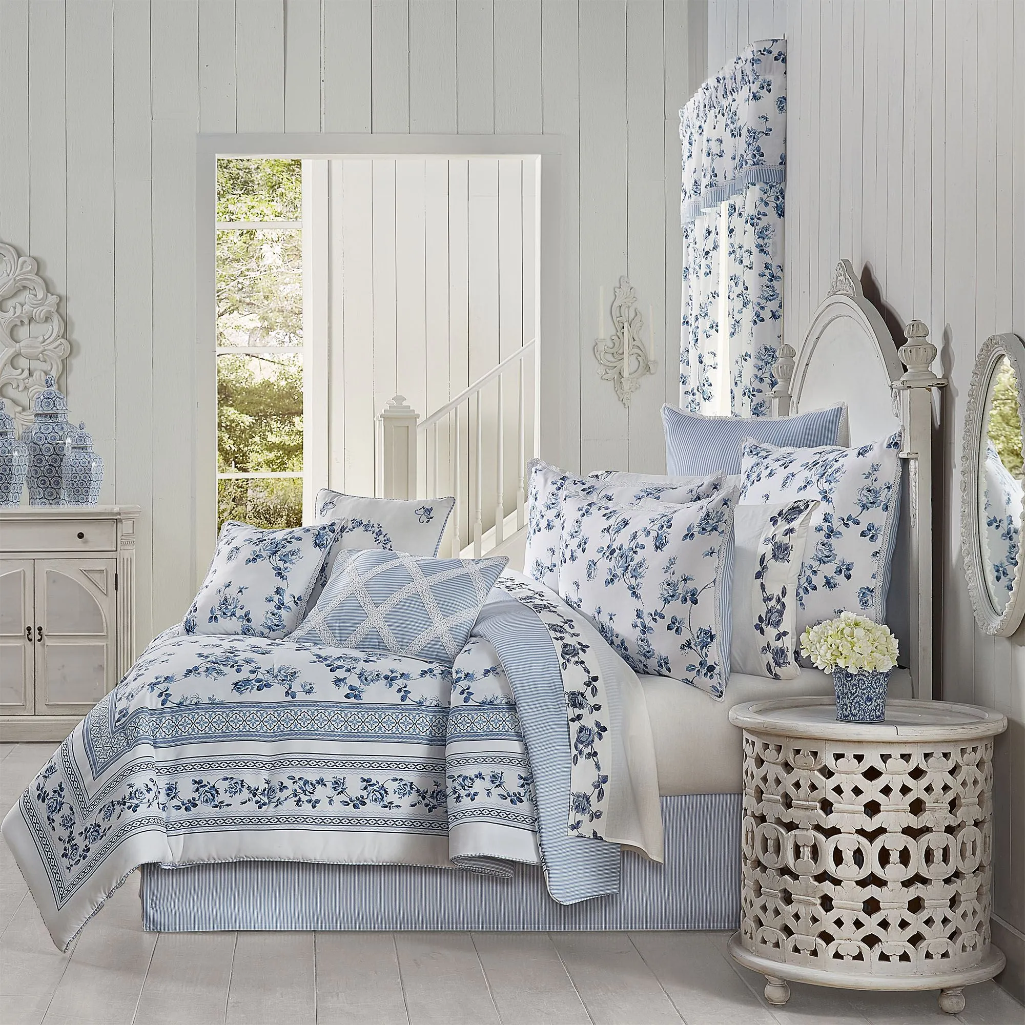 The Rialto Floral Bedding from Royal Court embraces a timeless and classic beauty inspired by artisan porcelain. In crisp hues of white and French blue, the polyester ensemble features lovely vining roses and beautiful engineered stripe frames with florals and medallions. Charming ticking stripes and lace accents complete the design with grace.