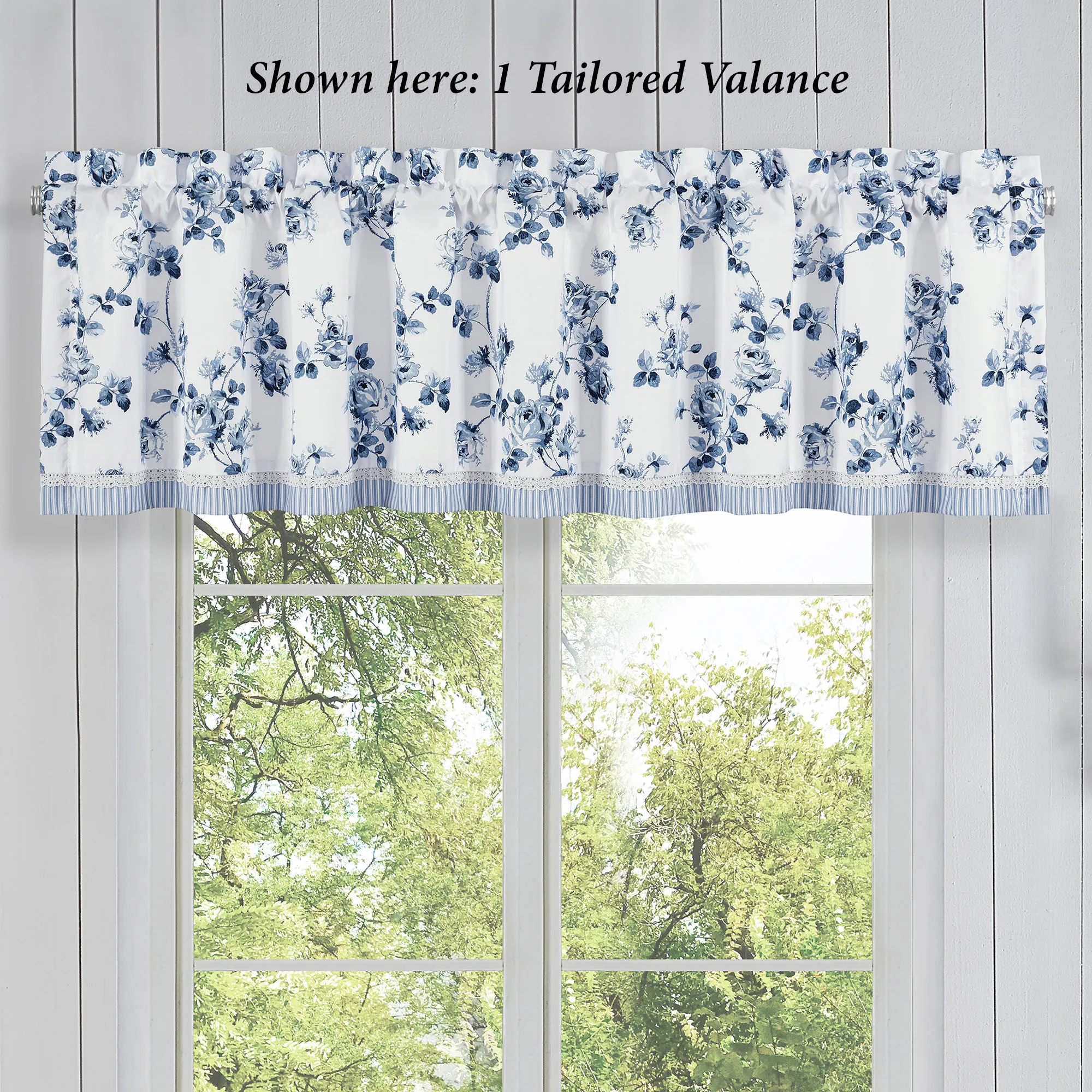 Lined Window Treatment has vining roses, tailored edges, and 3" rod pockets. Curtain Pair includes tiebacks. Valance is pieced with a ticking stripe edge with lace accenting.