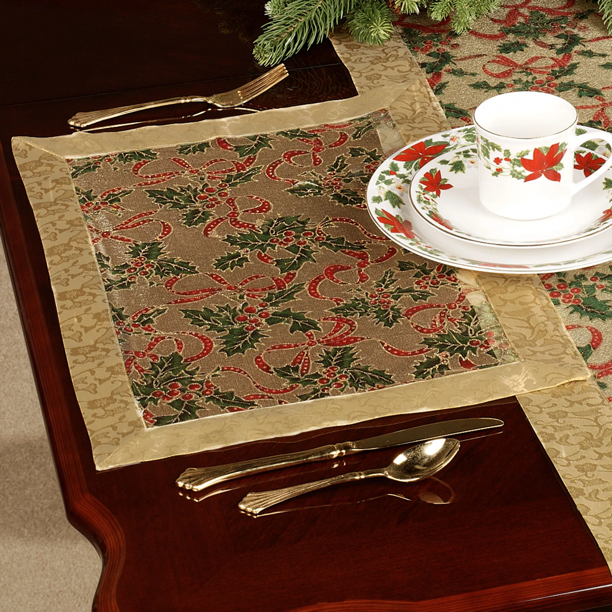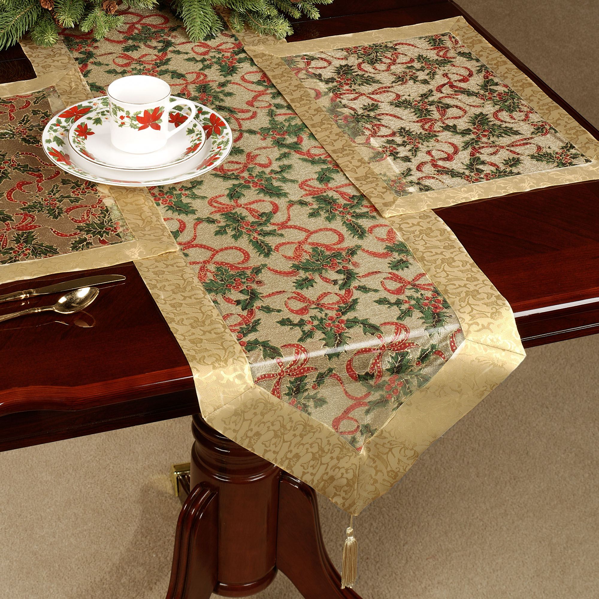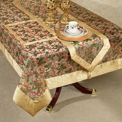 Decorate your holiday table with the festive Ribbon and Holly Table Linens. These pretty, polyester accents feature a sheer gold fabric center decorated with printed holly, berry, and red ribbon designs highlighted in glittering gold. The outer border is gold with damask designs. Specify Tablecloth, 65"W; Table Runner, 16"W; or Placemat Set of 4, 20"Wx14"L each. Runner has tasseled ends. Machine washable. Imported.