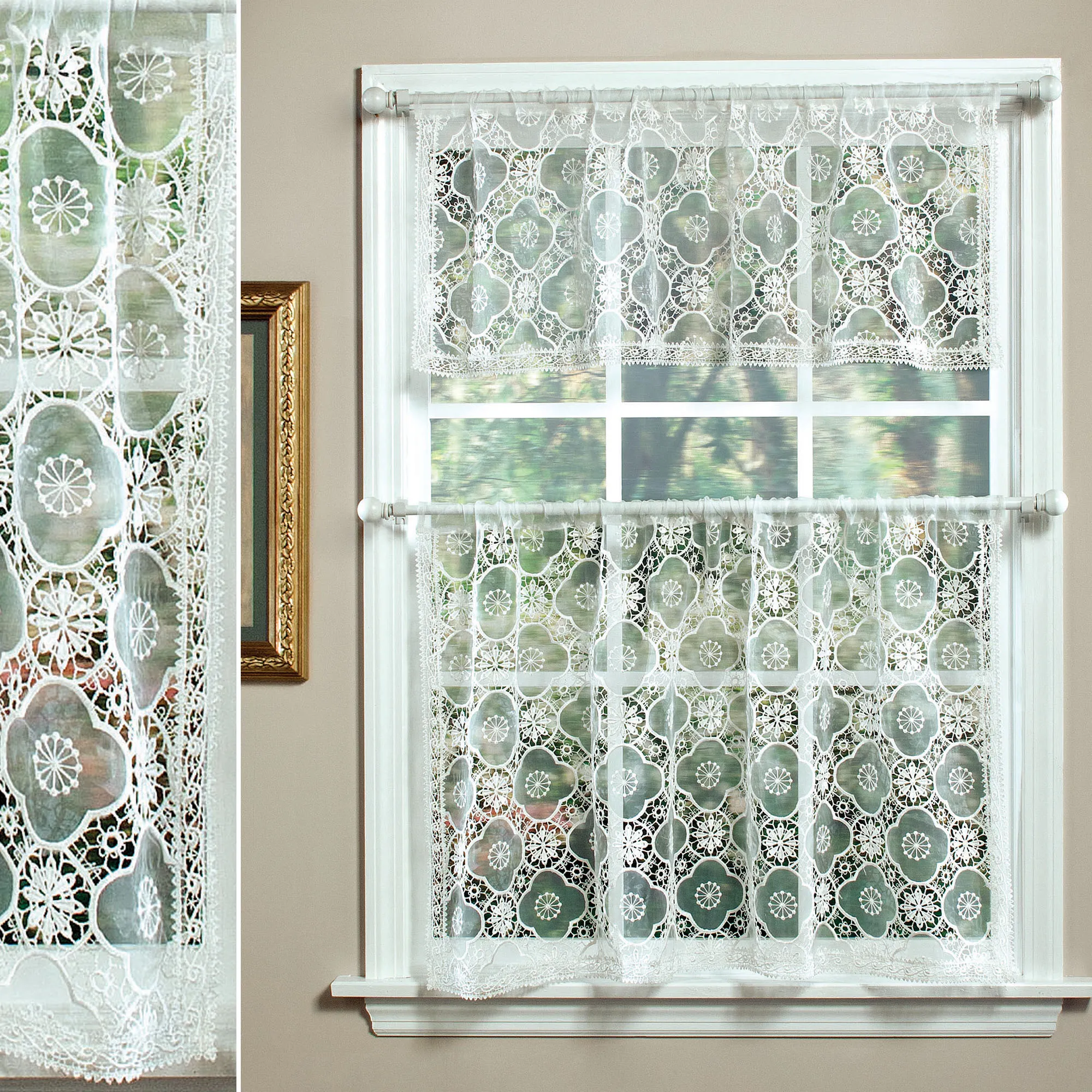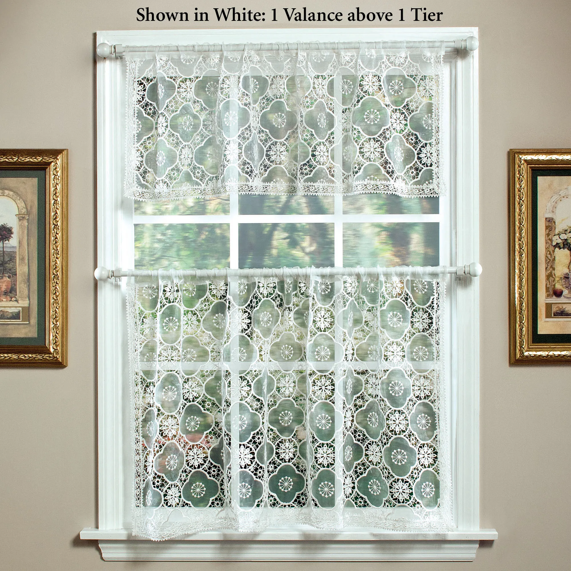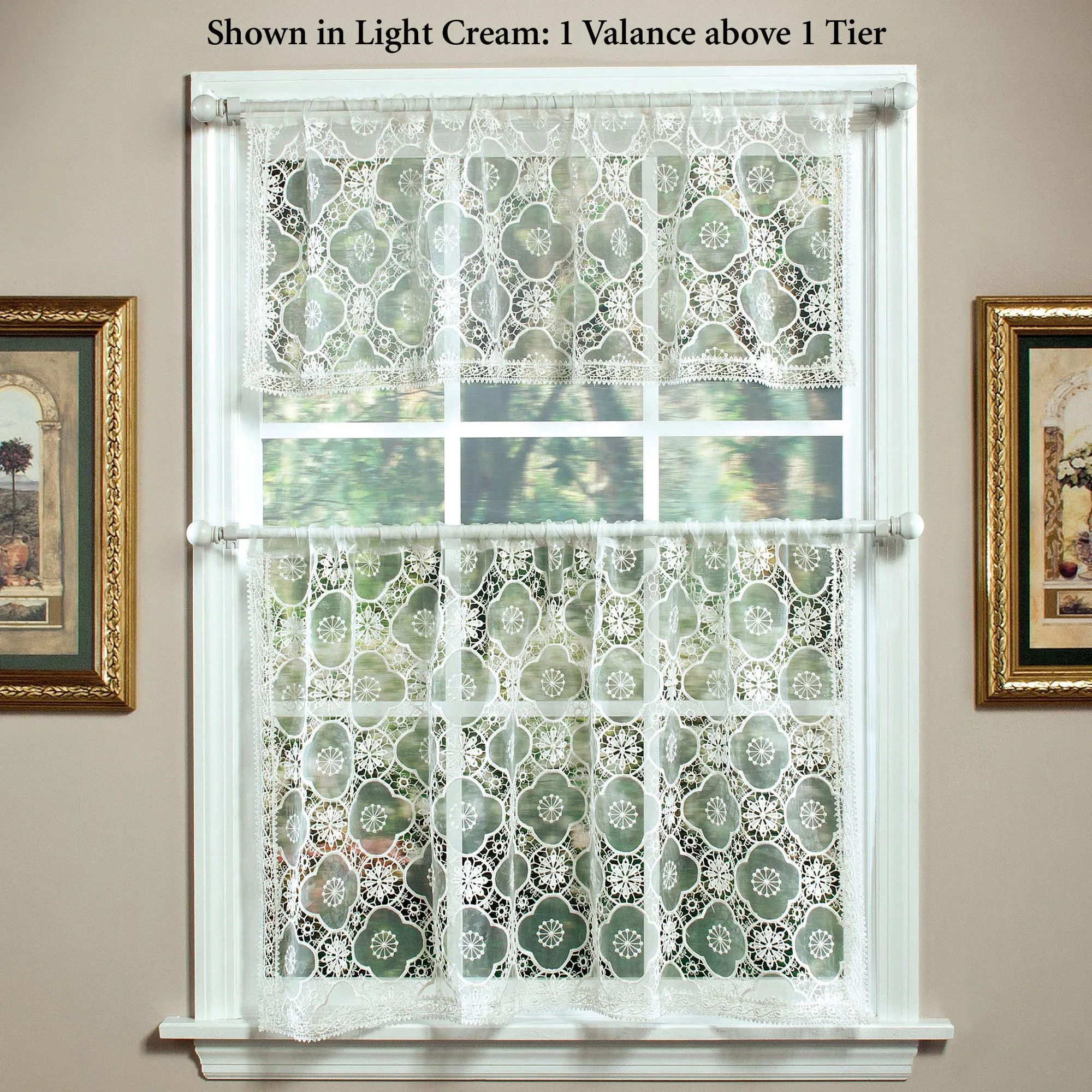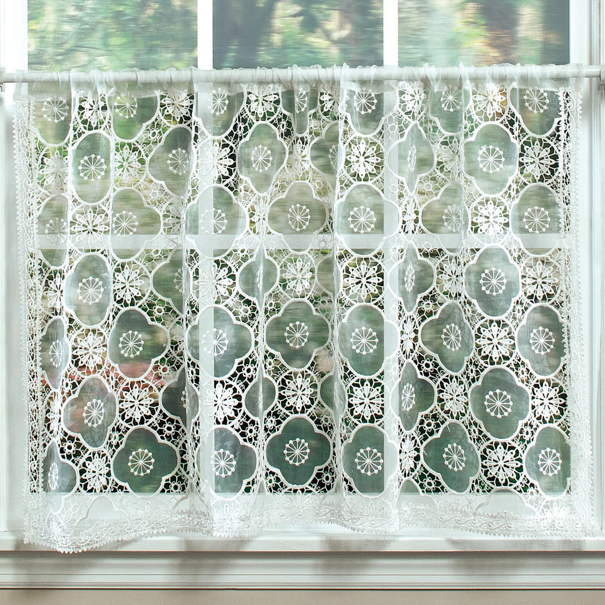 For lovely, light, and airy window decor, look no further than the tailored Richmond Macrame Lace Tier Window Treatment. These delicate macrame lace window treatments feature finely embroidered appliques of starburst and floral designs on polyester organza. Specify Tier or Valance. Tier has a 1.5" rod pocket and is 41"W. Valance has a 1.5" rod pocket and is 41"Wx14"L. Window treatment is machine washable. Imported.