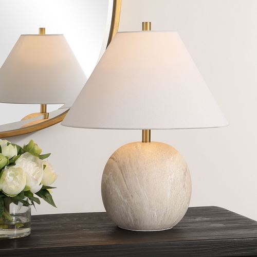 The Ridley Table Lamp looks perfect in any setting. This hand-finished ceramic accent lamp, from Uttermost, is enhanced with a unique marble design achieved through a process called water marbling. Neutral tan tones are complemented with soft gold accents. The coolie, linen fabric hardback shade is crisp white. UL listed. Requires one 60W max. bulb, not included. Due to the hand-finished nature of this item, slight variations may occur. Measures 14"dia.x17"H, including the finial.