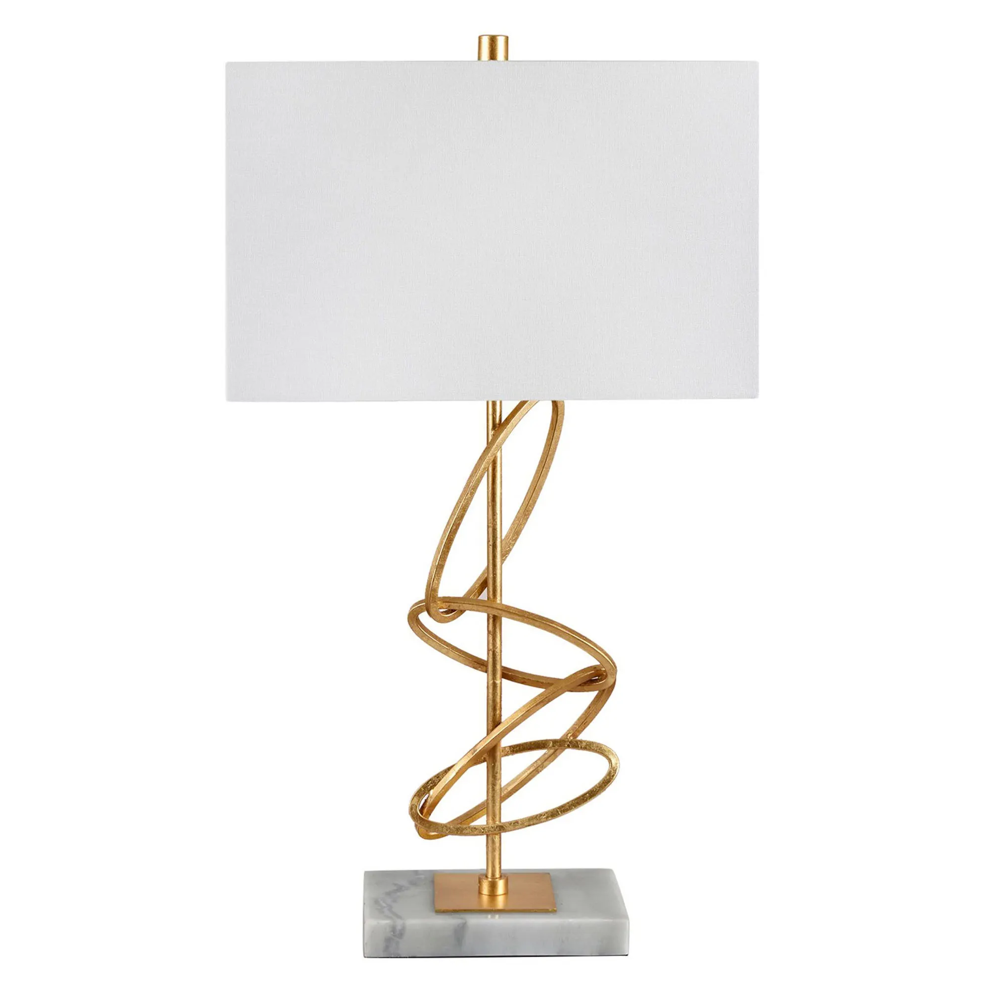 The Ringo Table Lamp offers chic modernity combined with an abstract sculptural look. Appearing suspended in midair, four interlocked rings decorate the golden gilded metal candlestick font. The gray marble rectangular base echoes the same shape as the white linen hardback lamp shade. UL listed. Requires one 150W max. 3-way bulb. Overall, the table lamp measures 16"Wx9"Dx29.5"H, including the 1.5"H cylinder finial, and weighs approx. 13 lbs.
