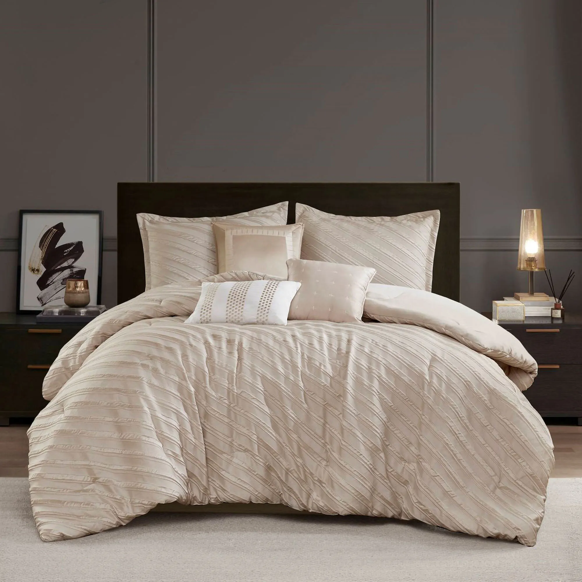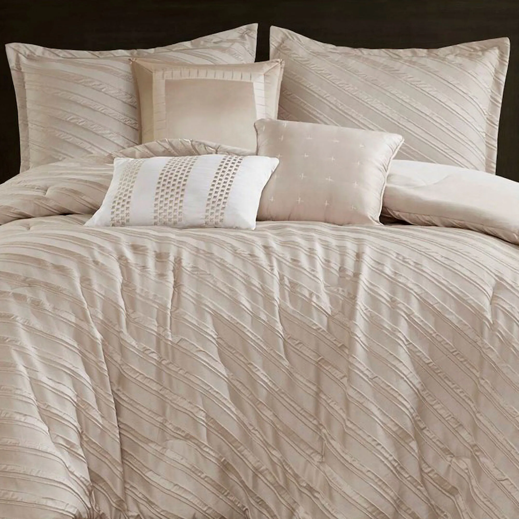 A diagonal design and a raised jacquard texture look simply elegant on the Riva Beige Bedding from Madison Park. The 7-piece Bed Set includes a comforter, 2 shams, a bedskirt, and 3 decorative pillows. The tailored, polyester comforter has a dimensional aesthetic with a luxurious luster, is lightweight and fluffy, and has a solid color backing. Click on the Details tab to read about the other items. Fill is polyester. Machine washable; spot clean the pillows. Imported.
