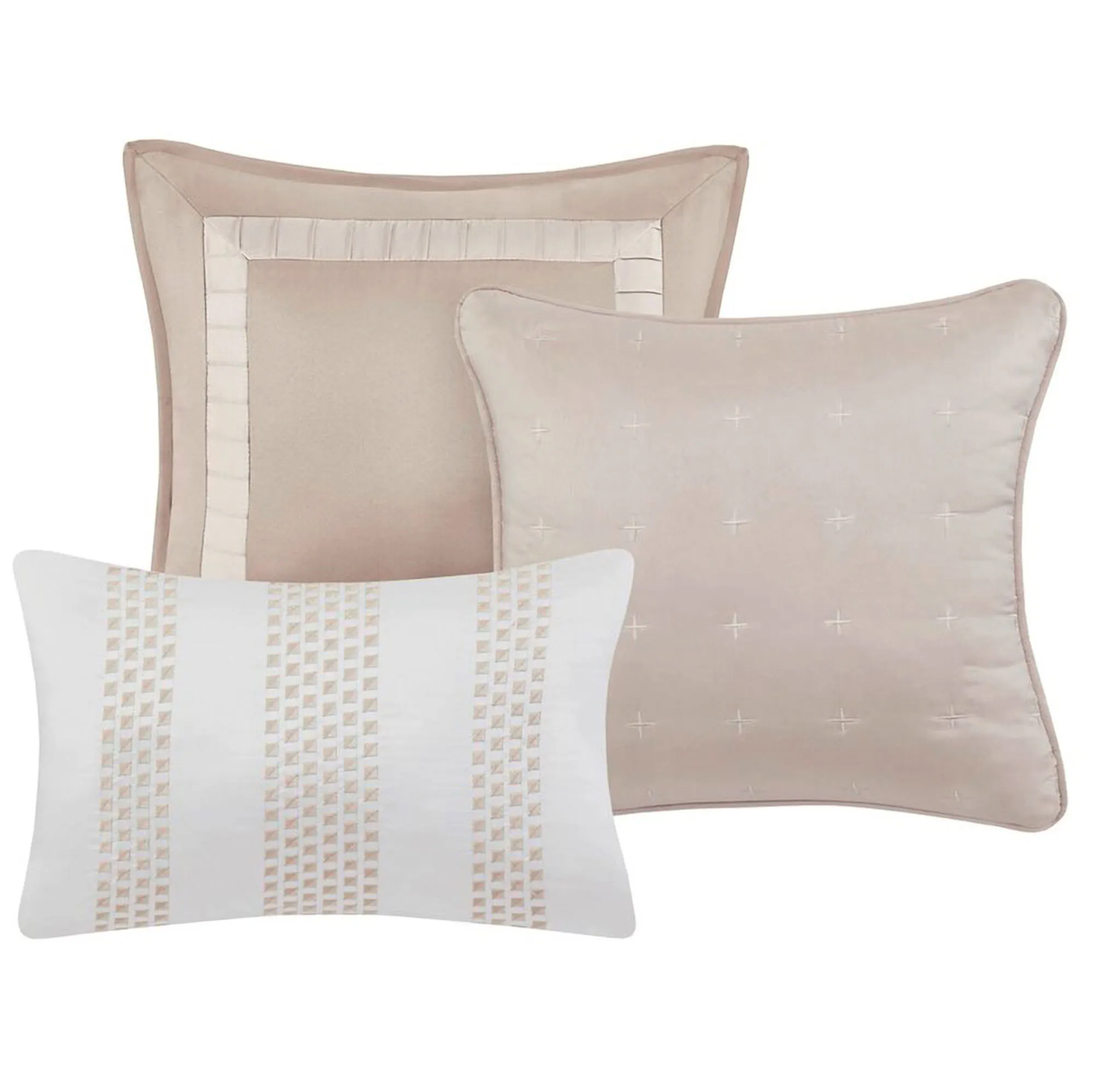 The 18" square pillow has a beige background with a soft beige pleated frame, mitred corners, and bound ends. The piped, 16" square pillow is solid beige with embroidered cross stitches. The tailored rectangle pillow is solid ivory with beige embroidered geometric designs.