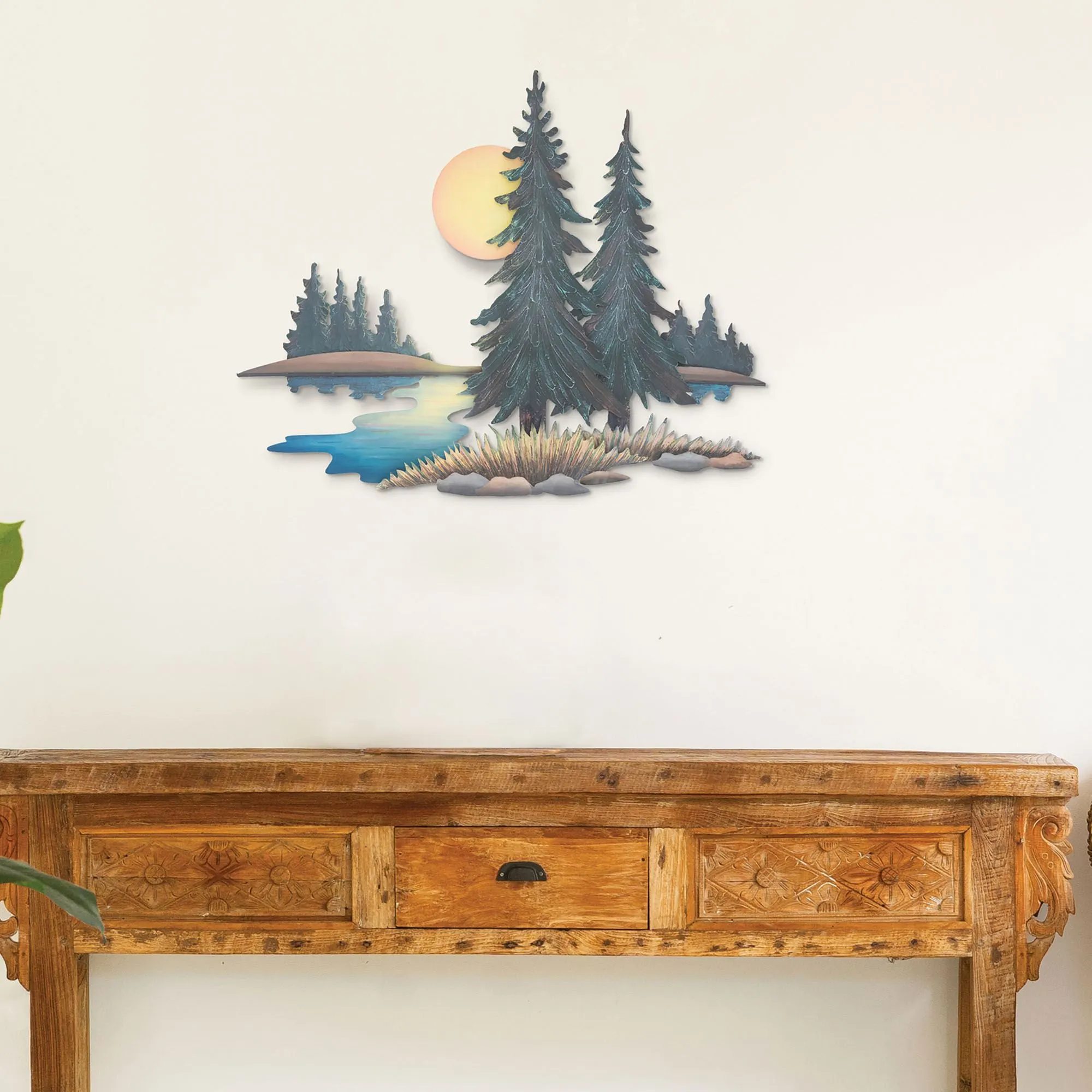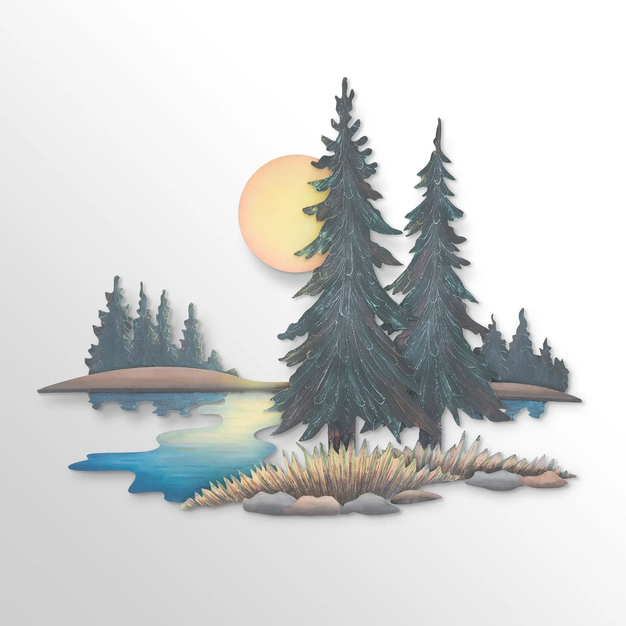 River Pines bask in the beauty of nature and the rushing water daily. Invite the same peace to your indoor space, covered porch, or enclosed patio with this wall sculpture designed by artist Joanne Ferrara. Handcrafted of metal, the handpainted wall art features the sun rising to reflect on the river water as deep green pine trees stand at shore. Measures 35"Wx3.5"Dx28"H.