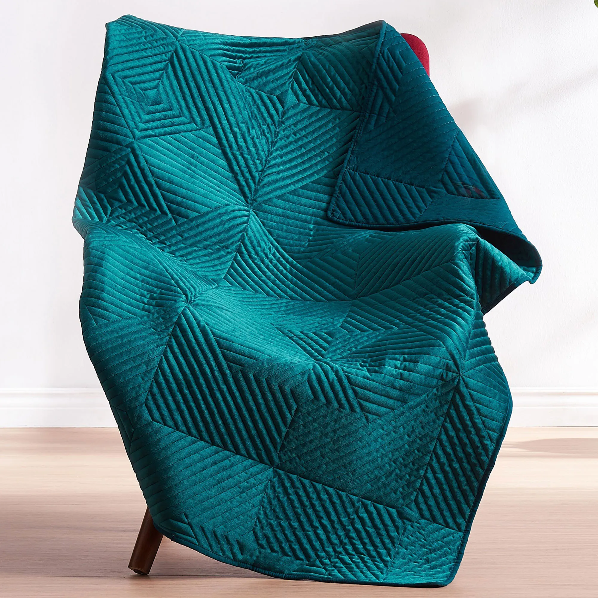 The lush and luxuriously modern Riviera Dark Teal Velvet Throw Blanket by Barefoot Bungalow adds a contemporary vibe to your space. This bright and bold polyester velvet throw is dark teal and has diamond-quilted designs. Throw has a polyester velveteen face and bound ends. Solid color backing is quilted polyester microfiber. Fill is polyester. Throw measures 50"x60". Machine washable. Imported.