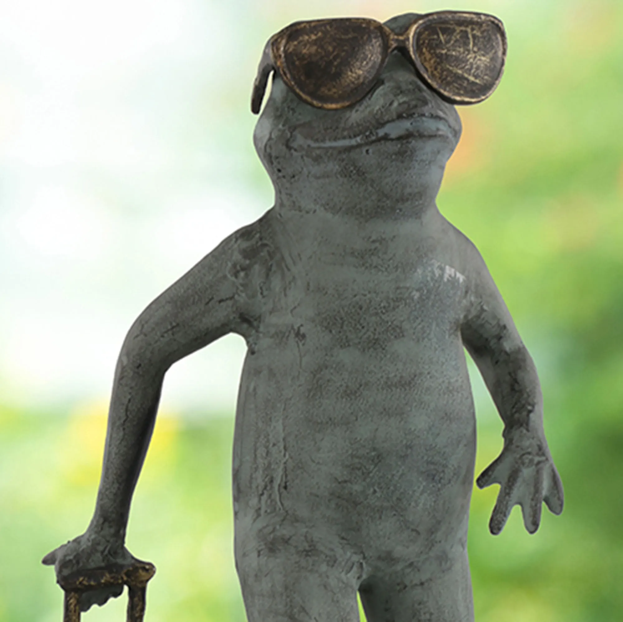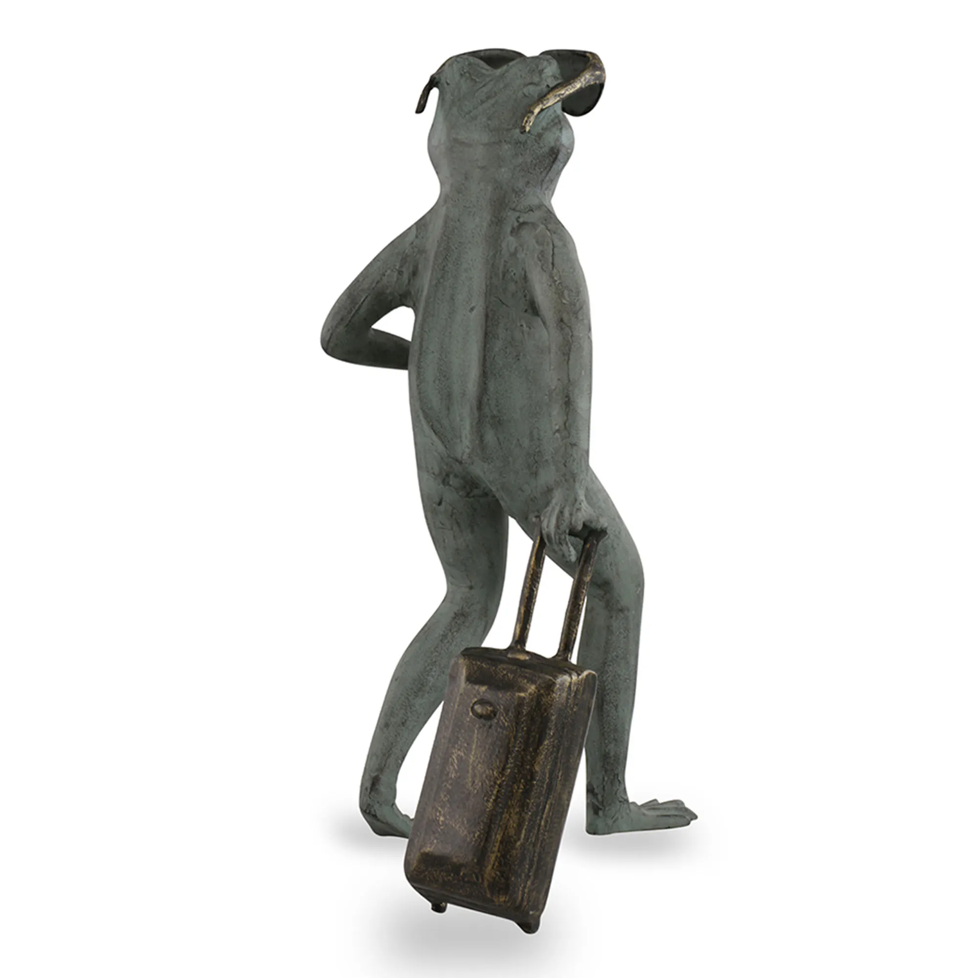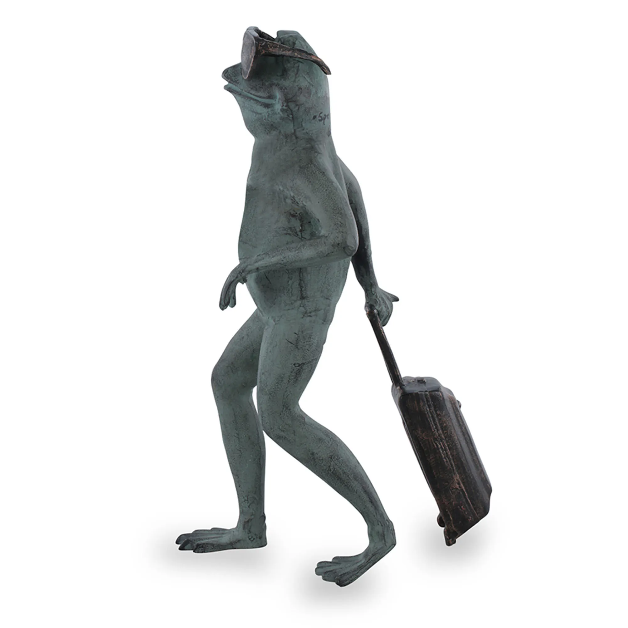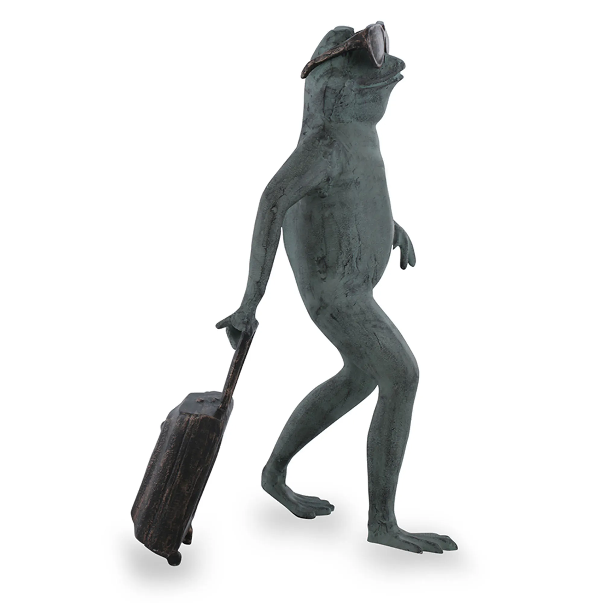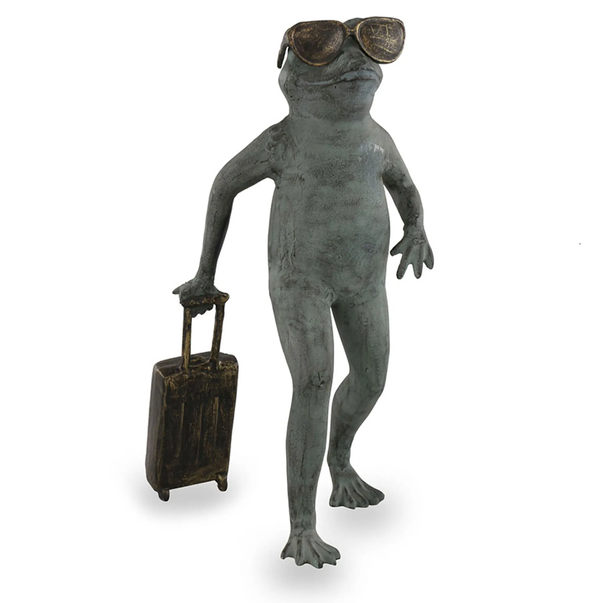 Bidding farewell to the garden, this adventurous amphibian is going on its very own Roadtrip. This adorable frog garden sculpture is made with hand-cast aluminum and is beautifully hand-finished with a gray wash. The frog is pulling a black and gold suitcase and wearing sunglasses. Outdoor year-round use. Measures 11"Wx10"Dx21"H.