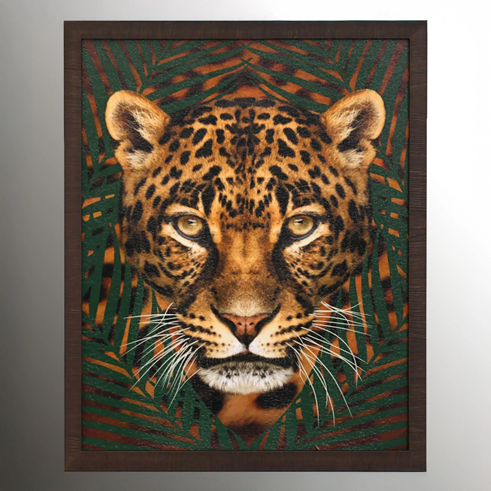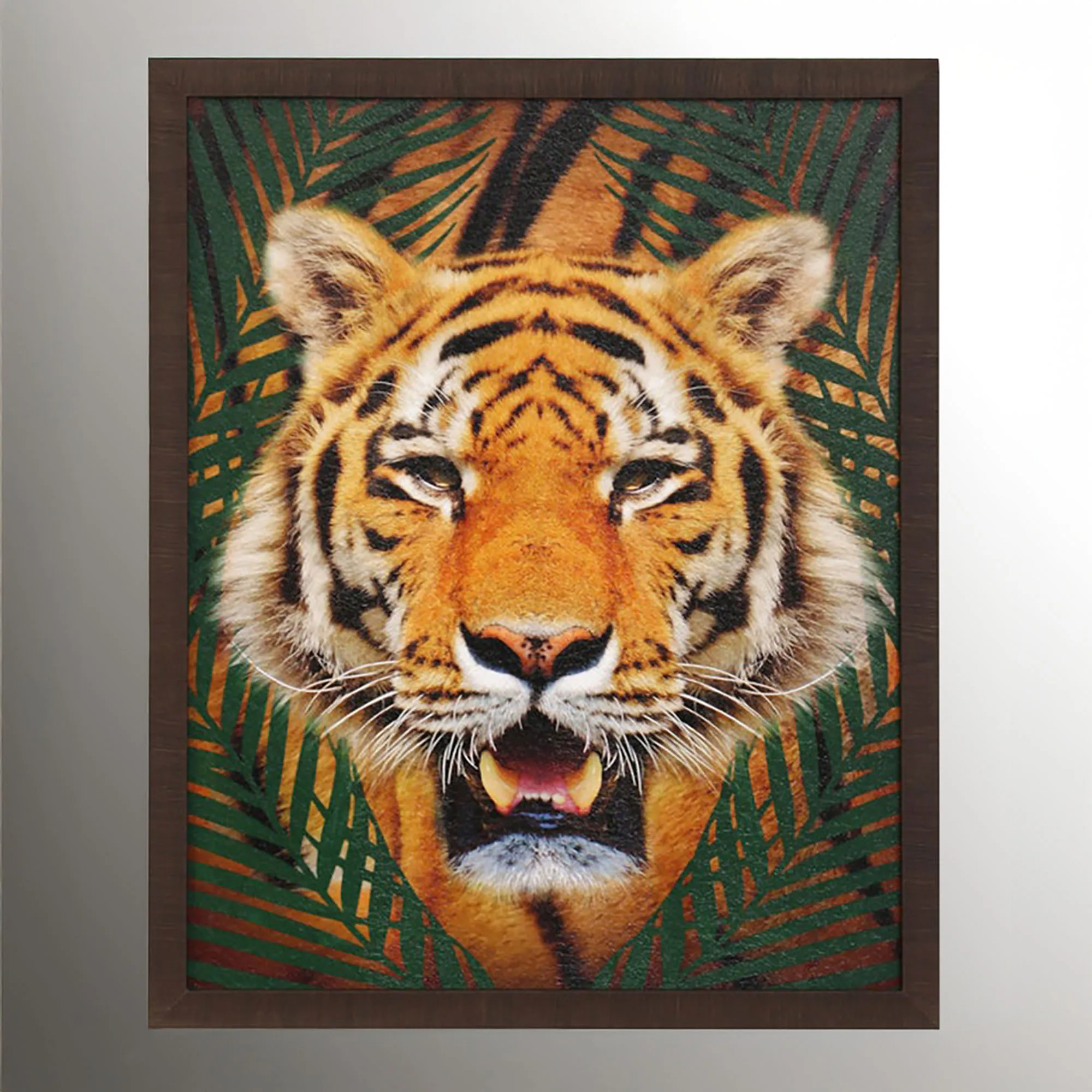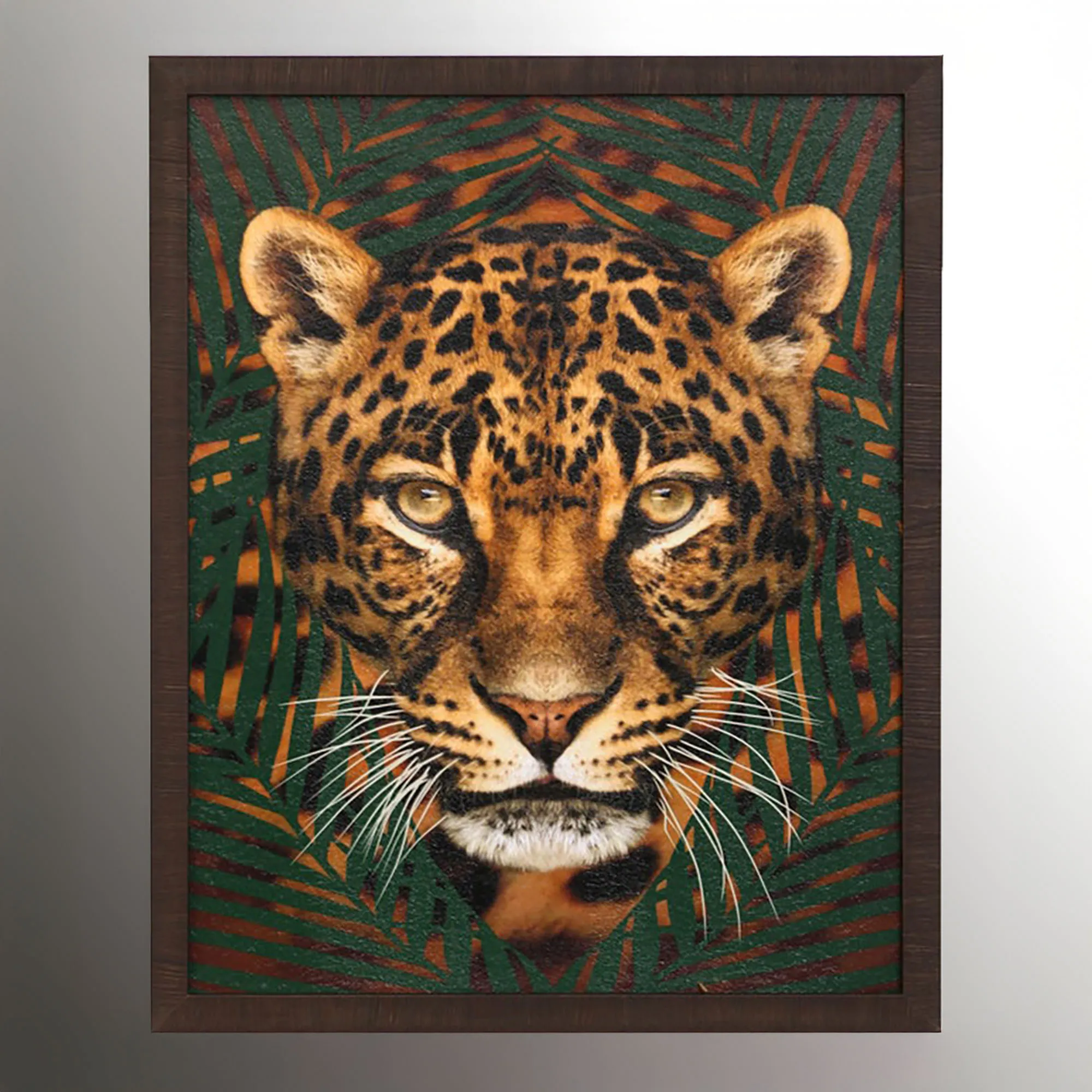 Dark green tropical palm grasses try to hide the fierceness of these big cats Roaming Wild. This wall art features exotic cat prints on paper in their natural colors surrounded by distressed, dark brown polystyrene frames. Sold individually, each measures 24"Wx1.5"Dx30"H.