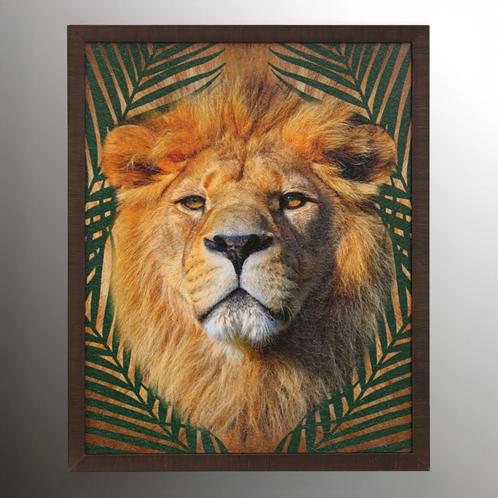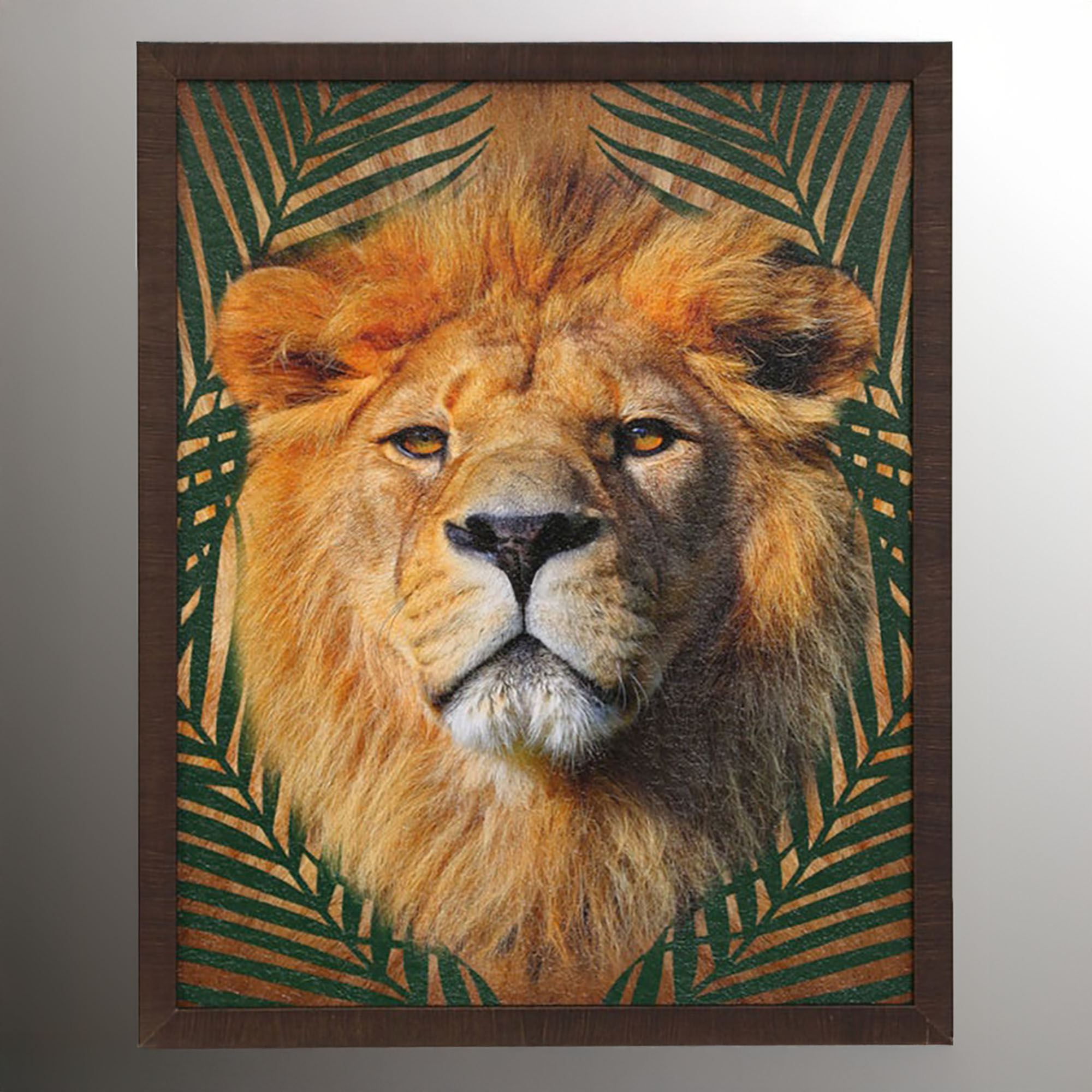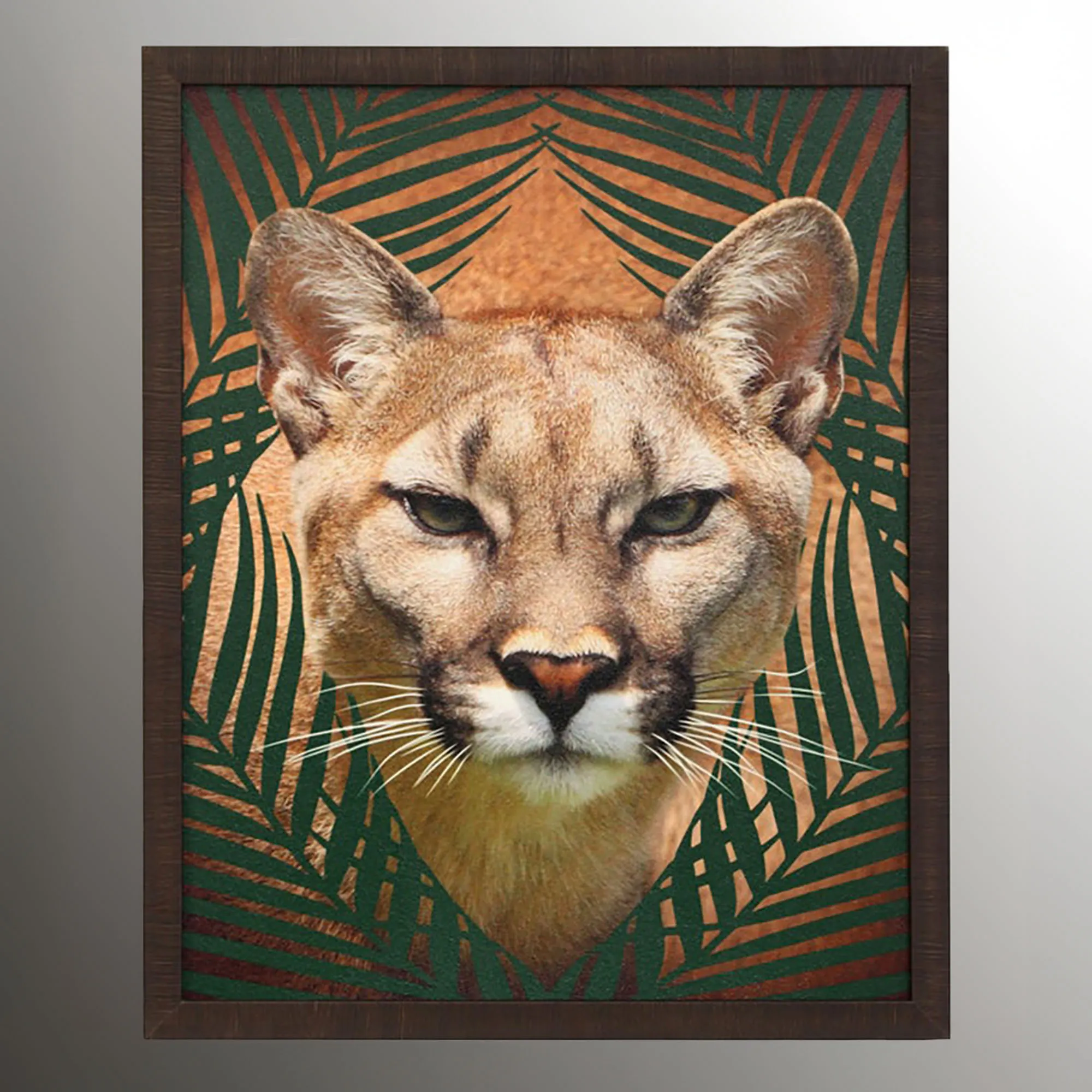 Dark green tropical palm grasses try to hide the fierceness of these big cats Roaming Wild. This wall art features exotic cat prints on paper in their natural colors surrounded by distressed, dark brown polystyrene frames. Sold individually, each measures 24"Wx1.5"Dx30"H.