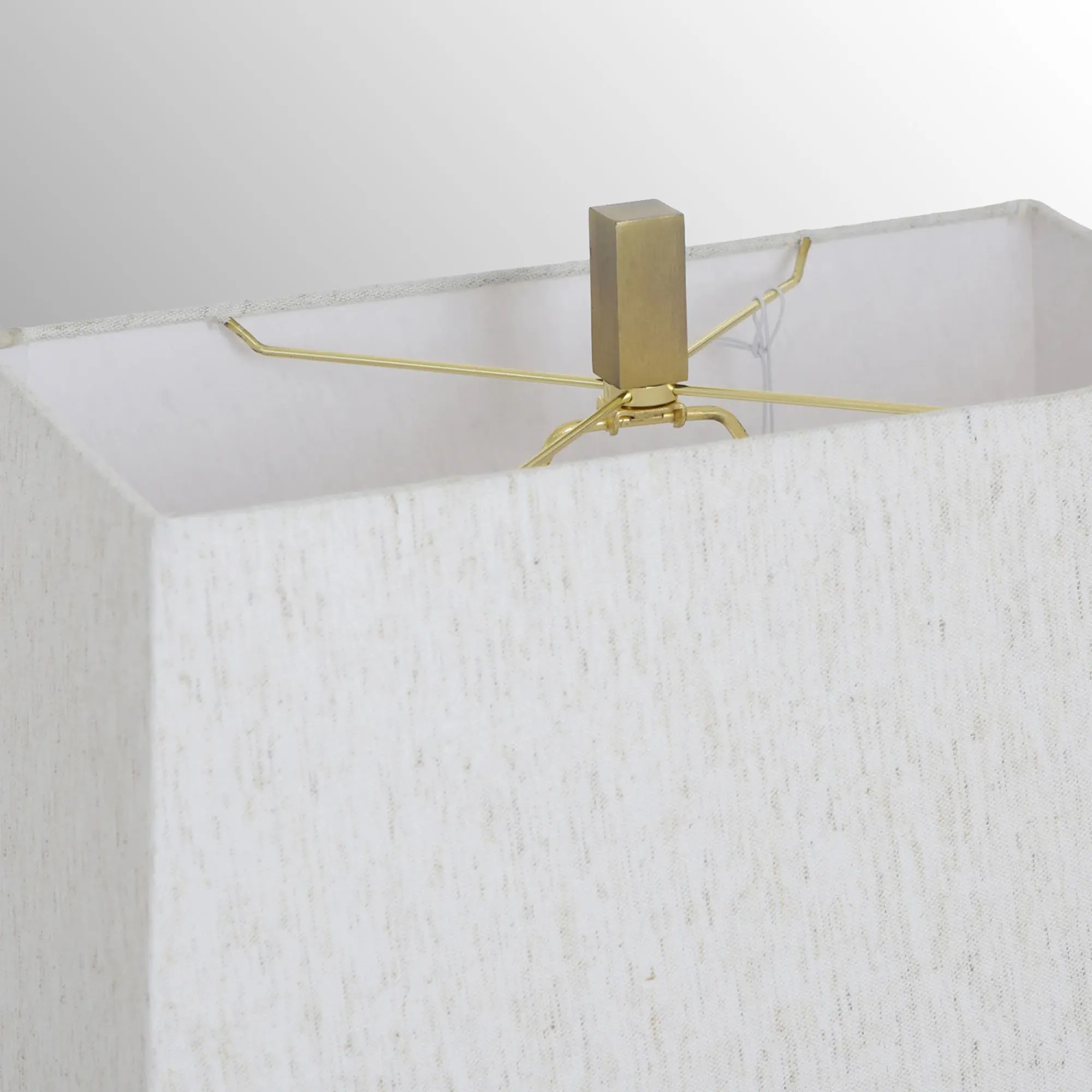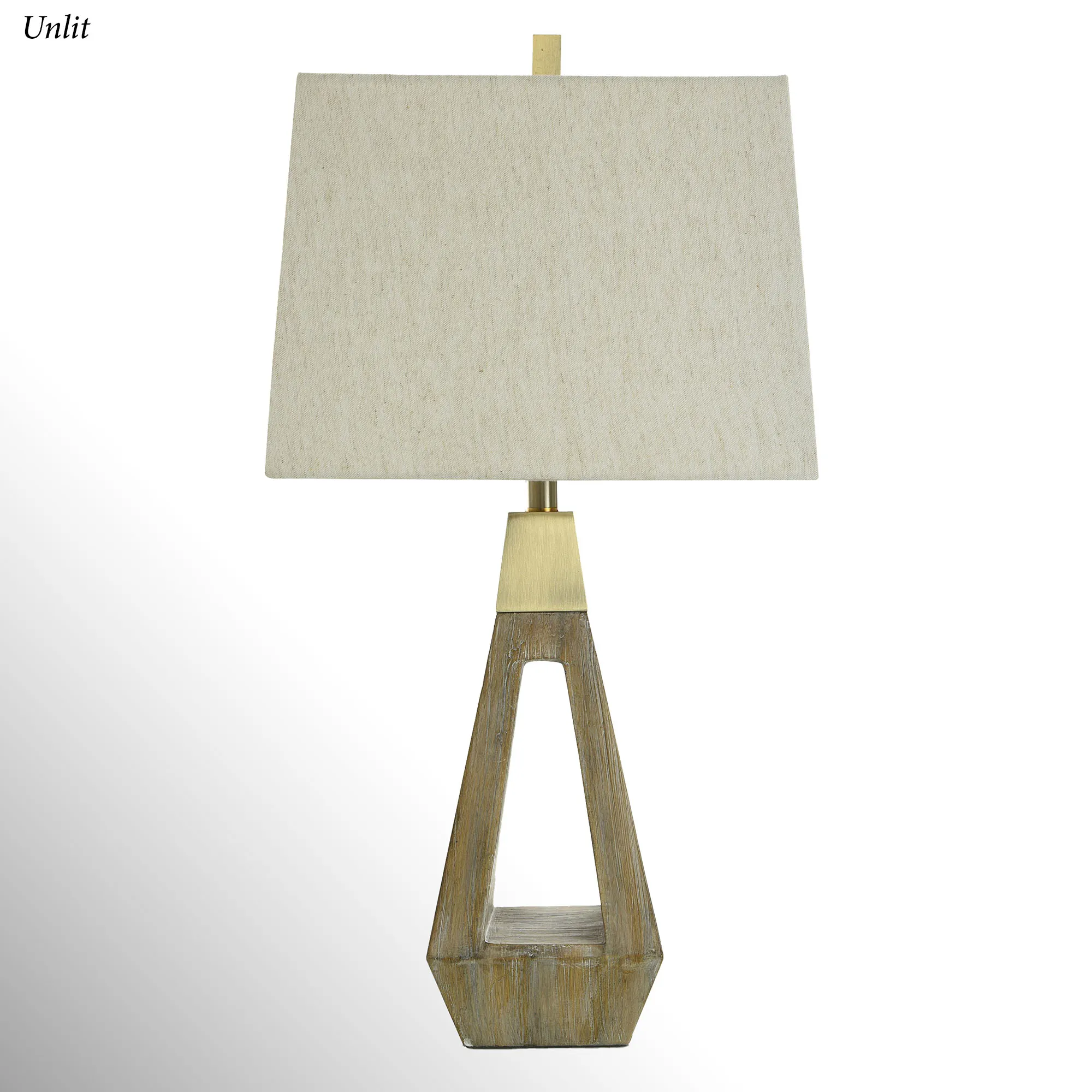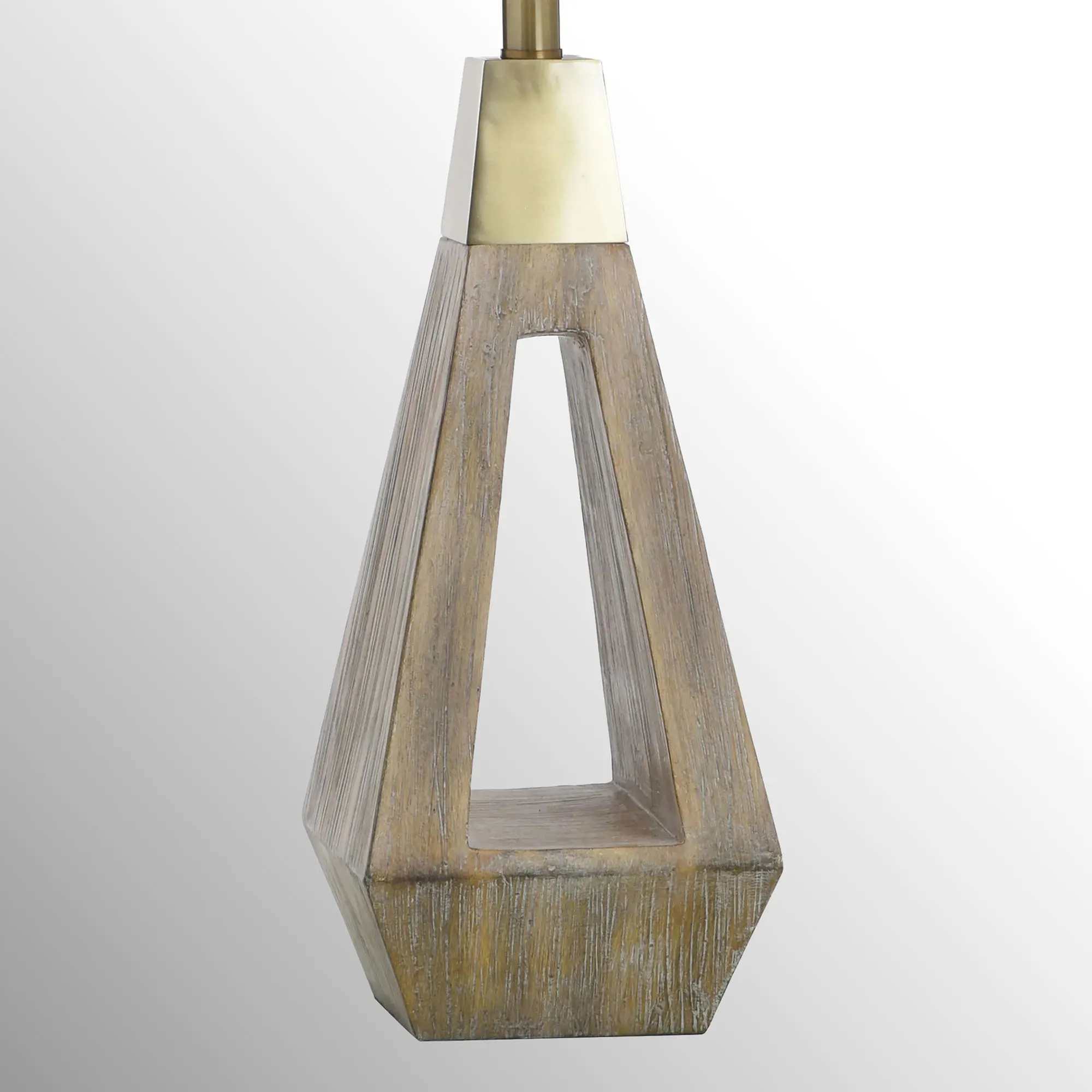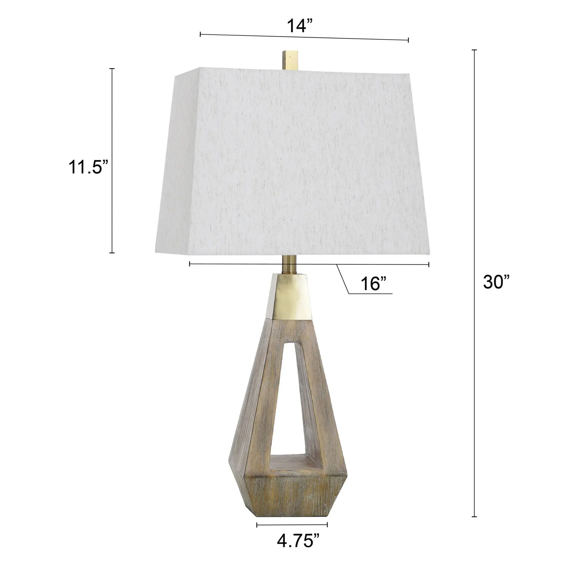 The Roanoke Table Lamp shines with a charming prismatic allure. Accented with golden metal, the polyresin design features an openwork, unique shape finished in a brushed light brown faux wood hue. A neutral woven square shade matches the look beneath the 2"H rectangle finial. UL listed. Requires one 100W max. bulb. Overall, the table lamp measures 16"sq.x30"H.