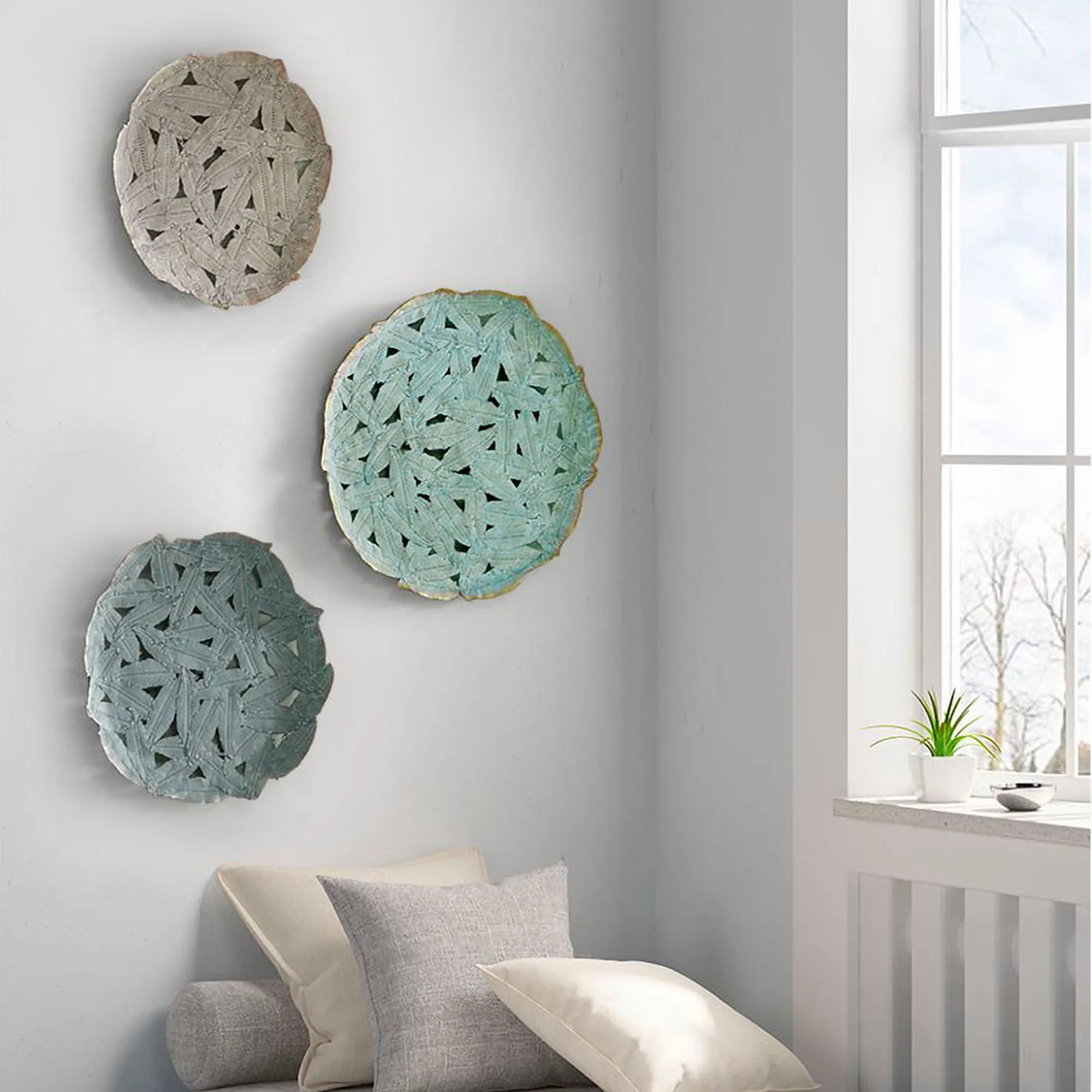 The openwork layered feather arrangements on the Robin Wall Art Set have a delicate allure with modern beauty. Made of metal, this round wall art has openwork designs and looks perfect displayed together or separately. Gray includes three different shades of gray. Blue-Green includes shades of blue-green, gray, and light gray. Sienna Brown includes sienna brown, clay, and tan. Large is 20" dia.; medium is 17.5" dia.; and small is 14.5" dia.