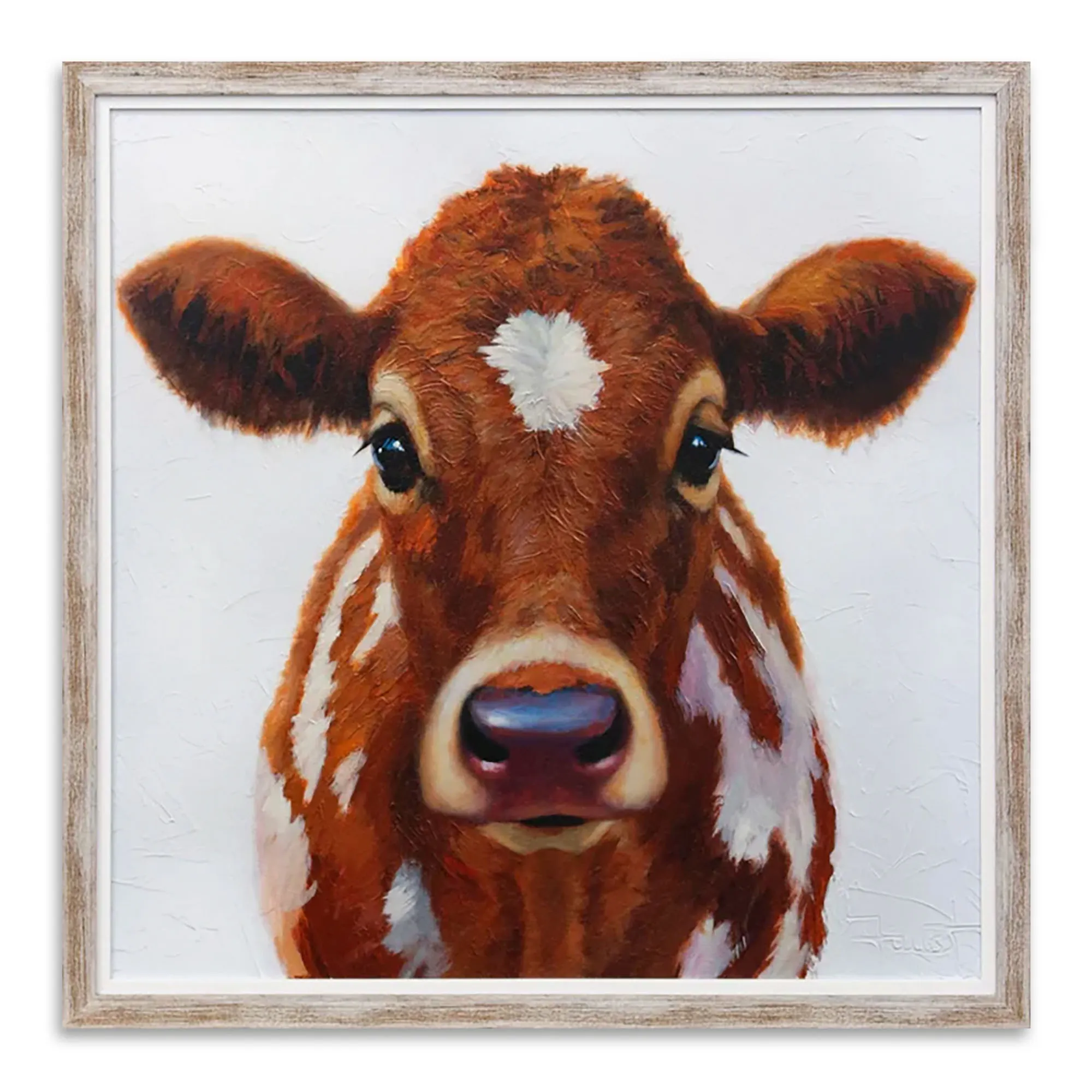 No one can resist the sweet eyes of the Rocky Road Cow. Complete with a whitewashed faux wood and white polystyrene frame, the paper print wall art features a brown cow with white spots and tan accents on a textured off-white background. Proudly made in the USA, the framed cow wall art measures 34" sq.