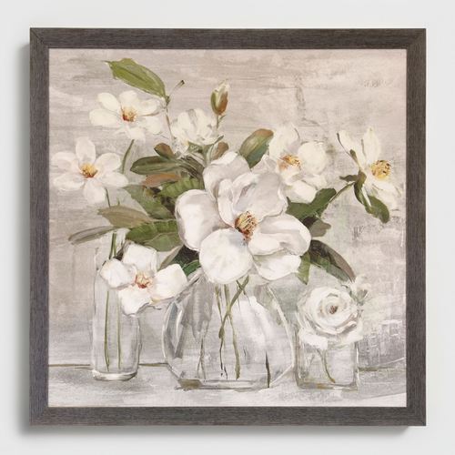Romantic Magnolias display sweetness. This textured paper print wall art has gel embellishments and features white flowers in vases on a brushstroke-style gray background. The outer polystyrene frame has a gray faux wood finish. Measures 32"sq.x2"D.