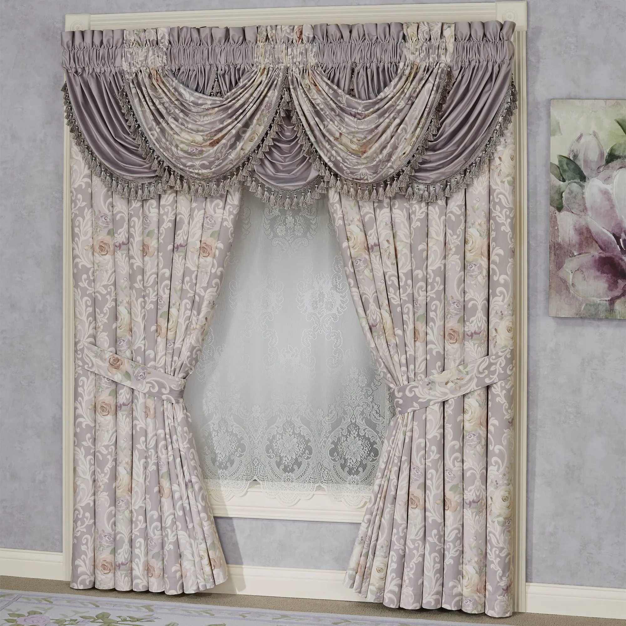 Adorn your room with the breathtaking beauty of the Romantica Window Treatment. The splendid, wisteria polyester velvet window treatment has 3" rod pockets. The floral valance and curtains feature elegant printed rose damask with scrollwork borders; all in shades of pale blush, lavender, vanilla, soft green, and ivory. Specify Waterfall Valance or Wide Curtain Pair. Each Waterfall Valance has tassel trim; choose Floral or Solid Velvet. We recommend one waterfall valance for every 12"-15" of window width. The lined Wide Curtain Pair has tailored edges. Reversible tiebacks are included. Dry clean only. Imported. The curtain pair width is the total width of two panels together.