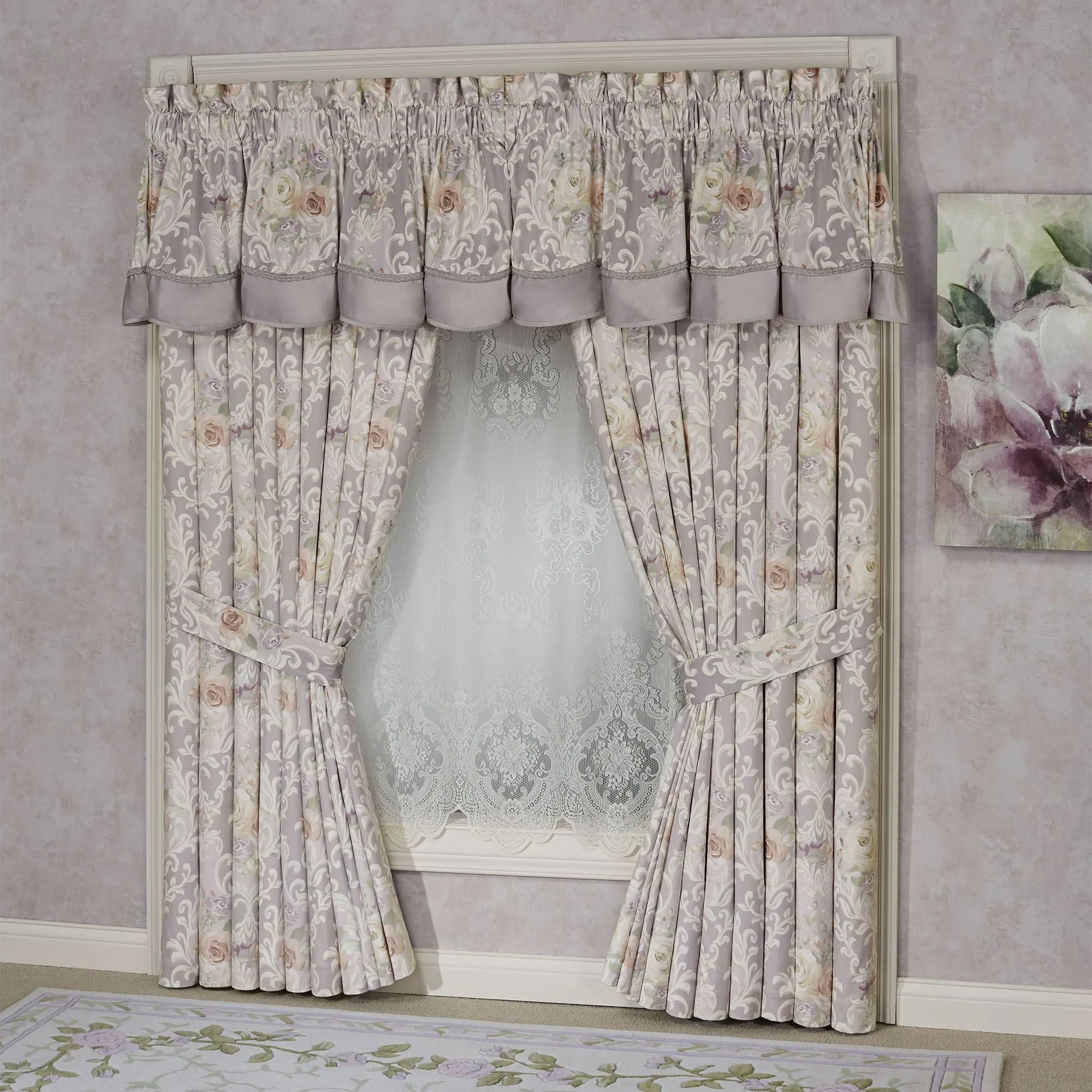 Adorn your room with the breathtaking beauty of the Romantica Floral Window Treatment. The splendid, wisteria polyester velvet window treatment features elegant printed rose damask with scrollwork borders; all in shades of pale blush, lavender, vanilla, soft green, and ivory. Window treatment has 3" rod pockets. Specify Scalloped Valance or Wide Curtain Pair. The pieced Scalloped Valance has a floral top, solid velvet bottom, and gimp trim. The lined Wide Curtain Pair has tailored edges. Reversible tiebacks are included. Dry clean only. Imported. The curtain pair width is the total width of two panels together.