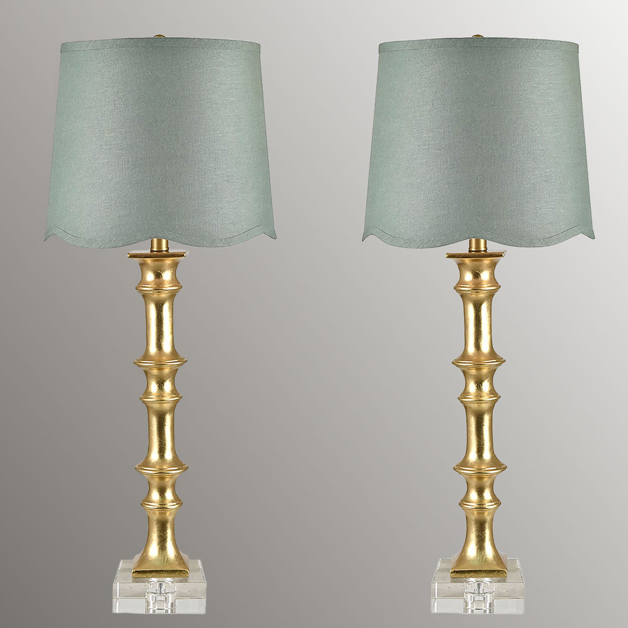 A delicate charm and a unique versatile style detail the Romy Table Lamp Pair. Perfect for traditional, eclectic, and contemporary tastes, the lamps feature clear crystal square bases topped with radiant gold-finished stacked, curved resin shapes that resemble a unique column or bamboo. A softly scalloped bottom edge finishes each solid color tapered drum lamp shade. UL listed. Each lamp requires one 3-way 150W max. bulb and measures 11.5"dia.x32"H, including the .75"H gold finial. Pair weighs approx. 16 lbs.