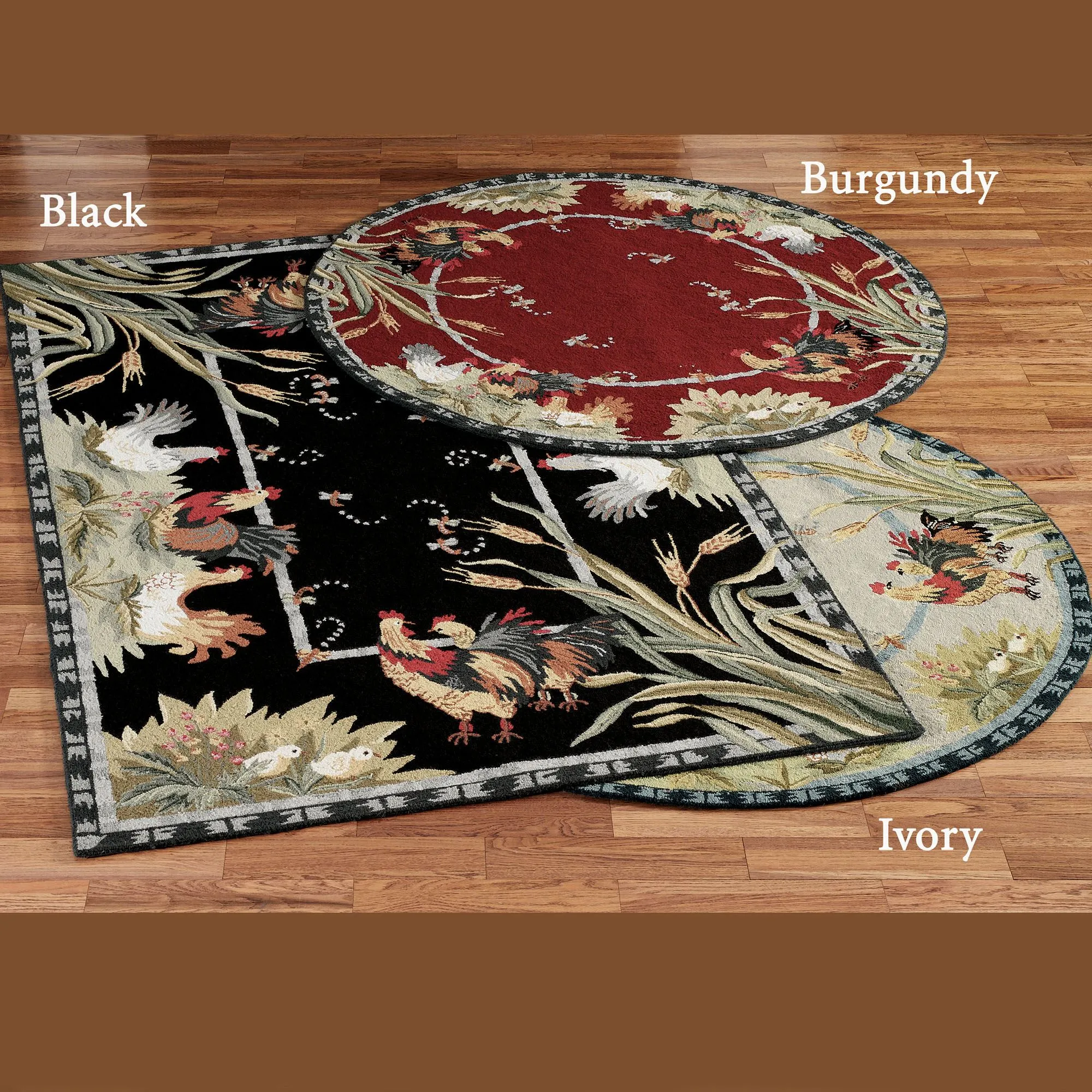 Rooster and Hens Rugs are wool with cloth-covered latex backing. Imported.
