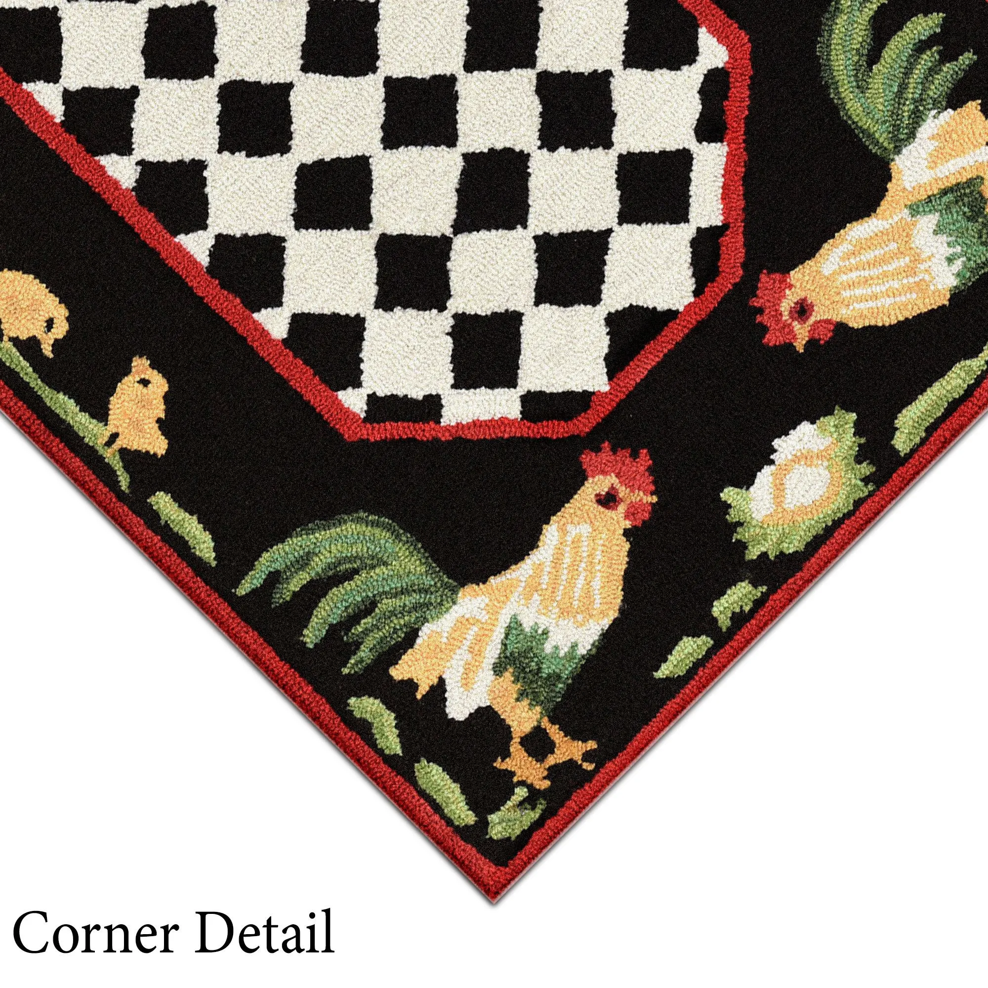 An aspect of country life is uniquely displayed on the Roosters Black Indoor/Outdoor Mat. This hand-tufted, polyester/acrylic mat, .375" thick, by Liora Manne, features a check pattern, roosters, eggs, and chicks. Colors include straw, green, off-white, black, and apple red. Back is polyester. May be used indoors or outdoors seasonally; do not expose this mat to freezing temperatures. Spot clean and rinse with a garden hose; for stubborn stains, we recommend professional cleaning by a rug cleaner. Imported.