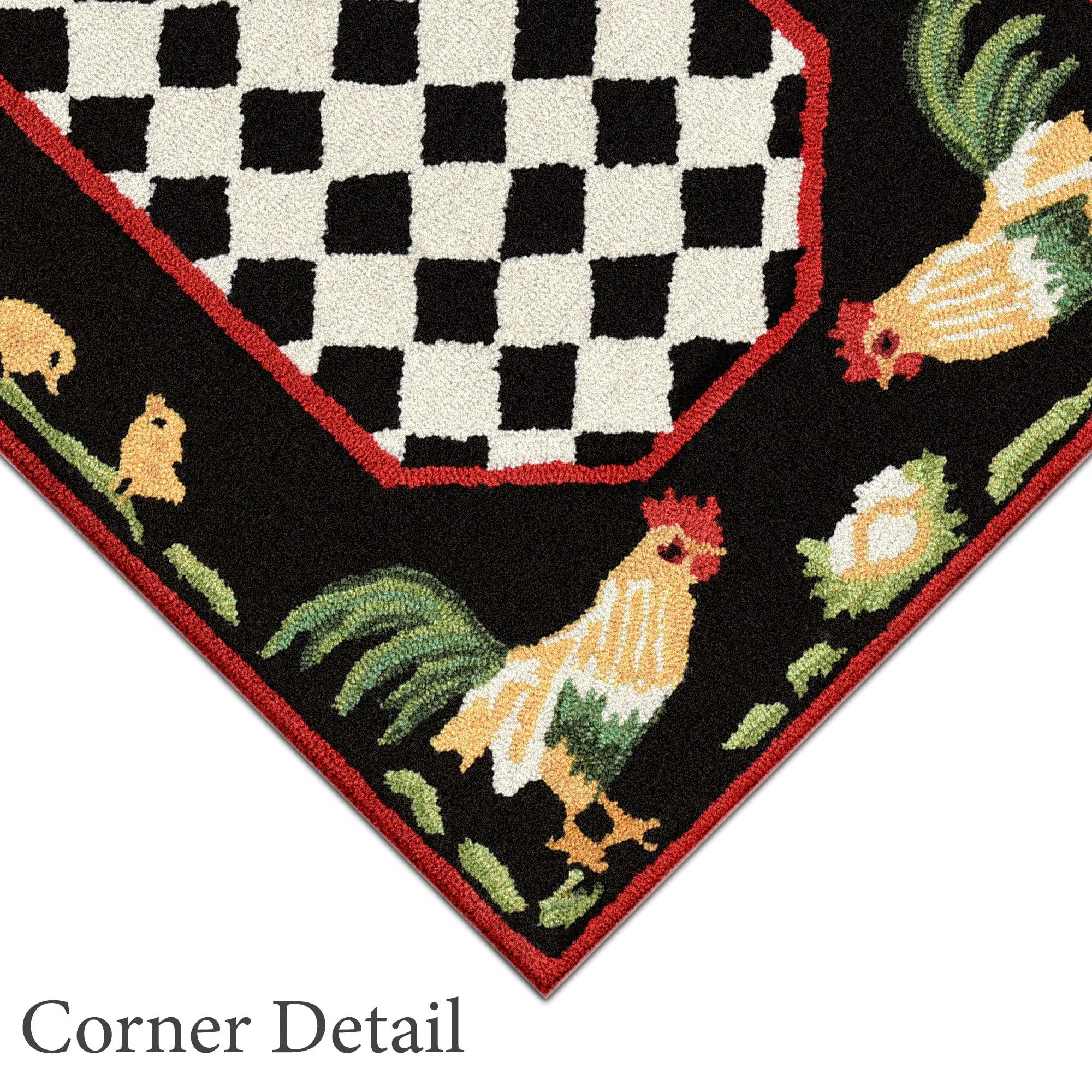 An aspect of country life is uniquely displayed on the Roosters Black Indoor/Outdoor Rug. This hand-tufted, polyester/acrylic area rug, .375" thick, by Liora Manne, features a check pattern, roosters, eggs, and chicks. Colors include straw, green, off-white, black, and apple red. Back is polyester. May be used indoors or outdoors seasonally; do not expose this rug to freezing temperatures. Spot clean and rinse with a garden hose; for stubborn stains, we recommend professional cleaning by a rug cleaner. Imported.