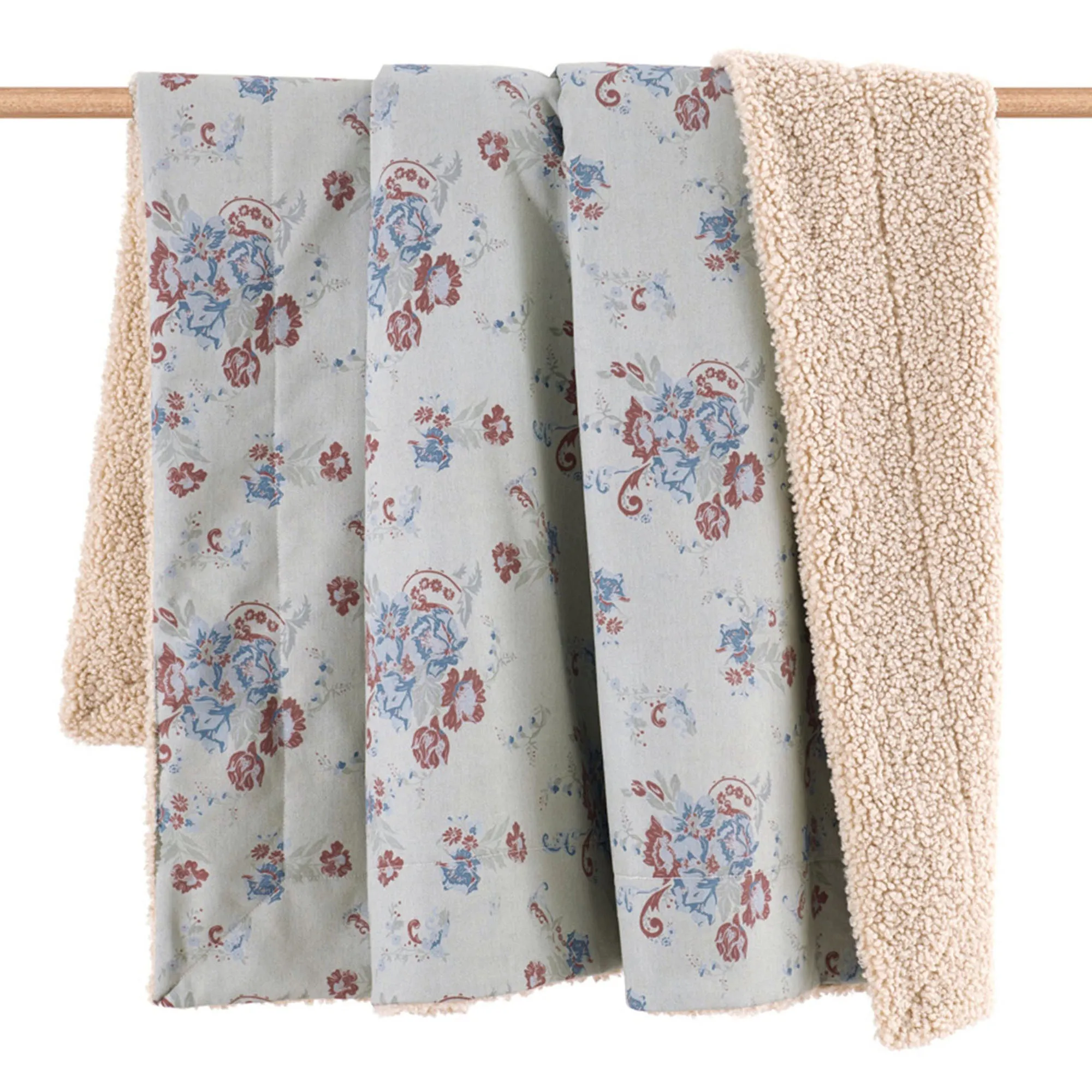 Western-inspired floral bouquets bloom with Americana spirit upon the Rosabel Throw Blanket. By Tasha Polizzi for Paseo Road, the printed throw features stylized blue, dark red, and sage flower bouquets and sprigs on a woven cotton/polyester-blend ground the color of your favorite well-loved pale denim jeans. The floral throw blanket has tailored edges and is backed in oyster-colored plush polyester teddy fabric. Measures 50"x60". Fill is polyester. Machine washable. Imported.