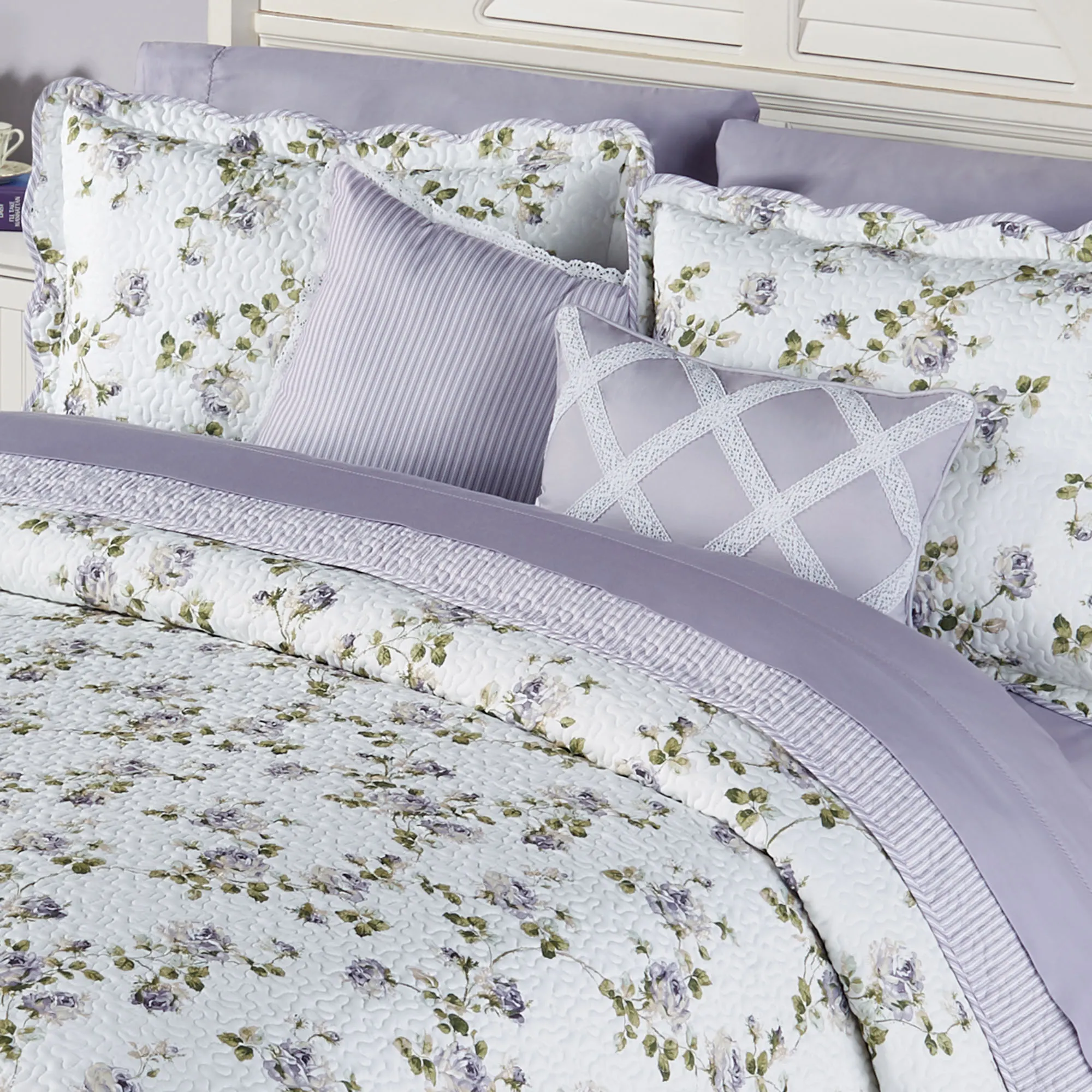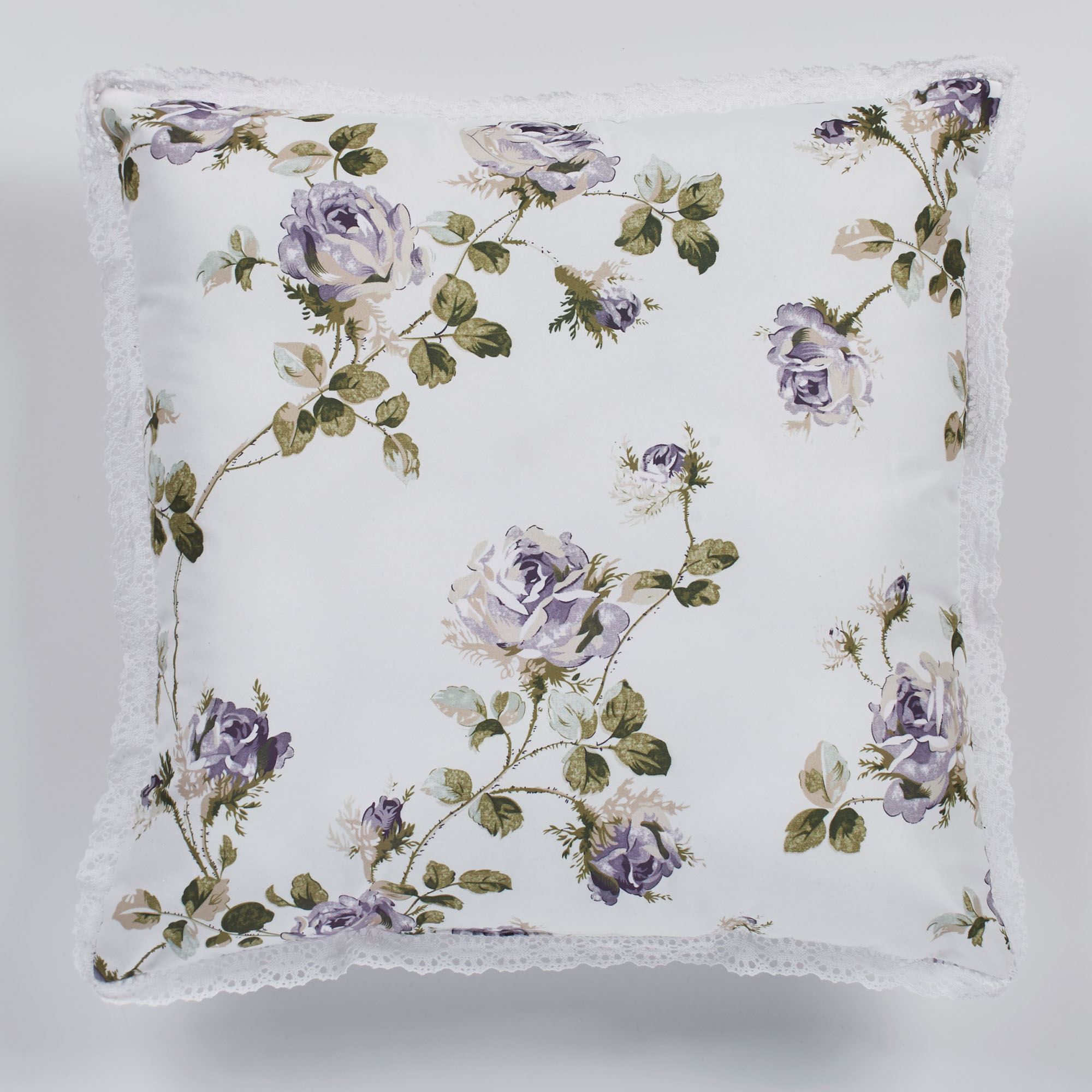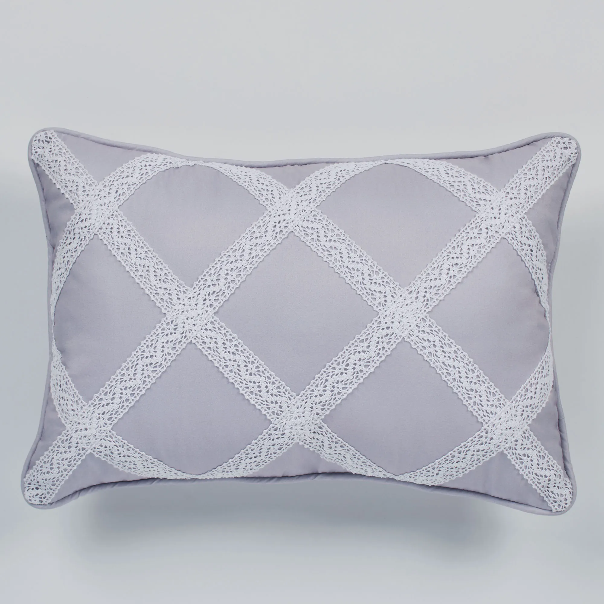 Charm your decor with the Rosalyn Decorative Pillows. These cottage-inspired accent pillows are polyester. The piped Rectangle Pillow, 13"x19", is solid wisteria with latticework crochet lace. The Square Pillow, 16", has a printed rose motif in wisteria and sage on a light almond background, as well as crochet lace trim; reversible to stripes. Fill is polyester. Spot clean. Imported.